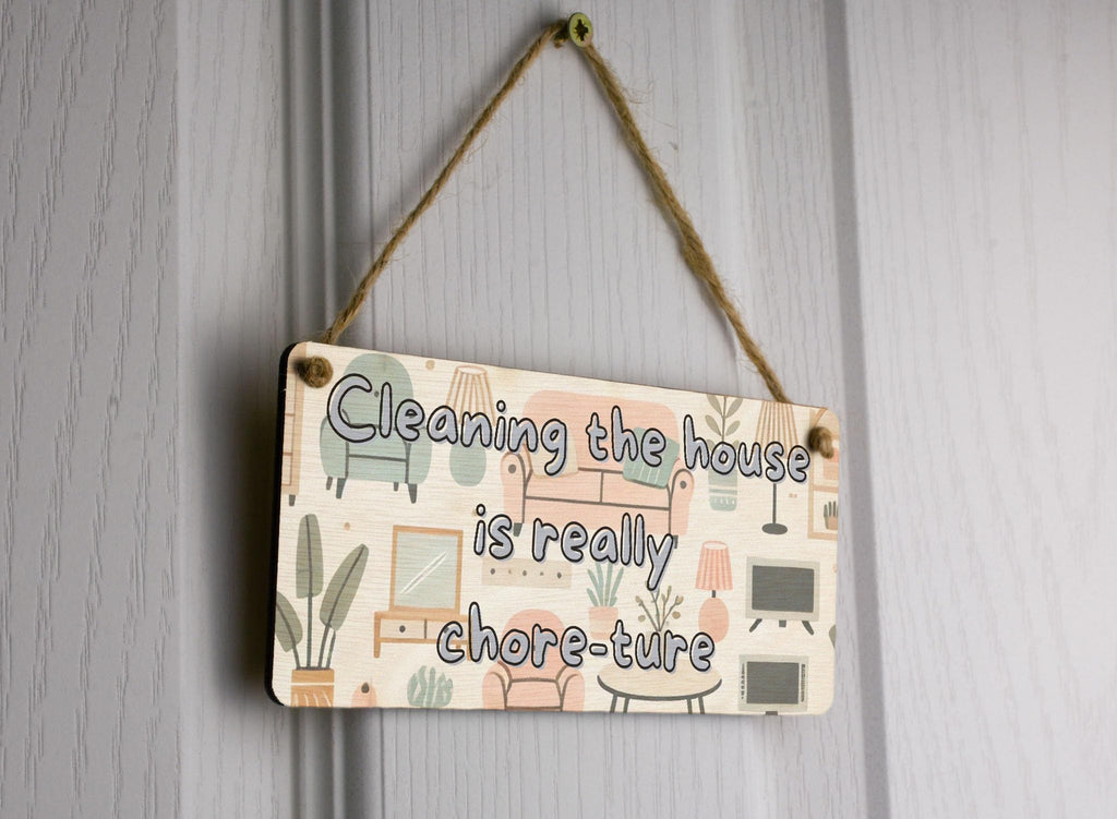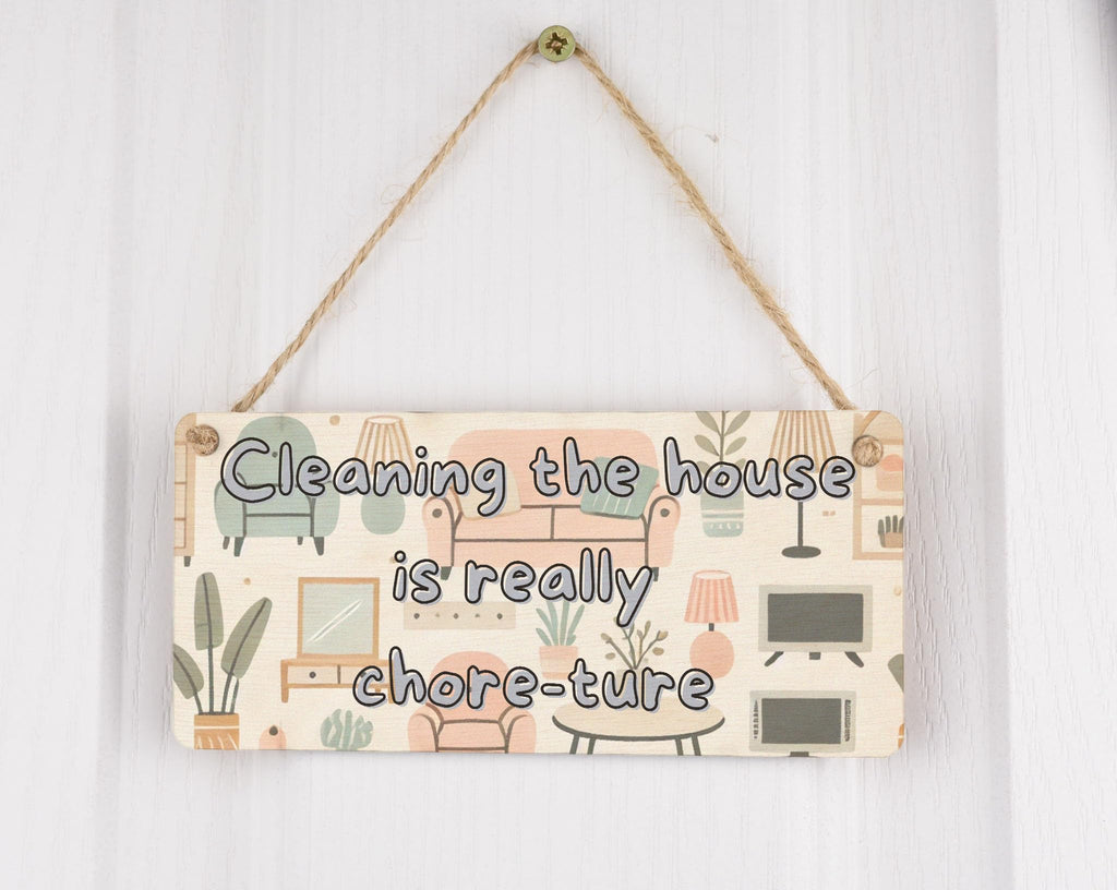Add a touch of lightheartedness to your home decor with our 'Choreture' hanging sign! This humorous sign features a playful phrase that reads 'cleaning the house is really choreture', perfect for adding a quirky touch to your living room art. The full colour design showcases cute furniture illustrations, bringing a fun and playful element to your interior design. Made from handcrafted laser cut plywood, this decorative sign is UV printed with an AI generated art that complements any cosy home vibes. Hang this unique piece of quirky wall decor in your home to bring a smile to your face every time you see it. Twine is included for easy hanging.