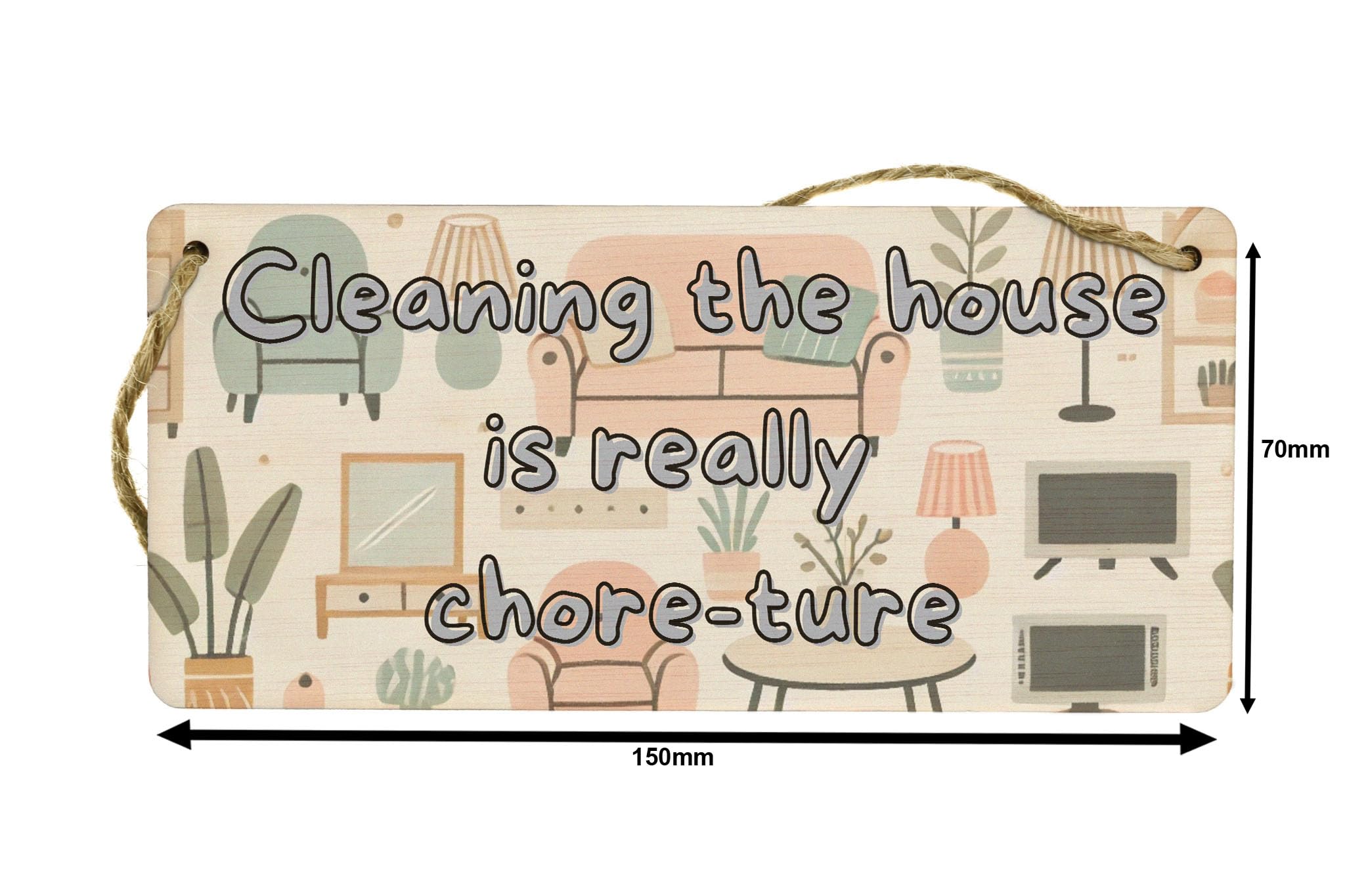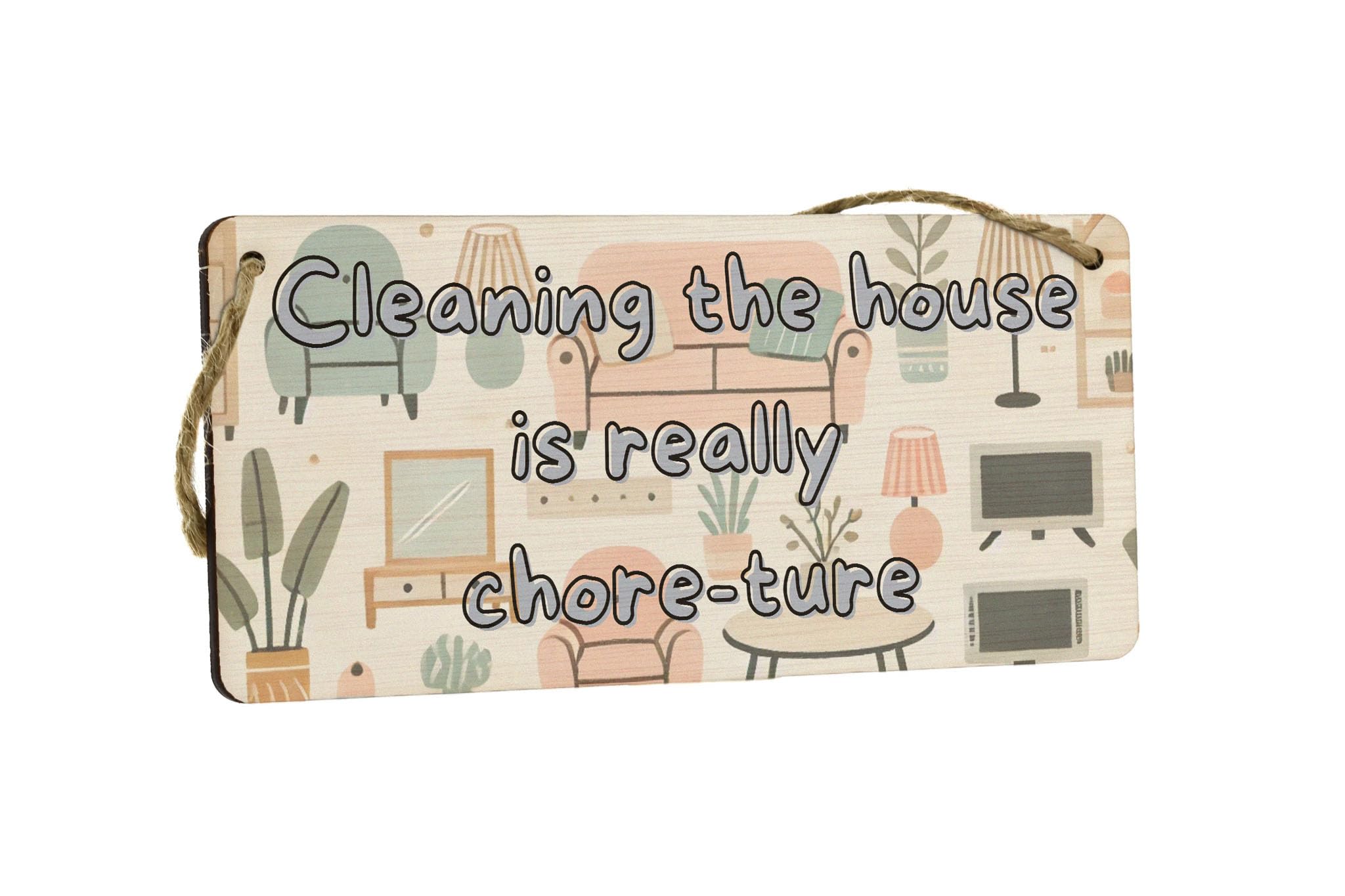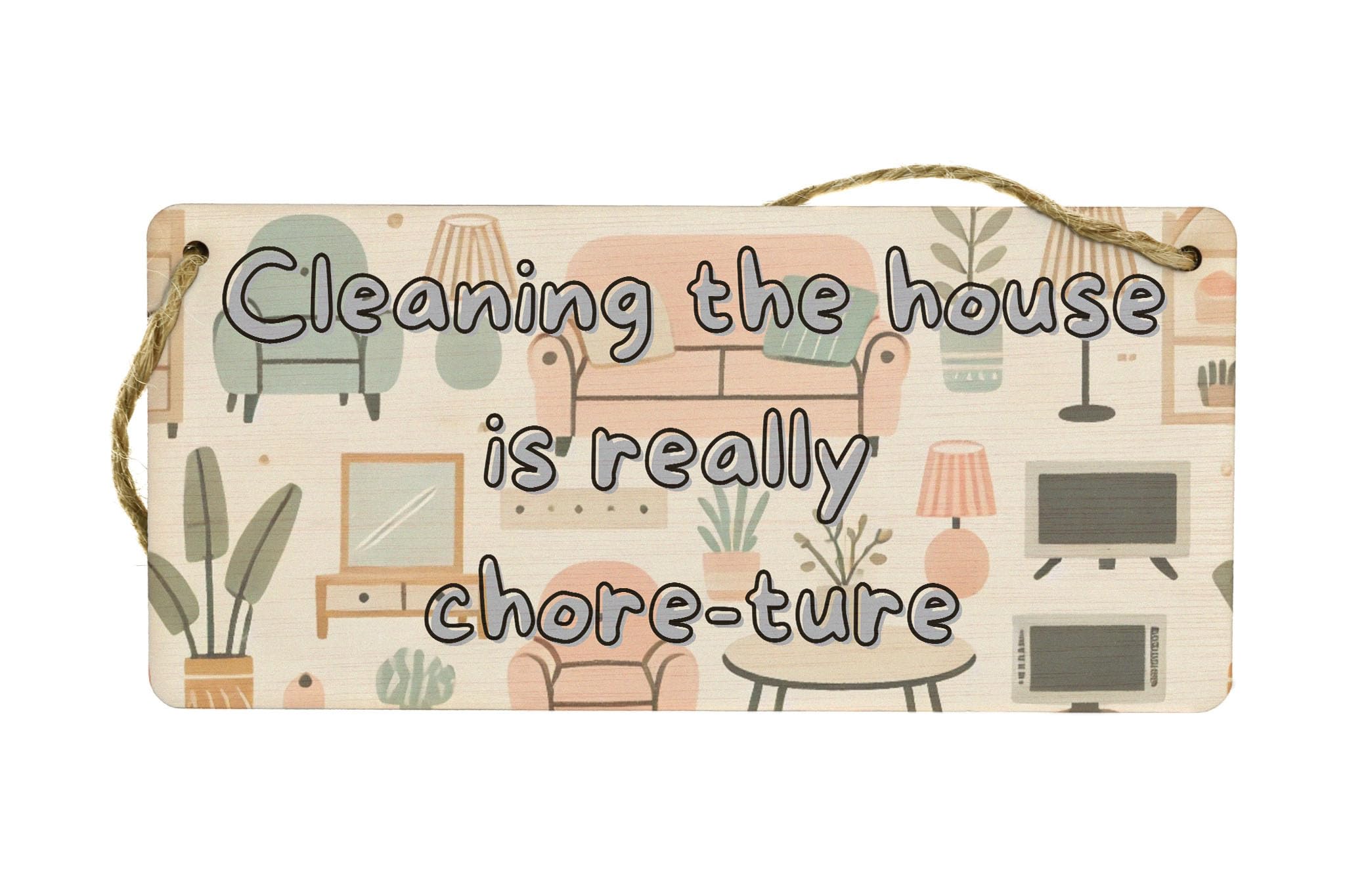 - Playful house cleaning joke hanging sign with cute furniture illustrations