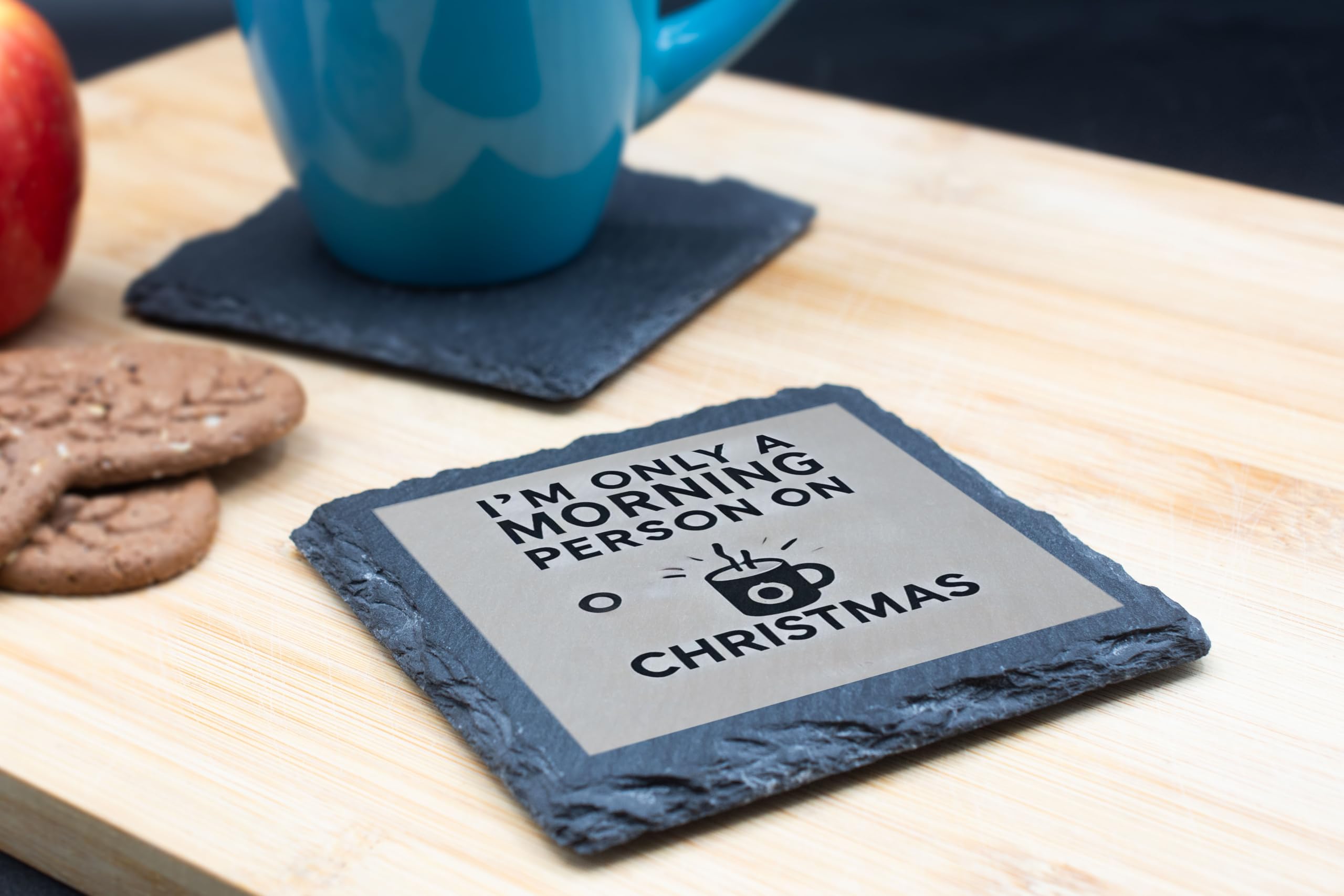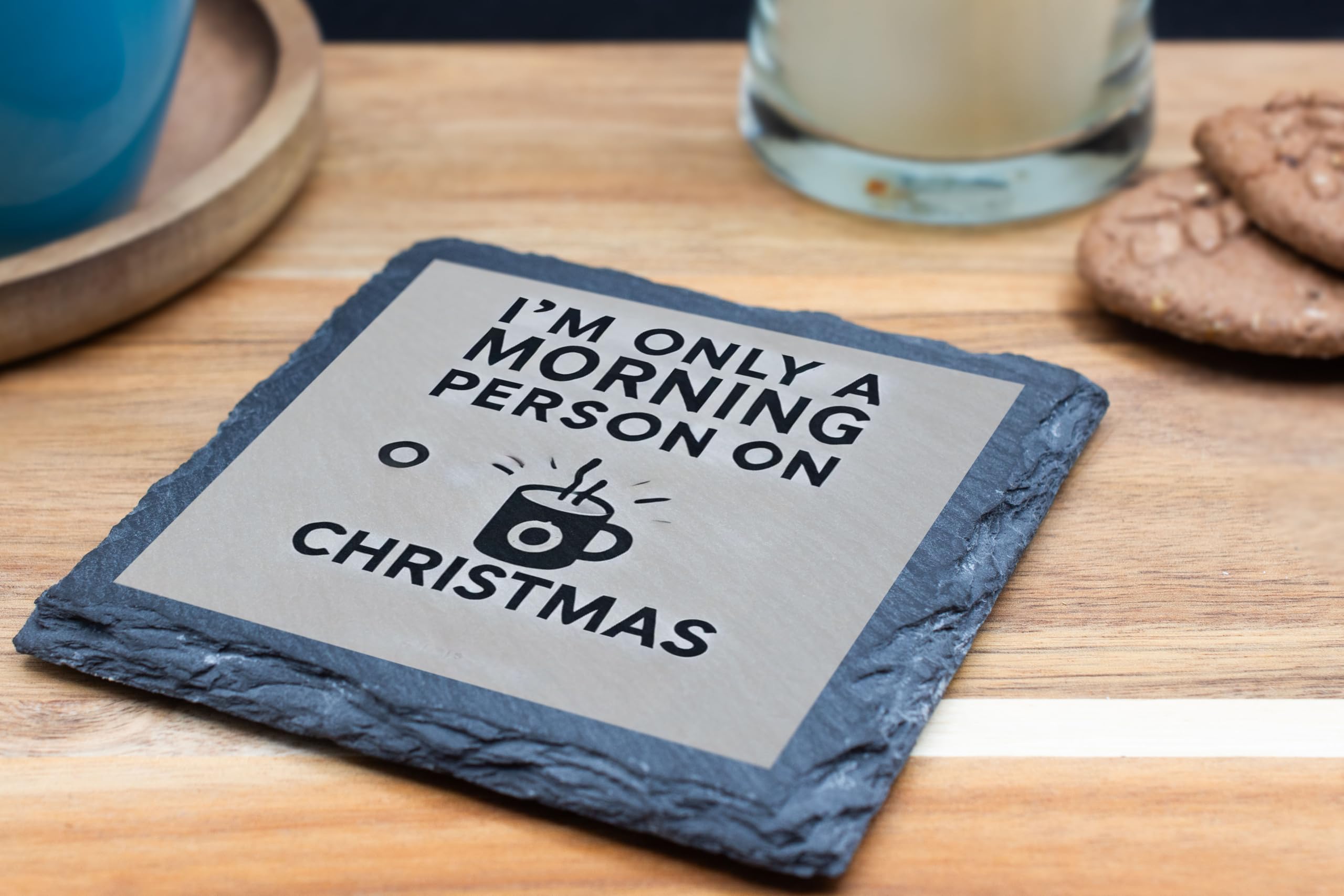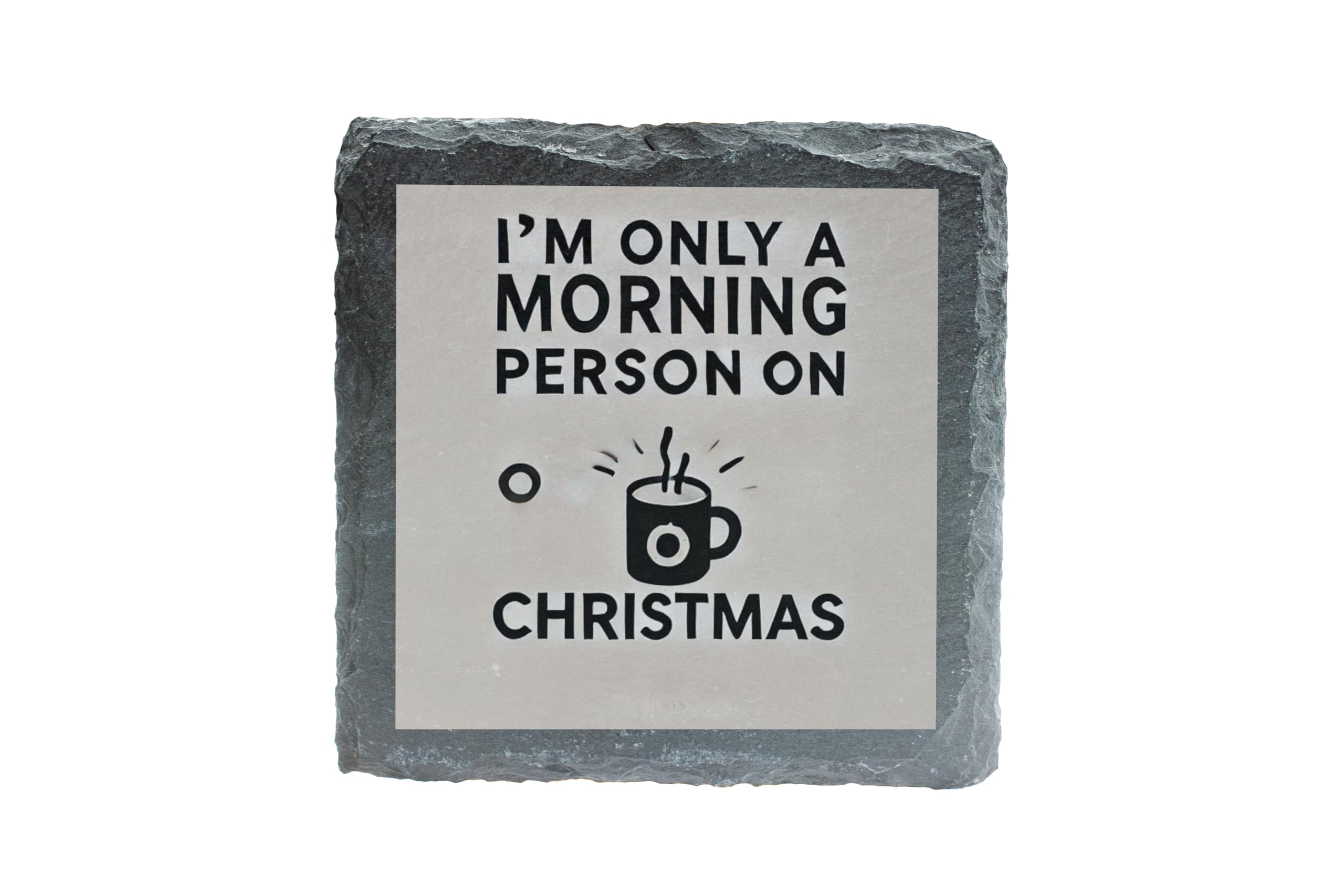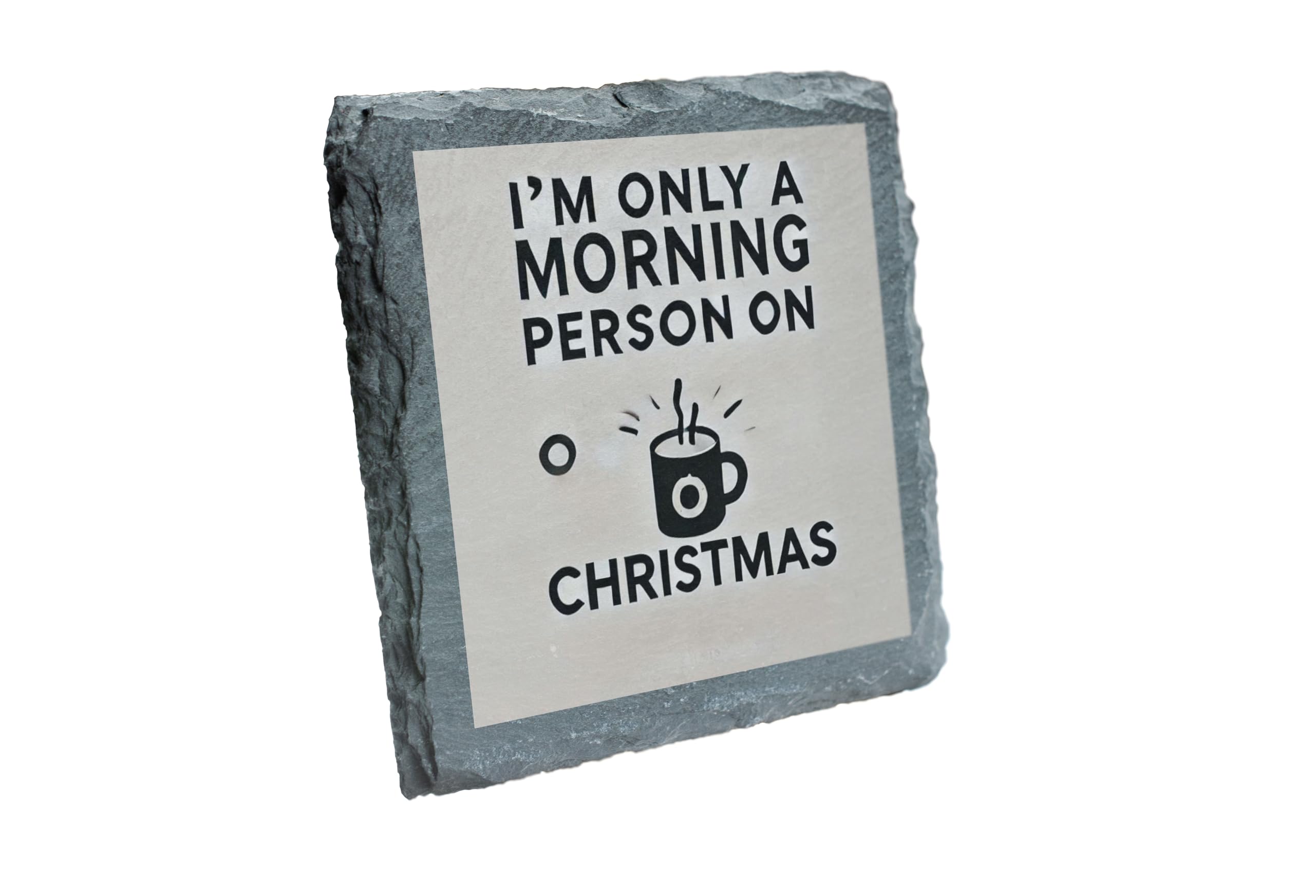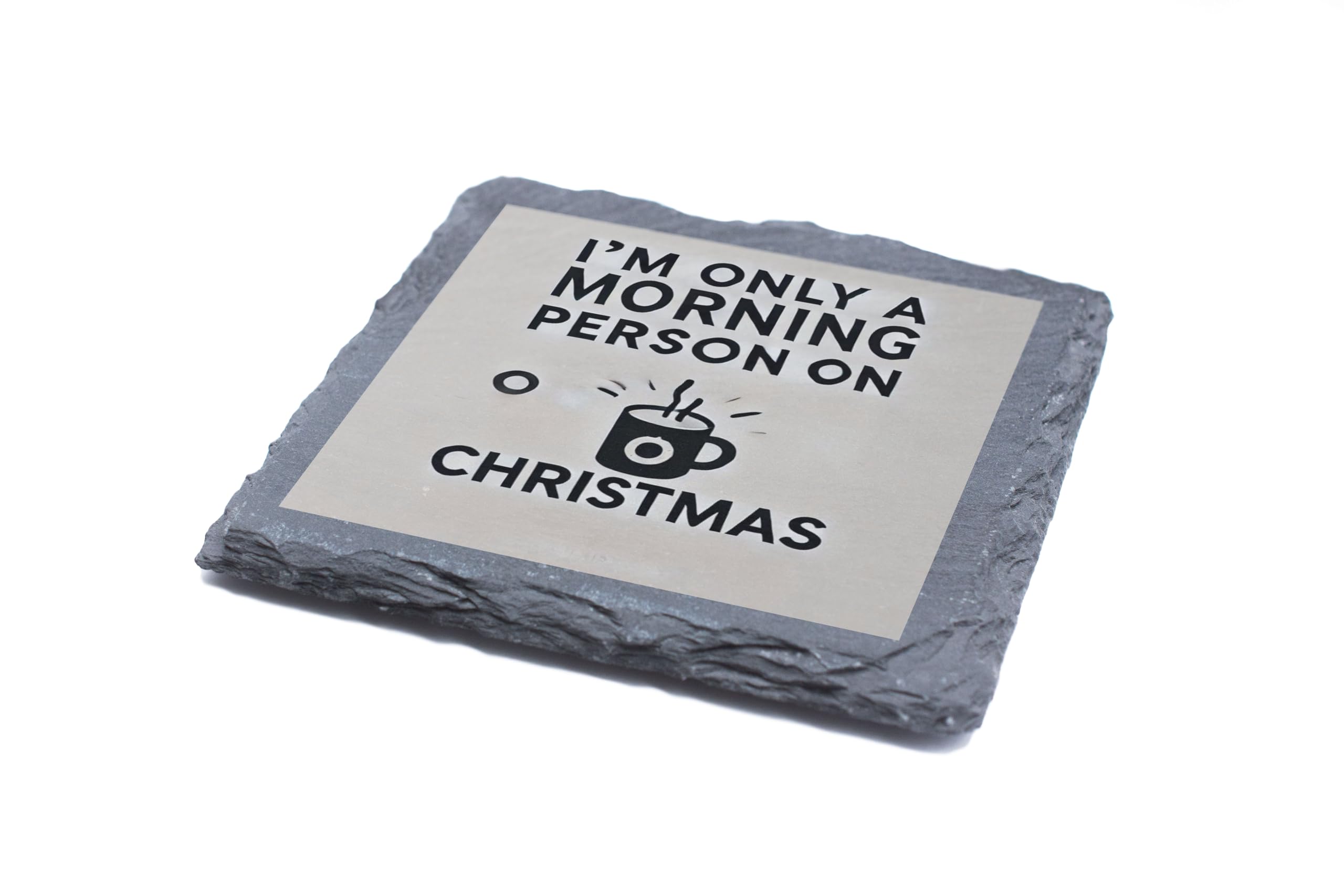 Make your Christmas mornings even more special with this stylish and functional slate coaster. Featuring the humorous phrase "I'm Only a Morning Person on Christmas," it?s the perfect accessory for coffee lovers during the festive season. The minimalist design and durable slate construction make it an excellent addition to your holiday decor or a thoughtful gift for family and friends. Enjoy your warm cup of coffee while protecting your surfaces with this charming and practical coaster that embodies the spirit of Christmas.