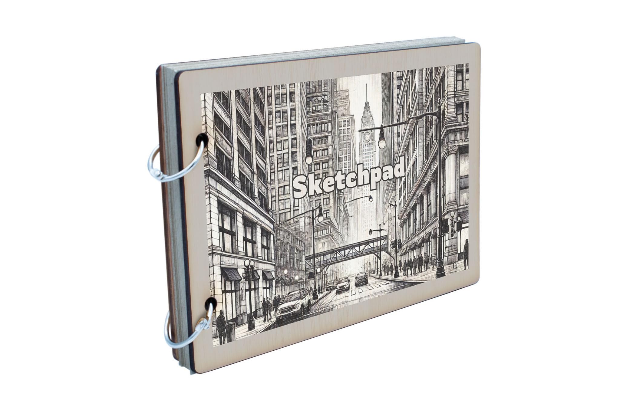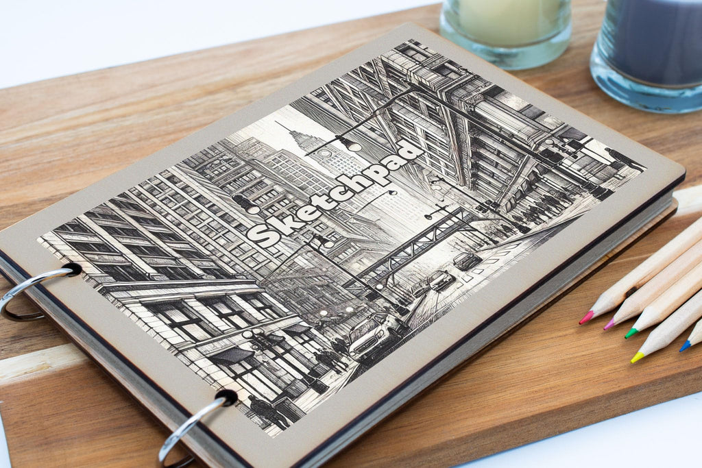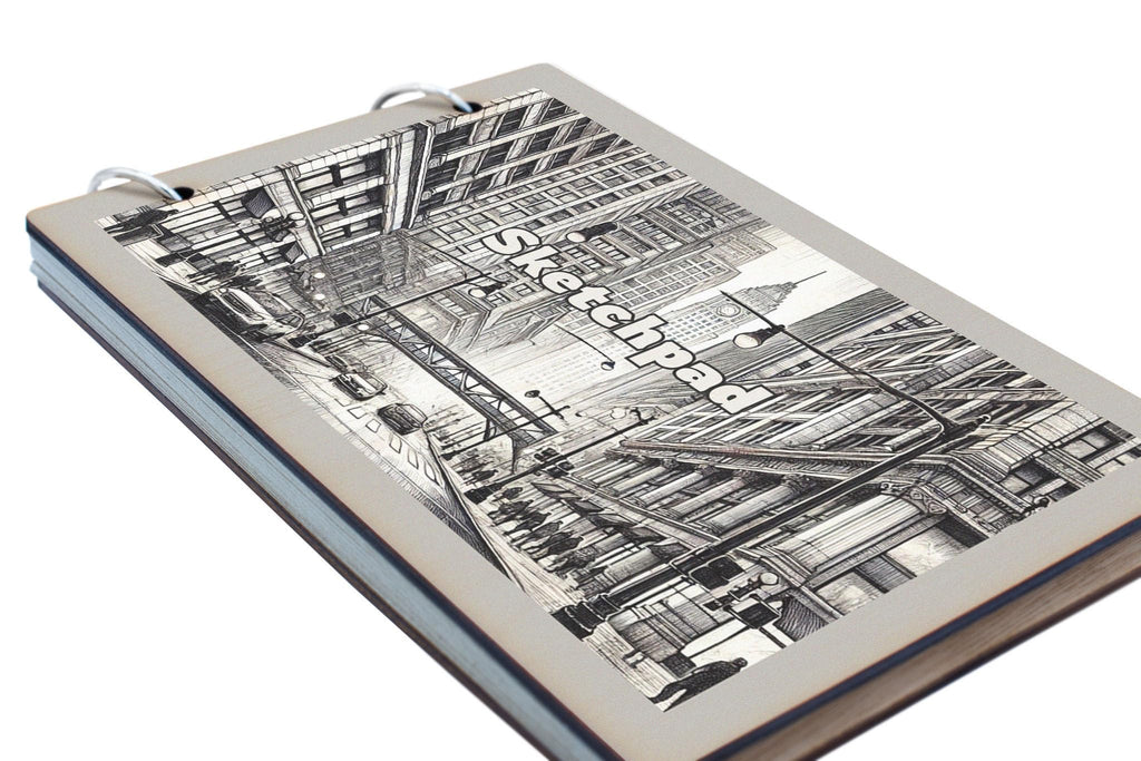 • Urban sketch theme with cityscape cover and monochrome architectural design