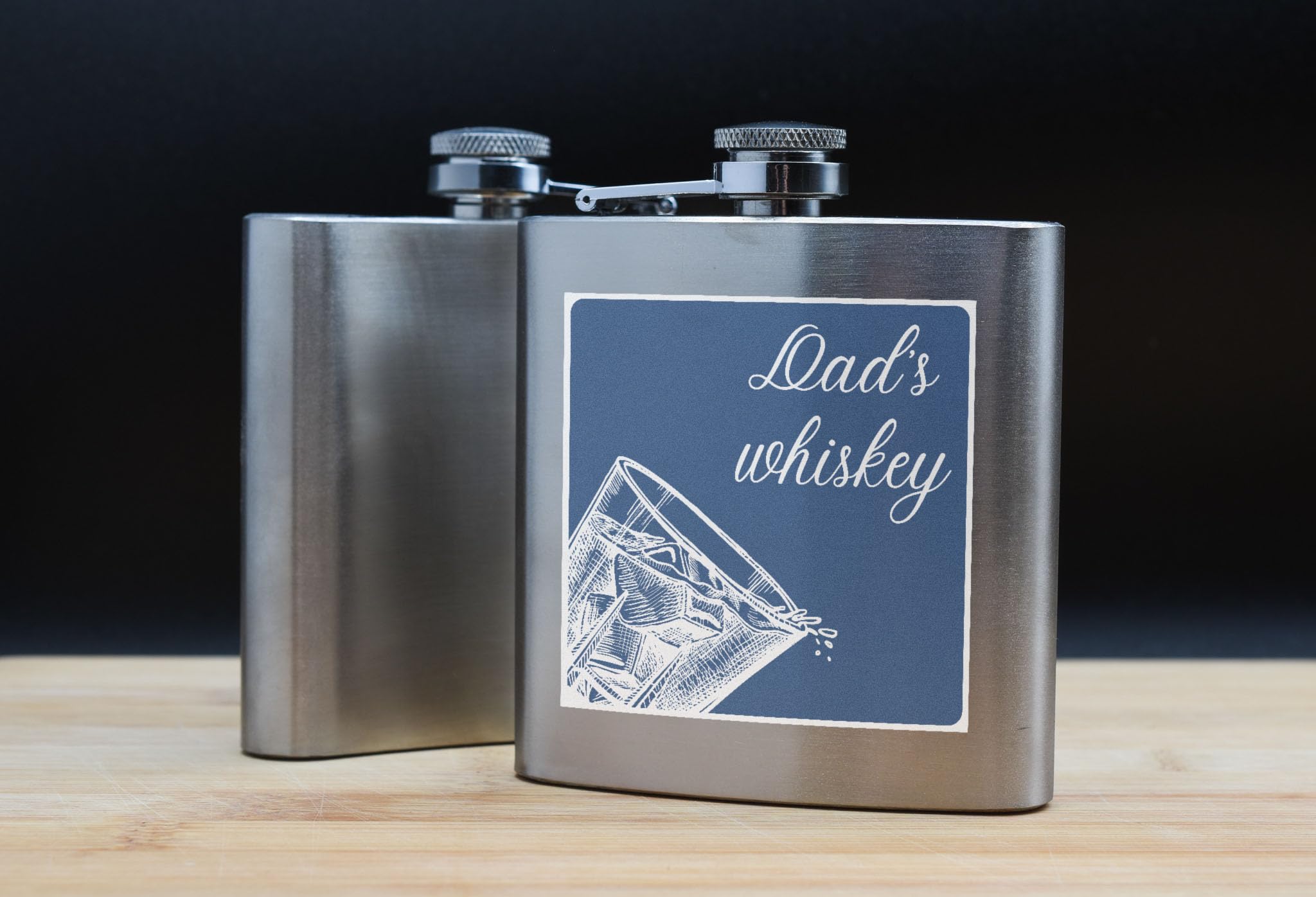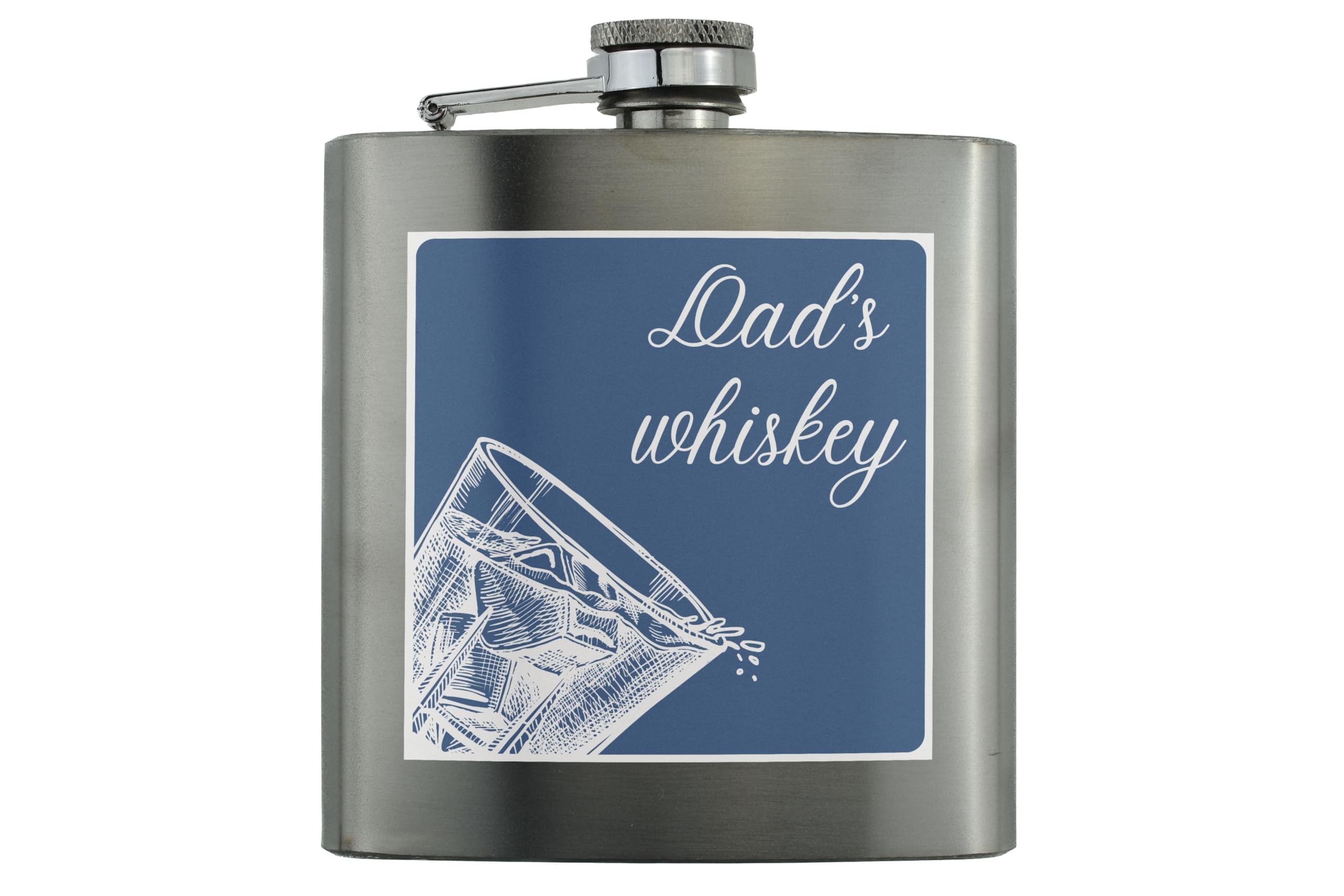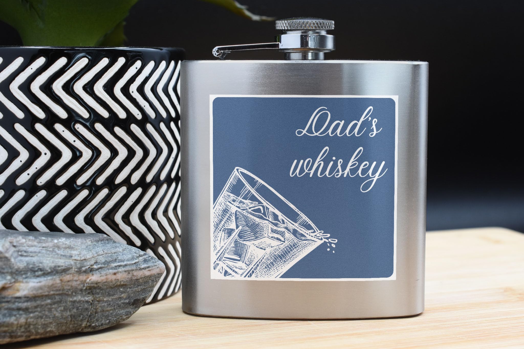 - Dad's whiskey flask featuring a classic blue whiskey tumbler design, perfect for Father's Day