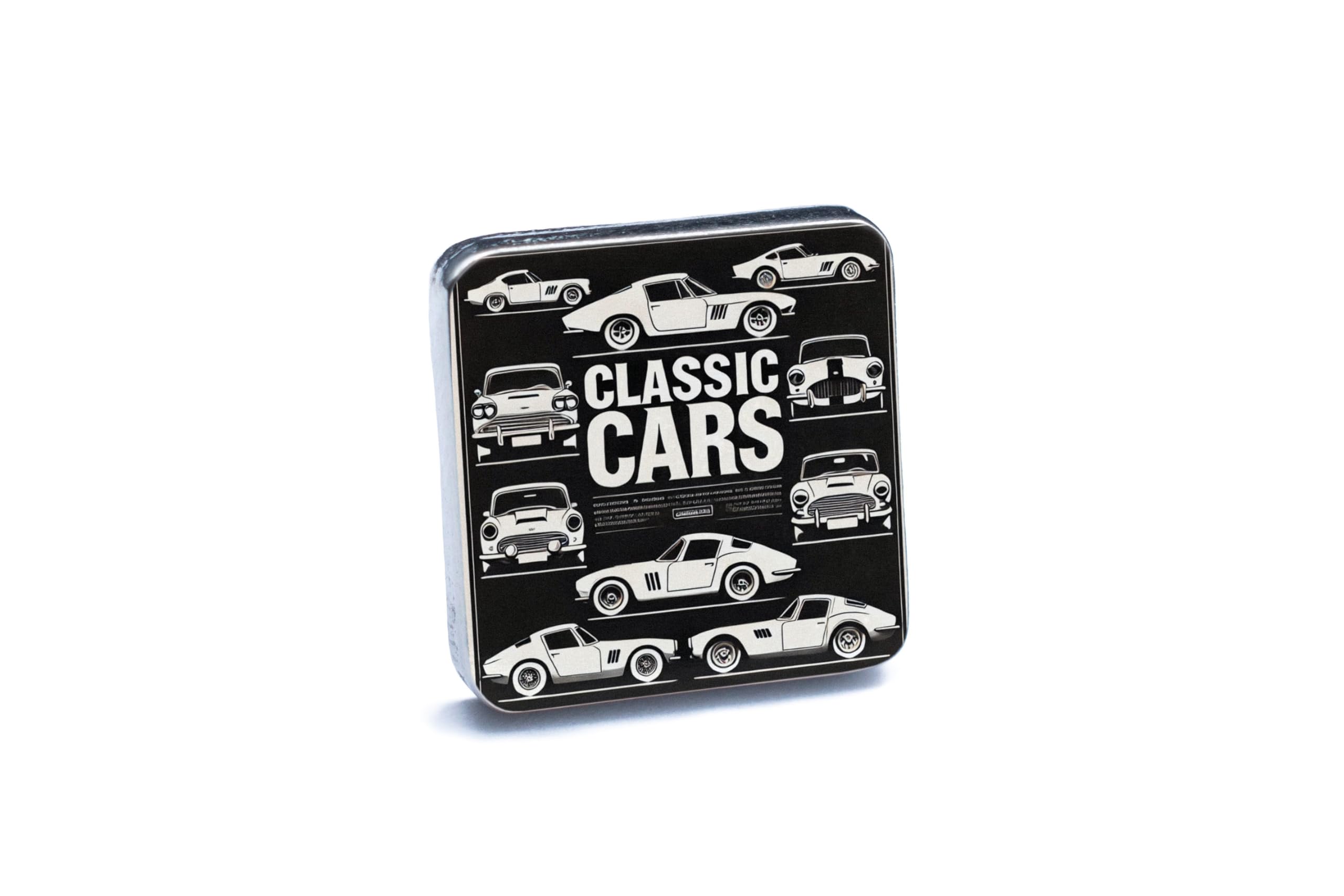 - Timeless Design: Features a collage of iconic classic car illustrations on a sleek black background, perfect for automobile lovers.