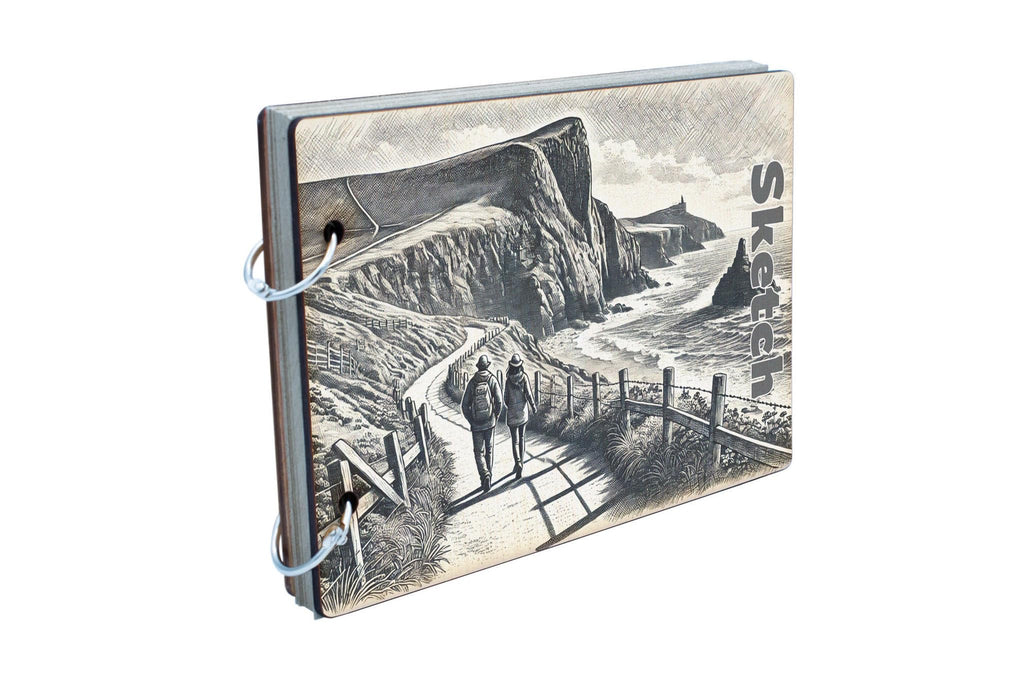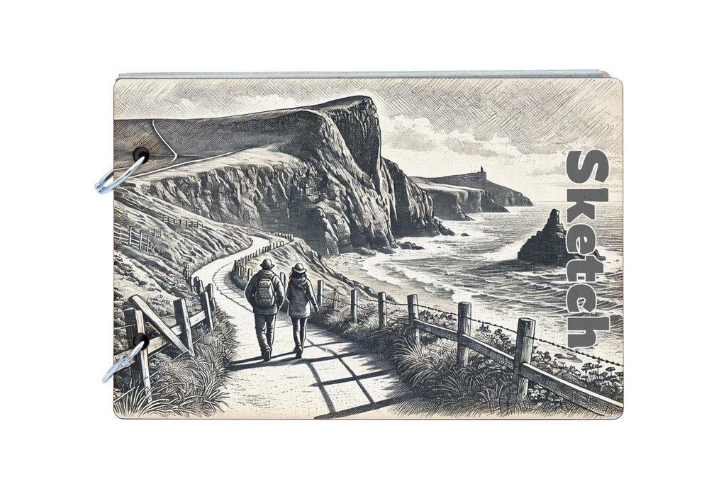 Embark on a scenic coastal journey with 'Coastal Journey: Serene Sketches of a Cliffside Path'. This beautifully crafted sketchbook features a stunning black and white sketch design of a coastal landscape, capturing the tranquility of a cliffside path. The nature-inspired illustrations create a serene atmosphere, perfect for travellers on a journey seeking a countryside escape. The classic sketch style exudes rustic charm, making it a perfect addition to your collection. The full-colour front cover is inspired by the seaside view, adding a touch of elegance to this artistic piece. Each page is made from 25 recycled pages, making it a sustainable choice for nature lovers. Whether you use it as a scrapbook or a sketchbook, 'Coastal Journey' is a must-have for anyone who appreciates the beauty of the great outdoors.