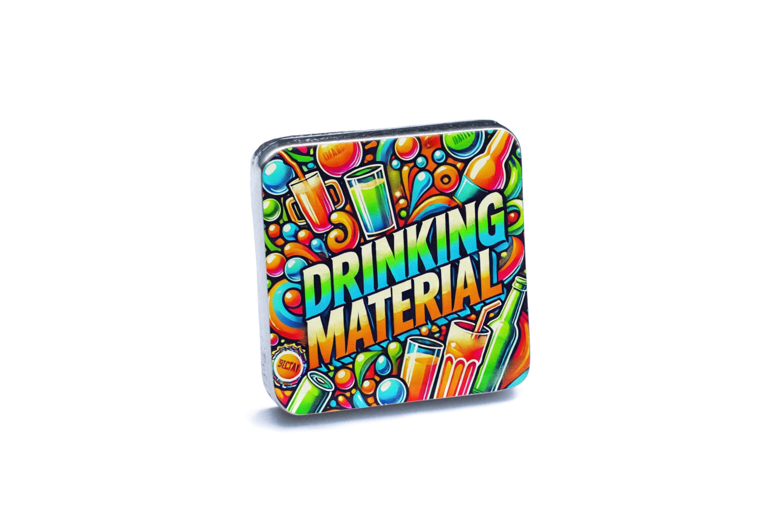 - Bold party accessory with a humorous 'Drinking Material' caption