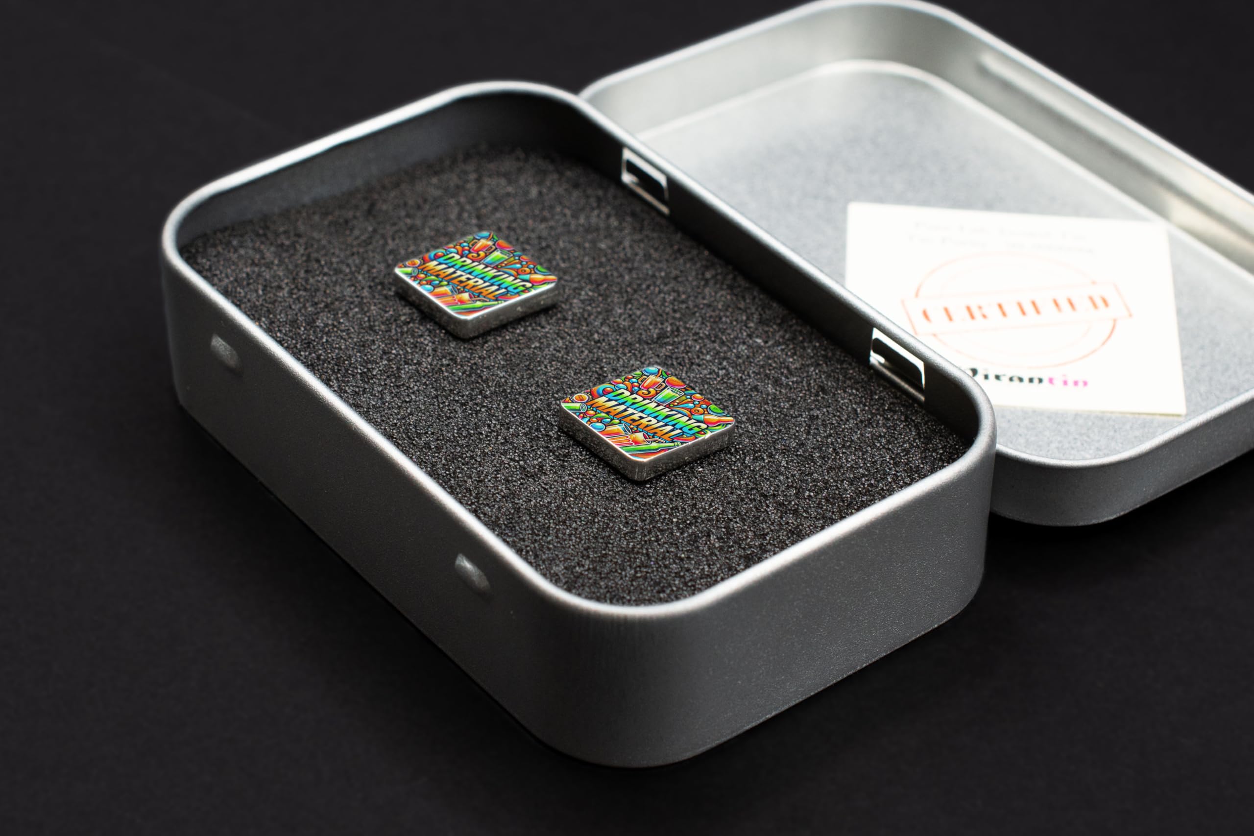 - Handcrafted tin and pewter cufflinks with UV printed design