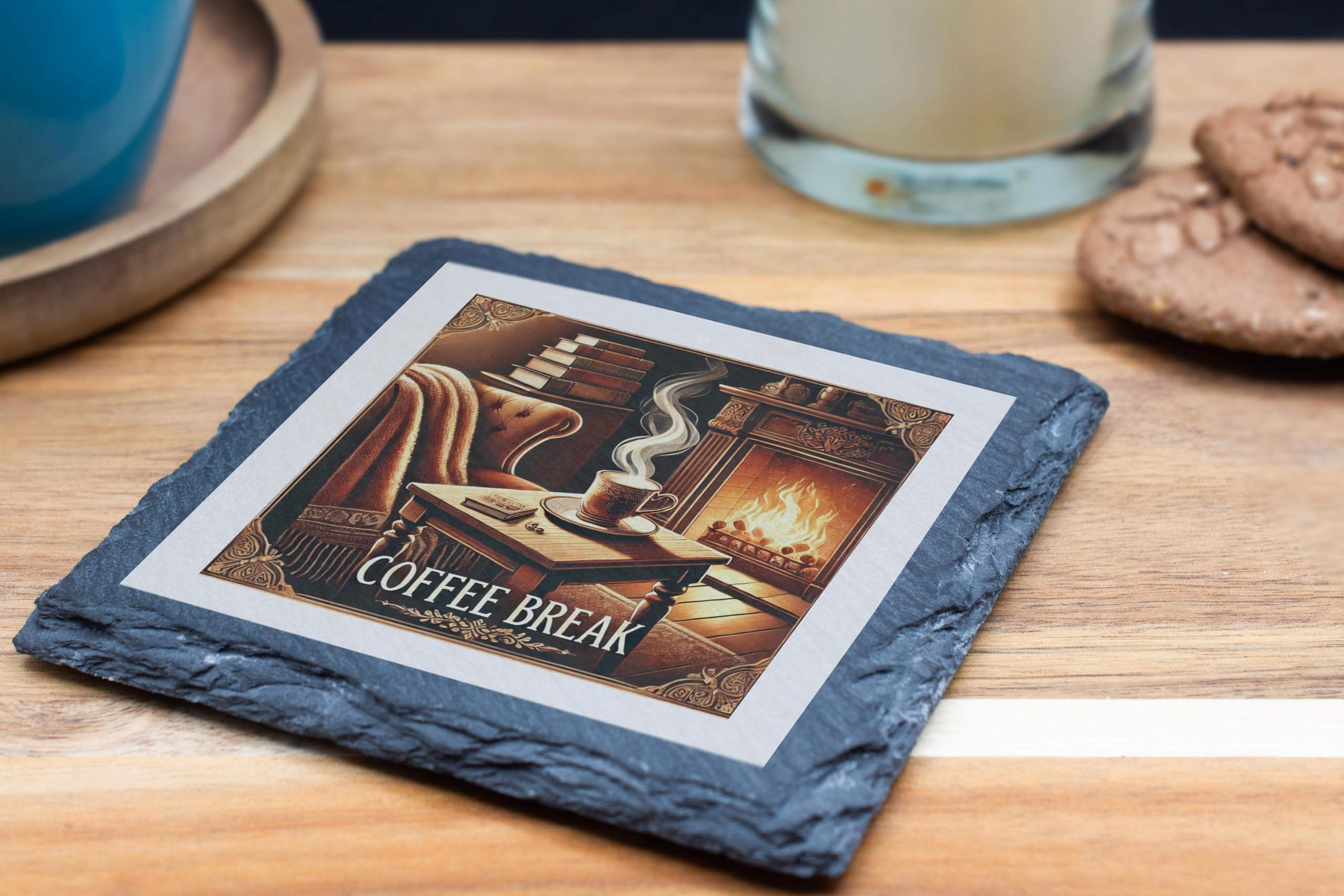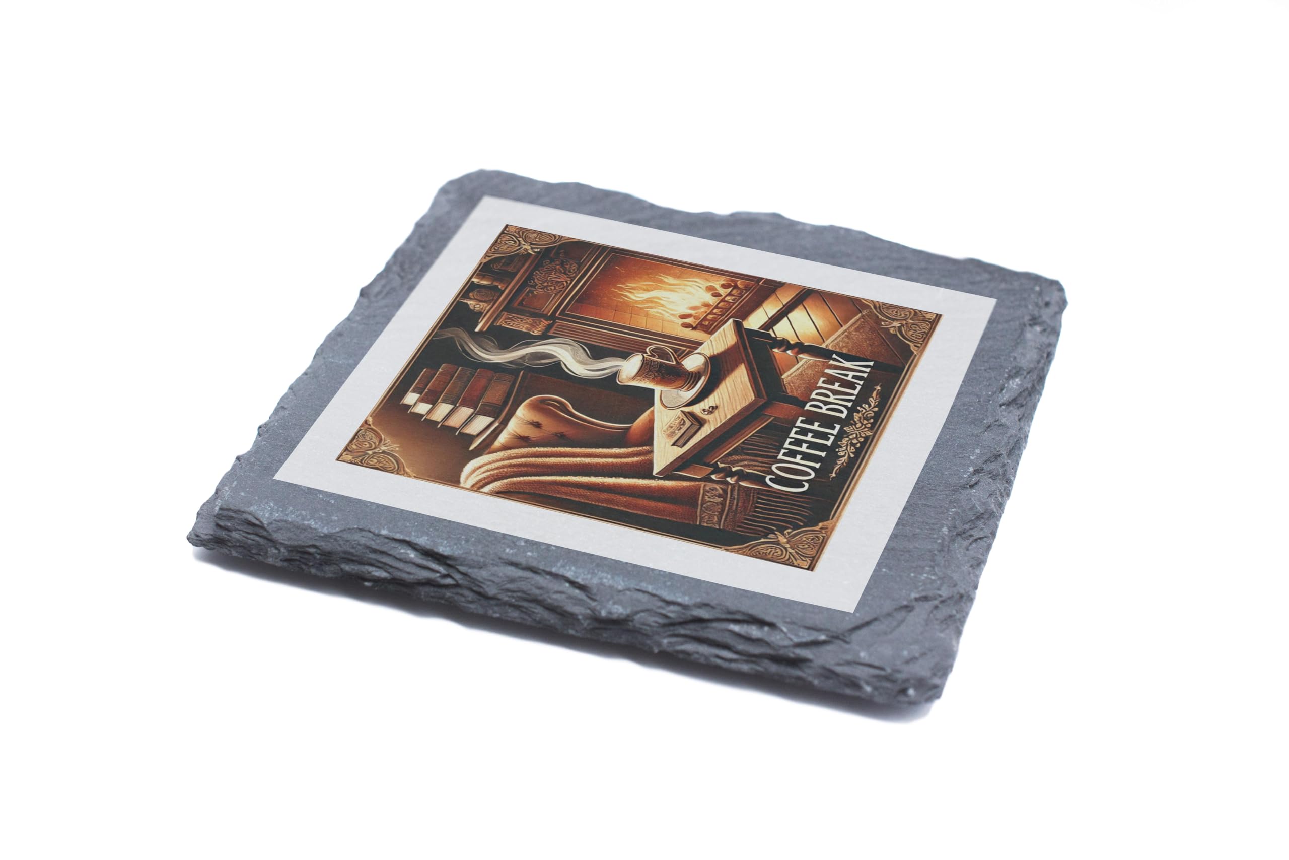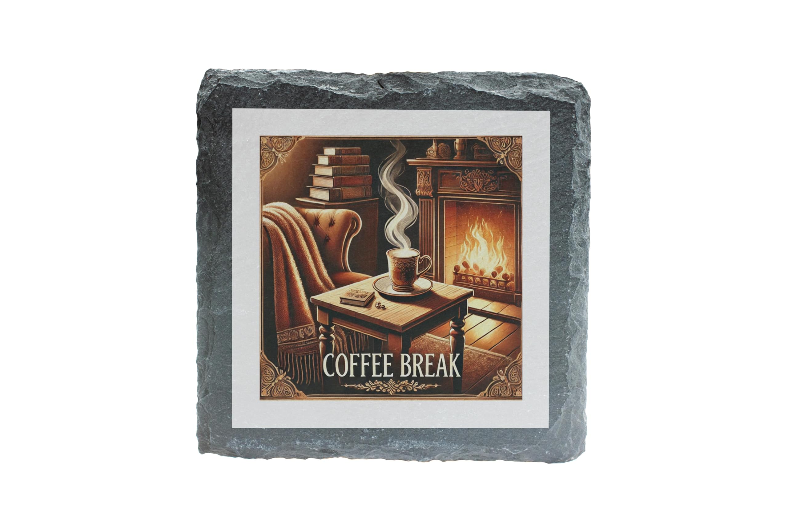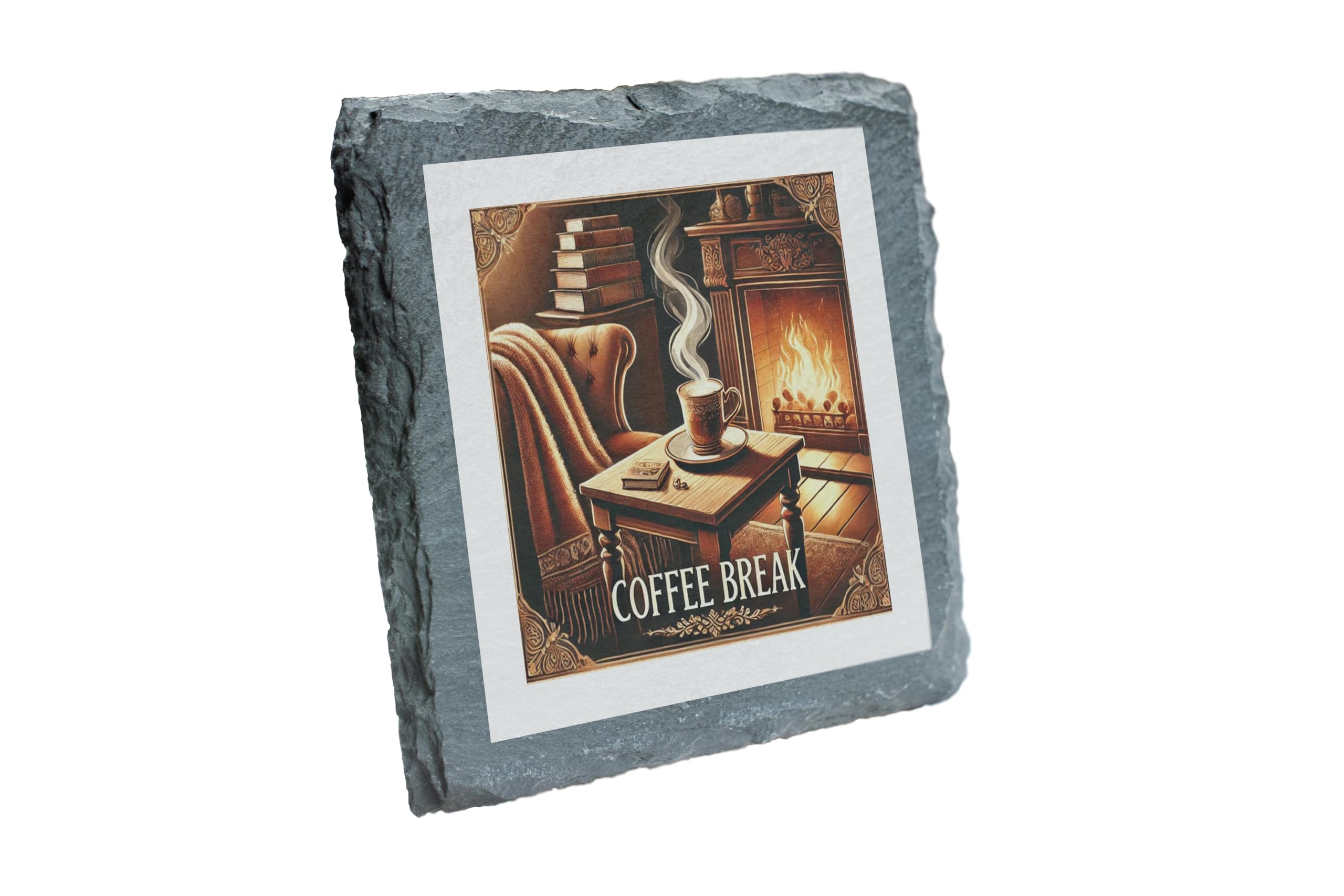 Create a serene and cozy atmosphere with this Coffee Break Slate Coaster. Its timeless design showcases a steaming coffee cup in an elegant room featuring a glowing fireplace and an inviting armchair. This beautiful scene evokes relaxation and indulgence, making it a perfect addition to your home or office. Crafted from premium natural slate, this coaster not only protects your furniture from heat and moisture but also serves as a sophisticated decor piece. The non-slip backing ensures secure placement on any surface, making it both functional and visually appealing. Whether you're a coffee connoisseur or simply enjoy warm, inviting aesthetics, this coaster is a must-have!
