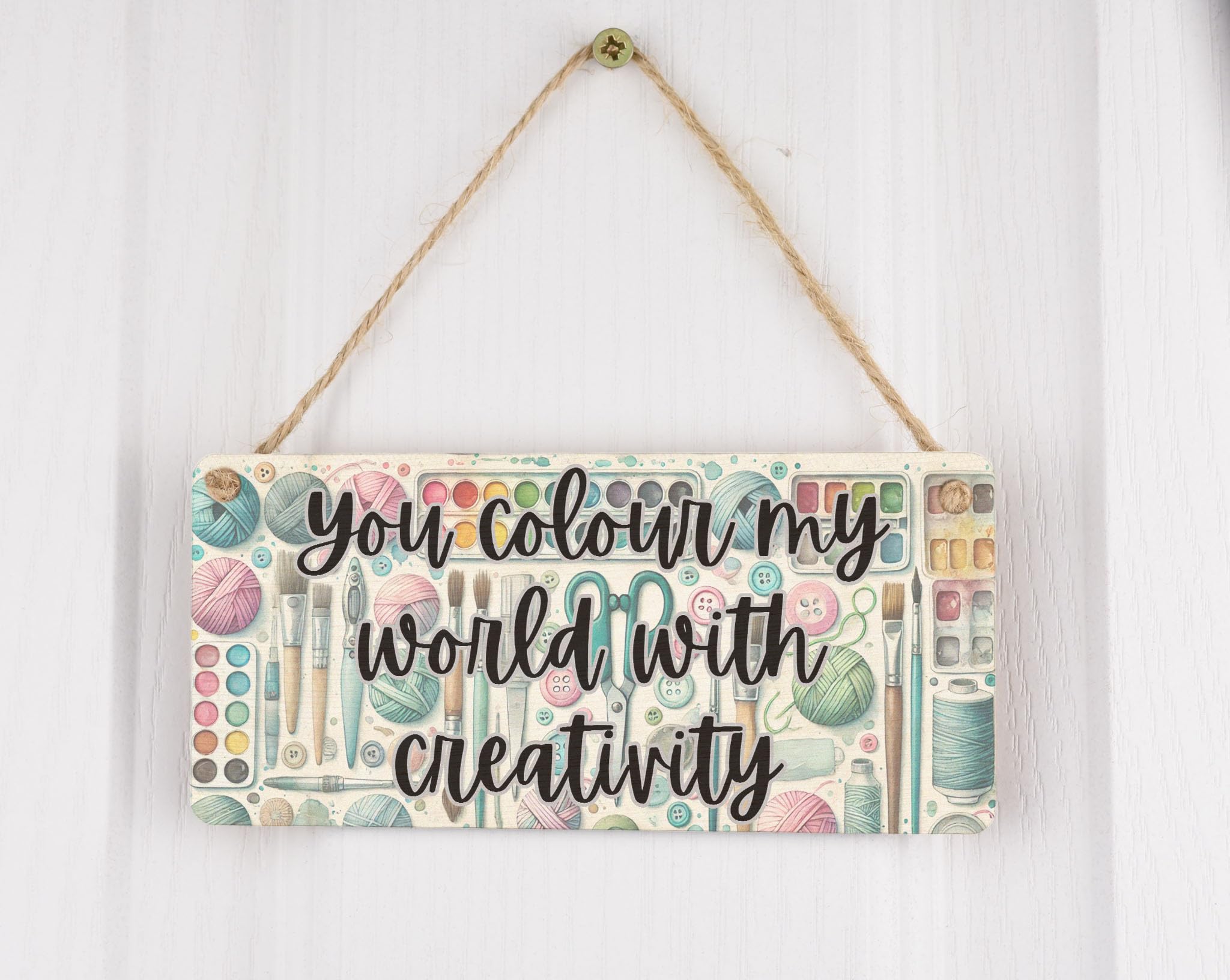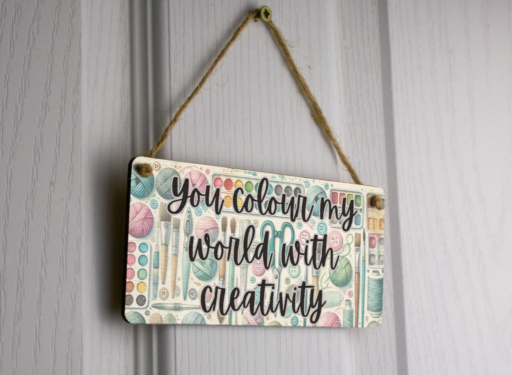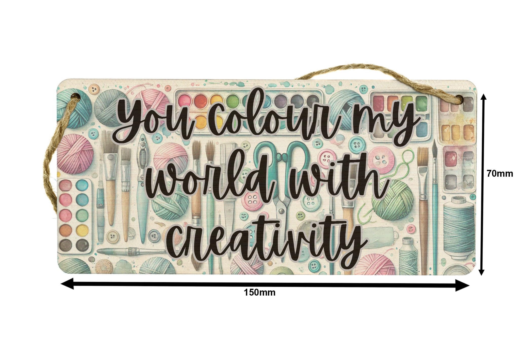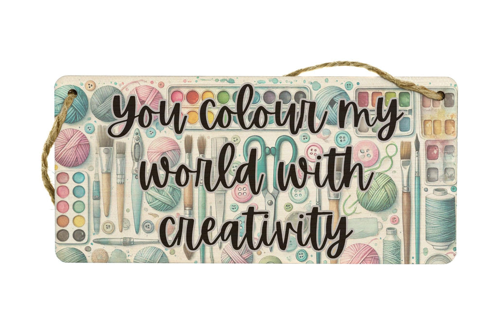 Add a splash of creativity to your craft room decor with this unique and charming 'Colour My World with Creativity' Watercolour Style Art and Craft Supplies Pattern Plywood Sign. This handcrafted laser cut plywood sign features a full colour design showcasing a watercolour style art and craft supplies pattern, inspiring you to unleash your artistic expression. The AI generated art is UV printed onto the sign, ensuring a vibrant and long-lasting design. Hang it on your wall using the included twine to instantly add a touch of inspiration to your crafting space. Let this sign remind you of the joy of crafting, painting, sewing, knitting, and DIY projects that fill your world with colour and creativity. Perfect for those who prioritise creativity and love to immerse themselves in the world of arts and crafts.