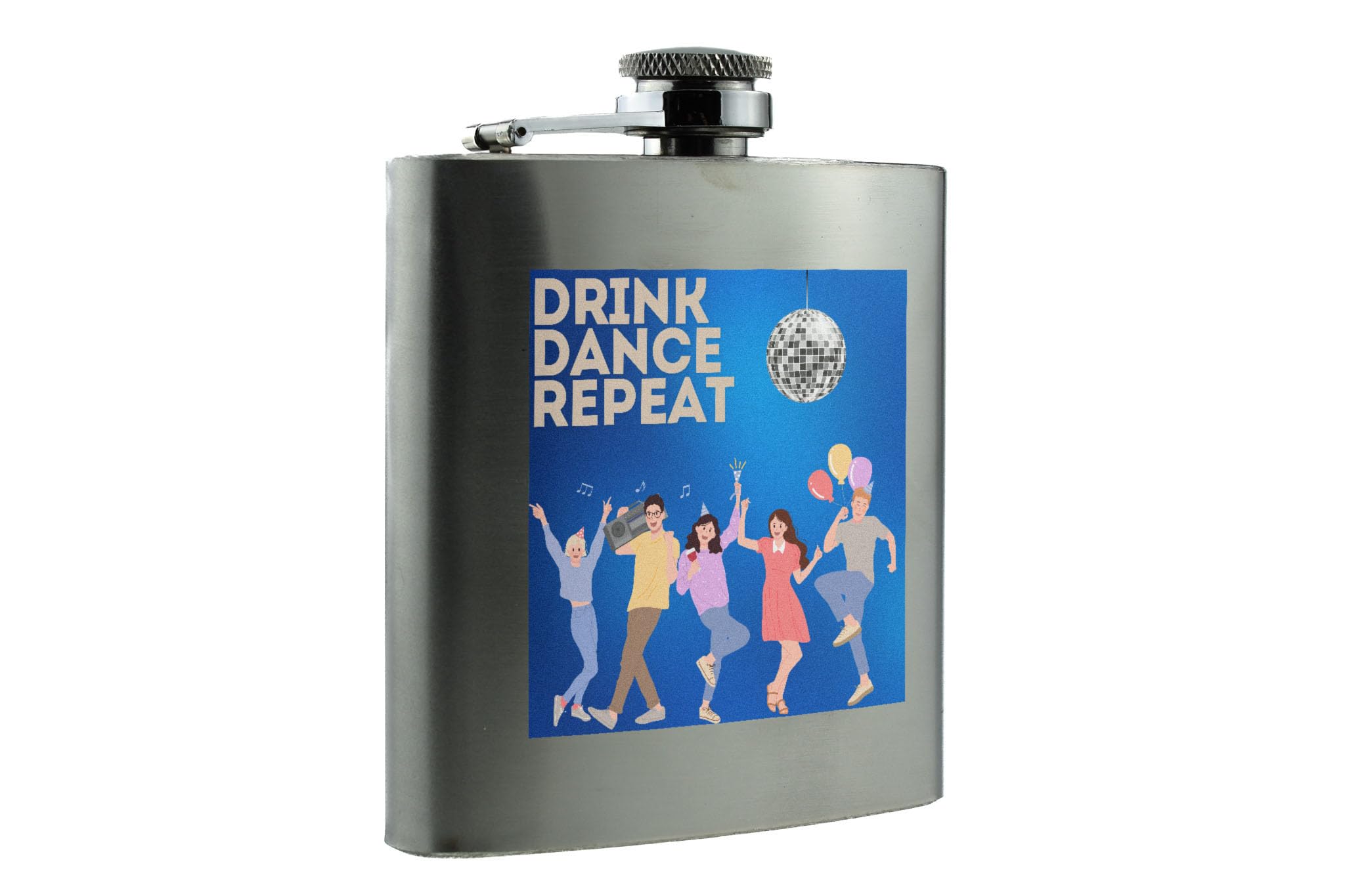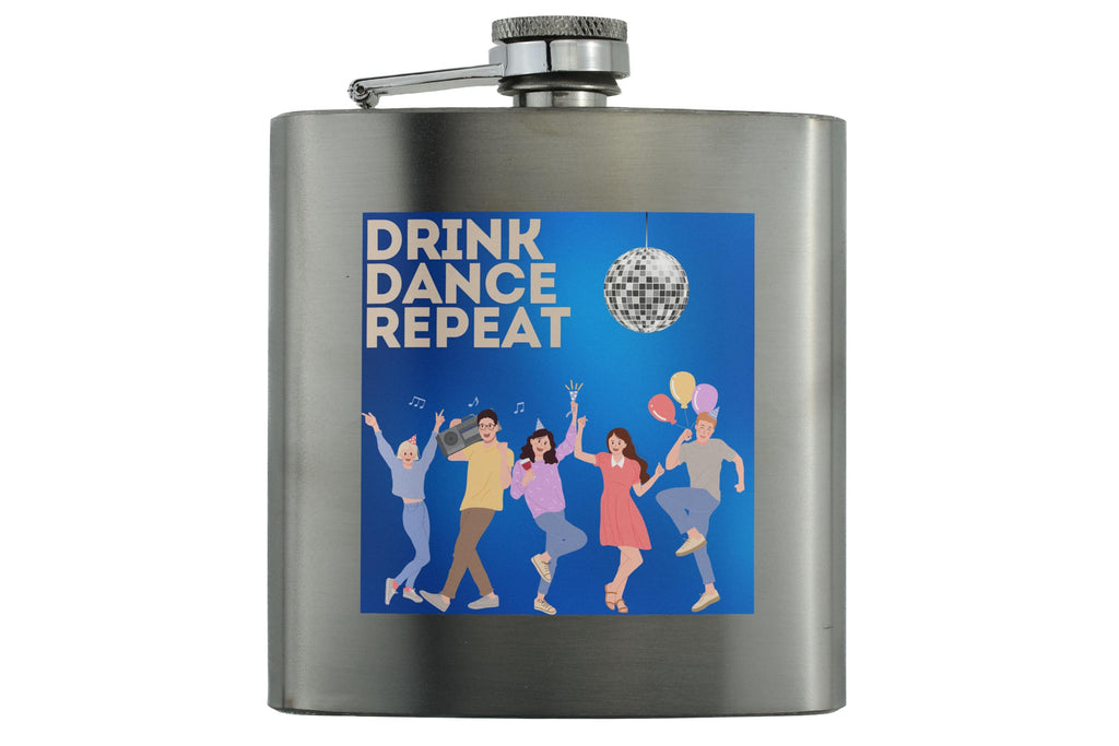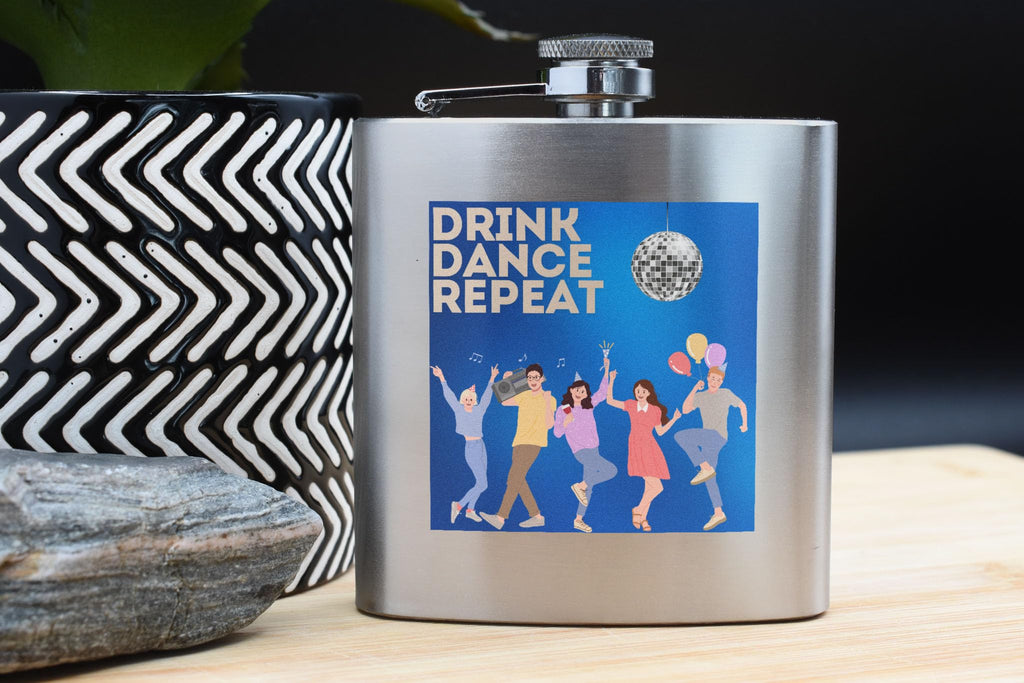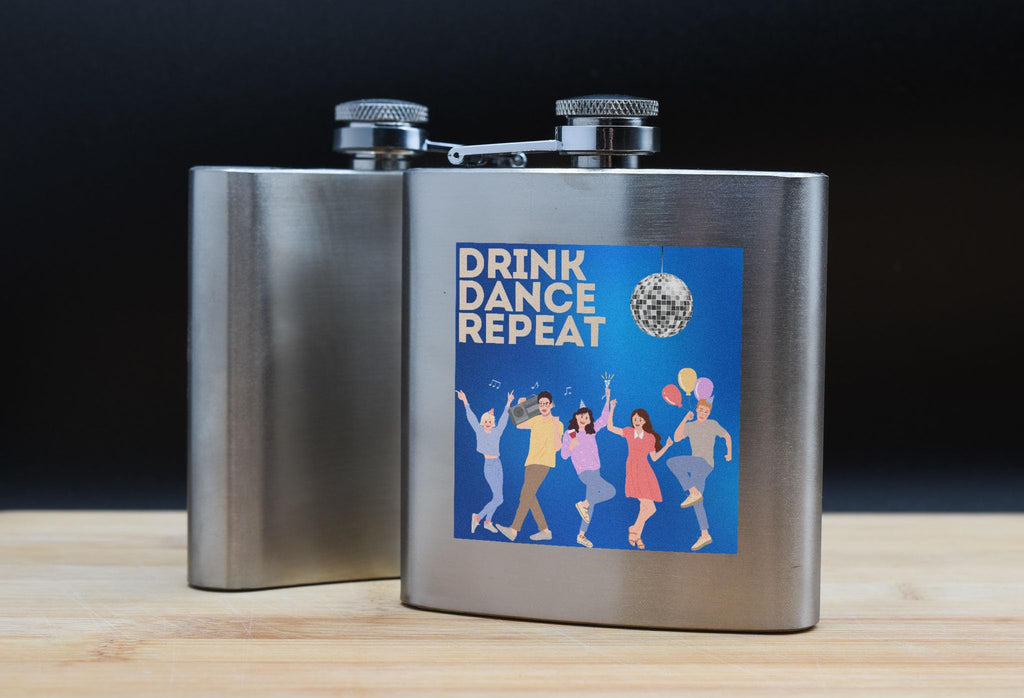 Introducing our Colourful Cartoon Dance Party Hip Flask with 'Drink - Dance - Repeat' Design! This party hip flask is a must-have for any music lover or dancer. The disco theme flask features a fun and vibrant design, making it the perfect accessory for any celebration or event. Made from quality stainless steel, this novelty item flask is durable and sure to impress. The full colour UV printed design showcases a colourful cartoon style, adding a touch of fun to your nights out with the girls. With 'drink - dance - repeat' printed on the front, this hip flask is a reminder to keep the party going all night long. Whether you're heading to a dance party or just want to add some flair to your drinkware collection, this colourful hip flask is the perfect choice.