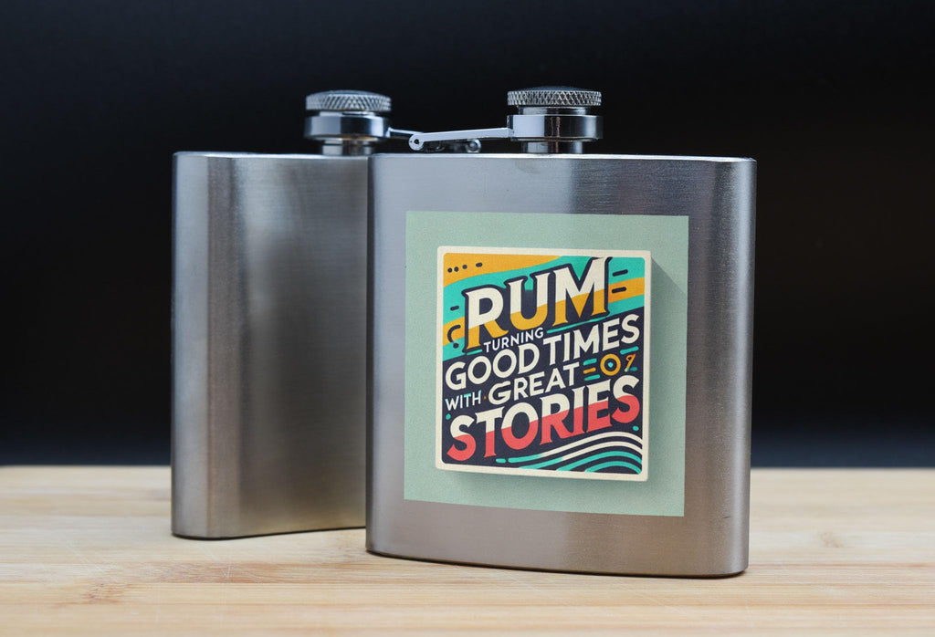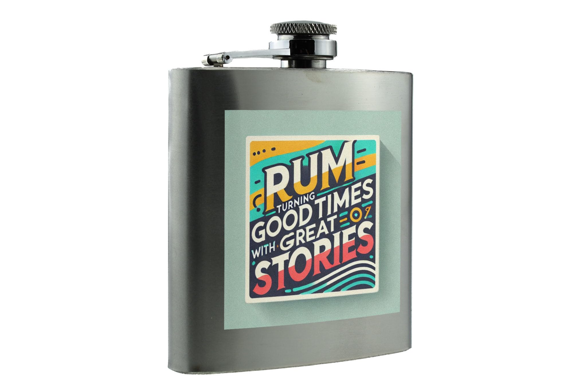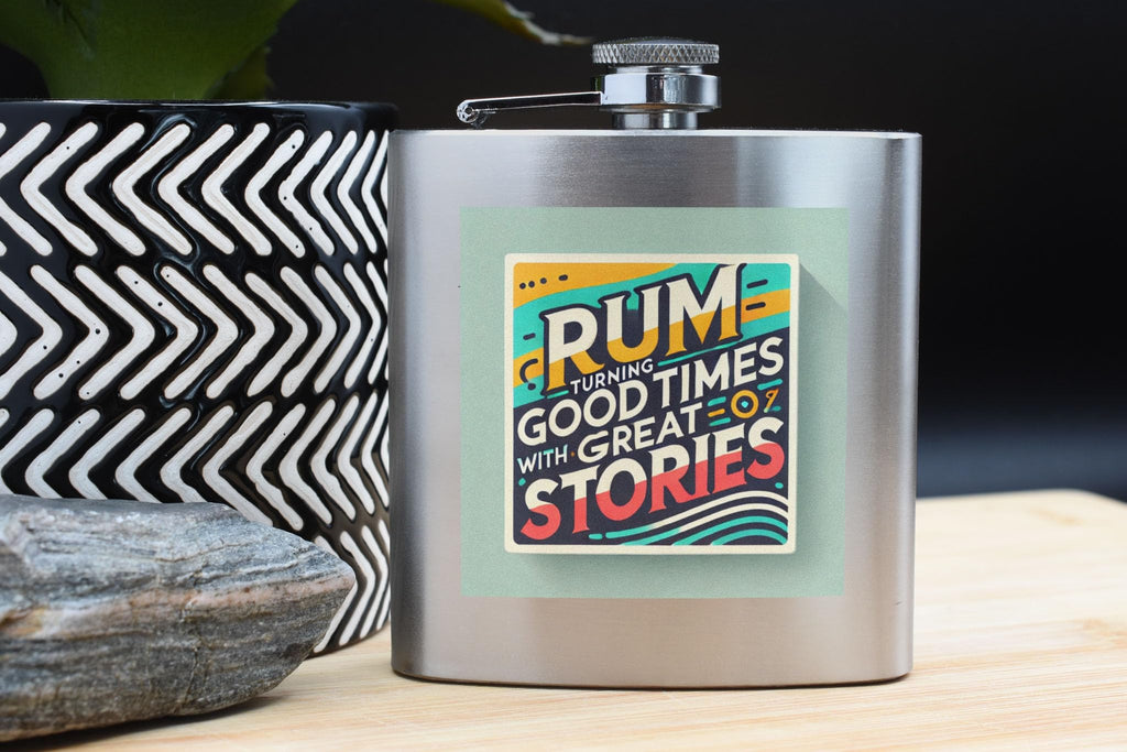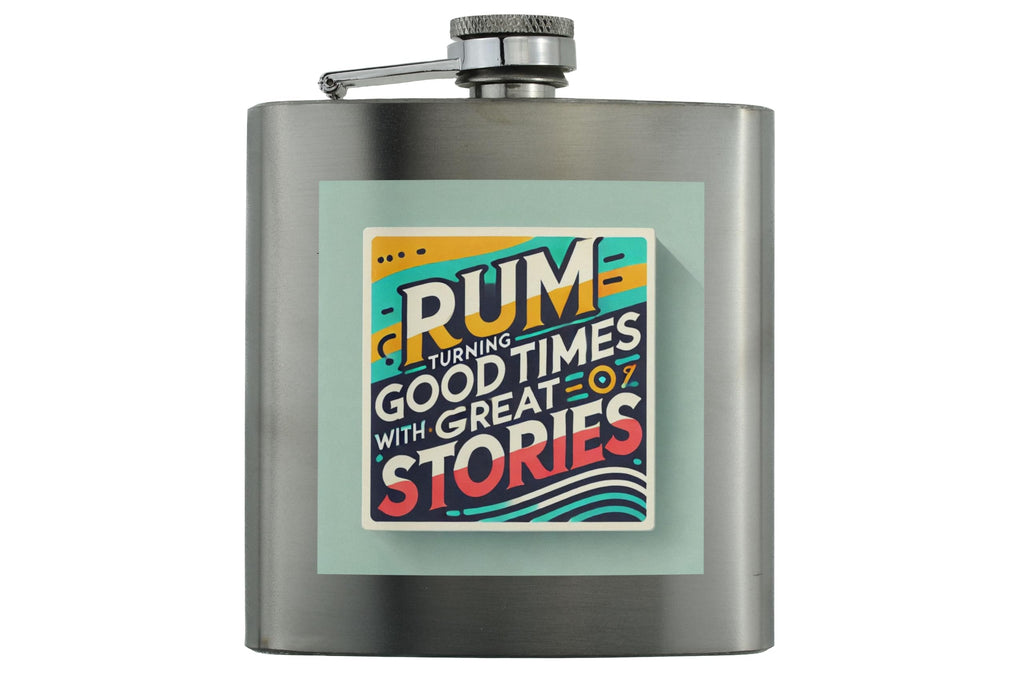 Introducing our vibrant and eye-catching Colourful Rum-Themed Flask featuring a fun and quirky design that is sure to impress any rum enthusiast. Made from quality stainless steel, this portable drinkware is perfect for carrying your favourite rum wherever you go. The full-colour printed flask showcases an ai-generated art design with UV printing, reading 'Rum Turning Good Time with Great Stories'. Whether you're out for a night with friends or simply enjoying a quiet drink at home, this novelty item is a must-have for any rum lover. Surprise your loved ones with this unique and memorable gift that will spark great stories and good times.