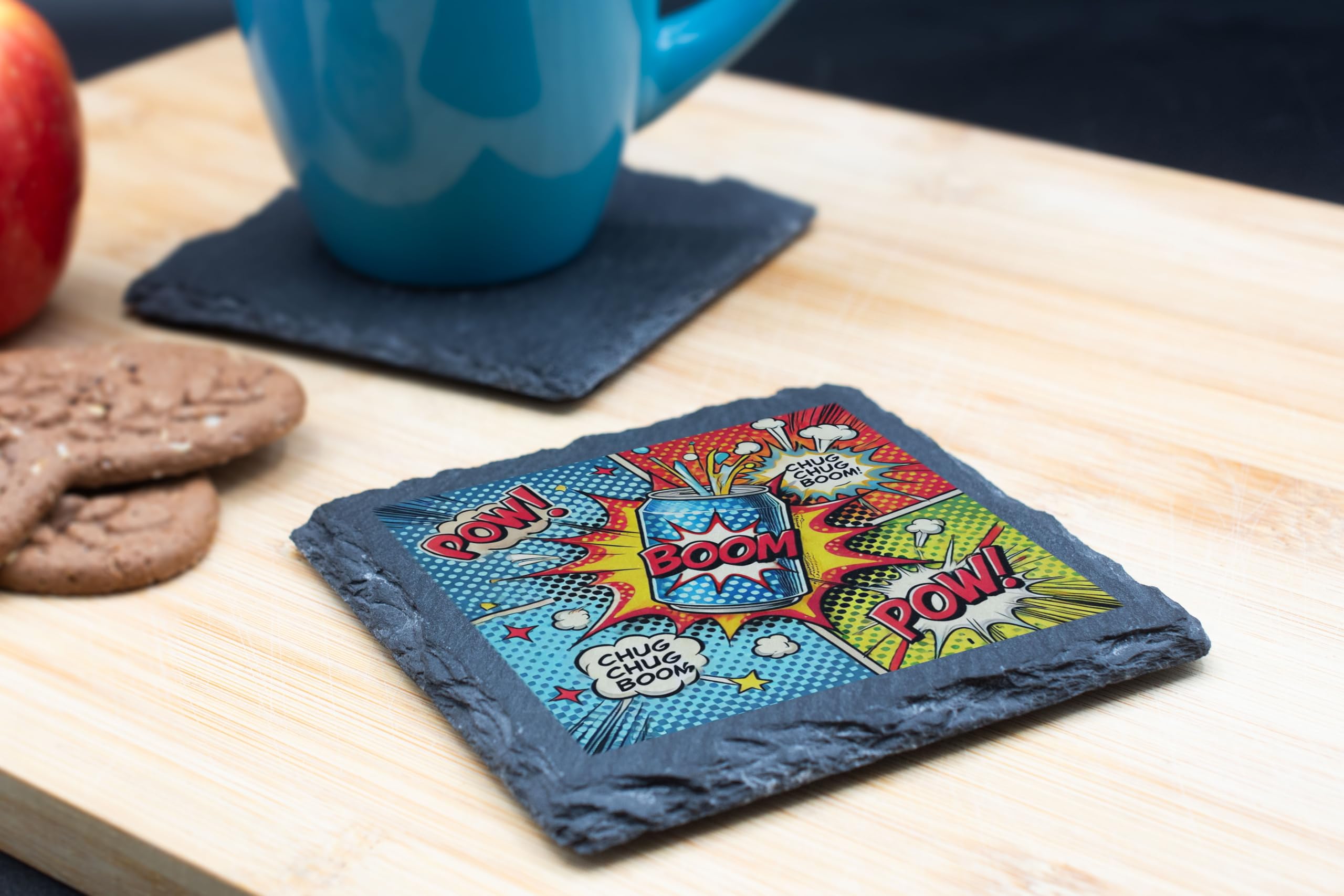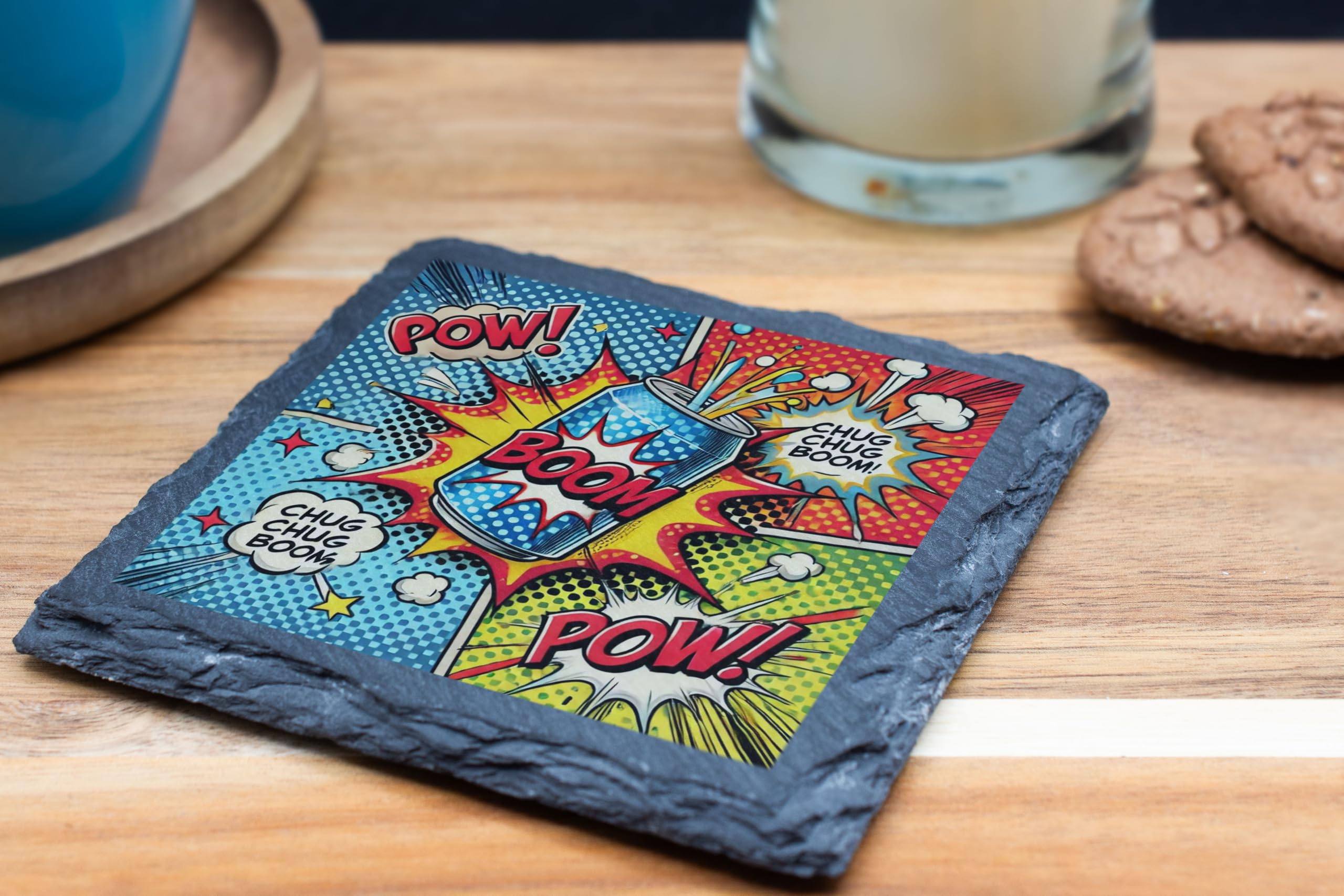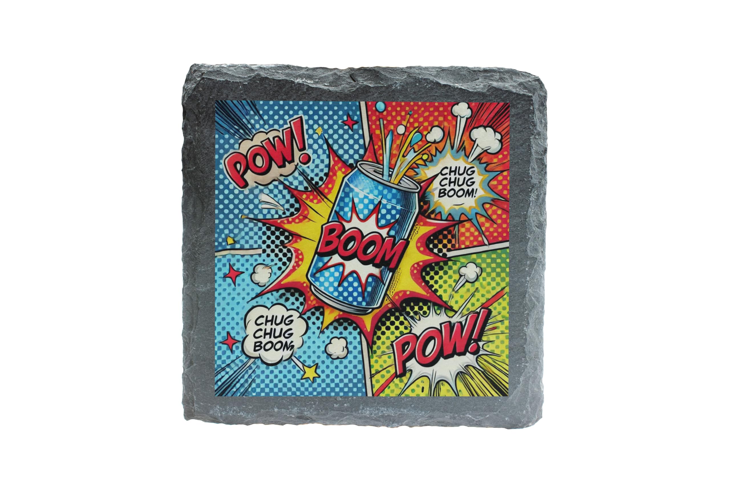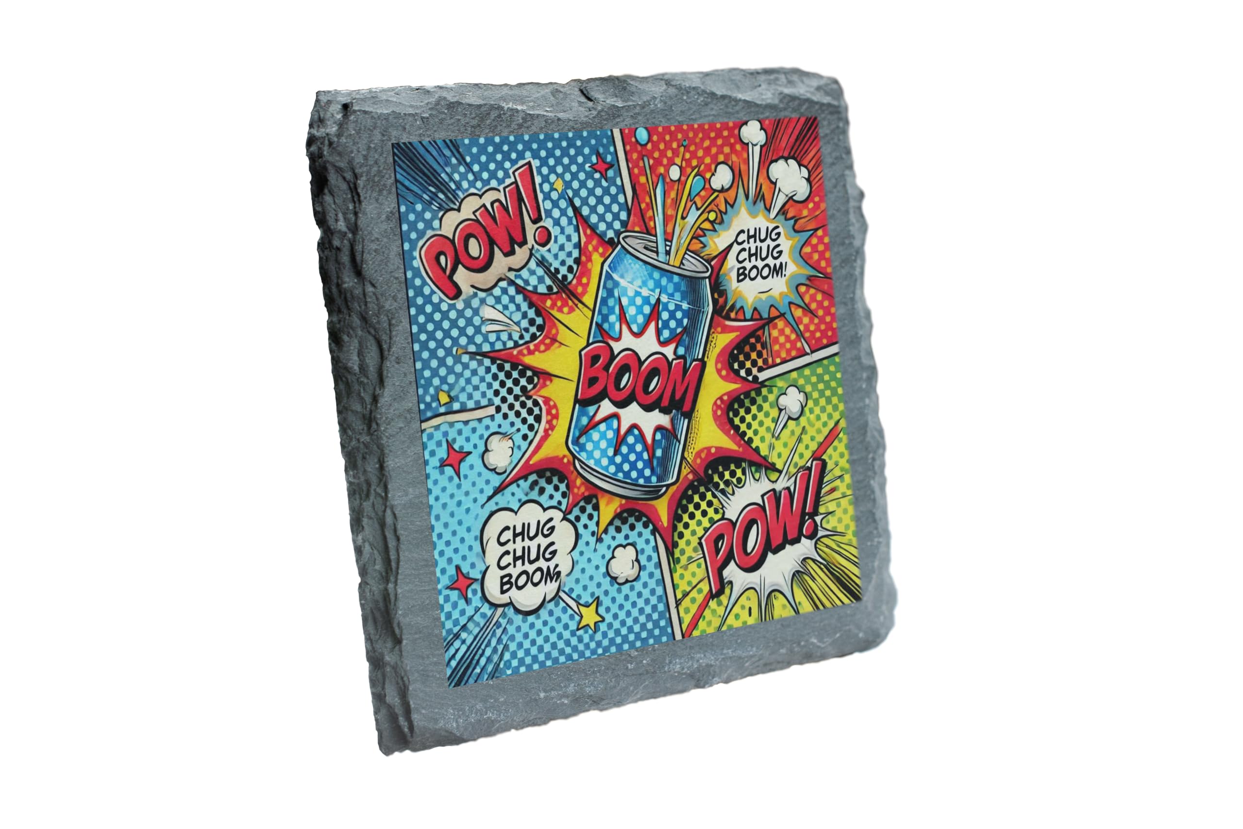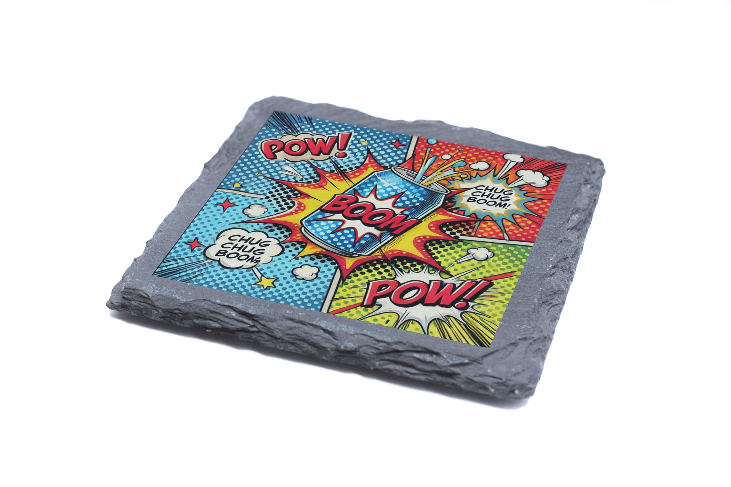 Add a burst of energy to your home or office with the "Comic Boom" Pop Art Slate Coaster! This retro-inspired drink coaster showcases a bold and vibrant comic-style design, complete with classic "Pow!" and "Boom!" text graphics. Crafted from durable natural slate, this coaster not only protects your furniture but also makes a dynamic decorative statement. Whether you?re a comic fan, a lover of pop art, or someone who appreciates unique home accessories, this coaster is sure to impress. Its vibrant print and rustic slate edges make it a standout addition to any table setting or gift list.