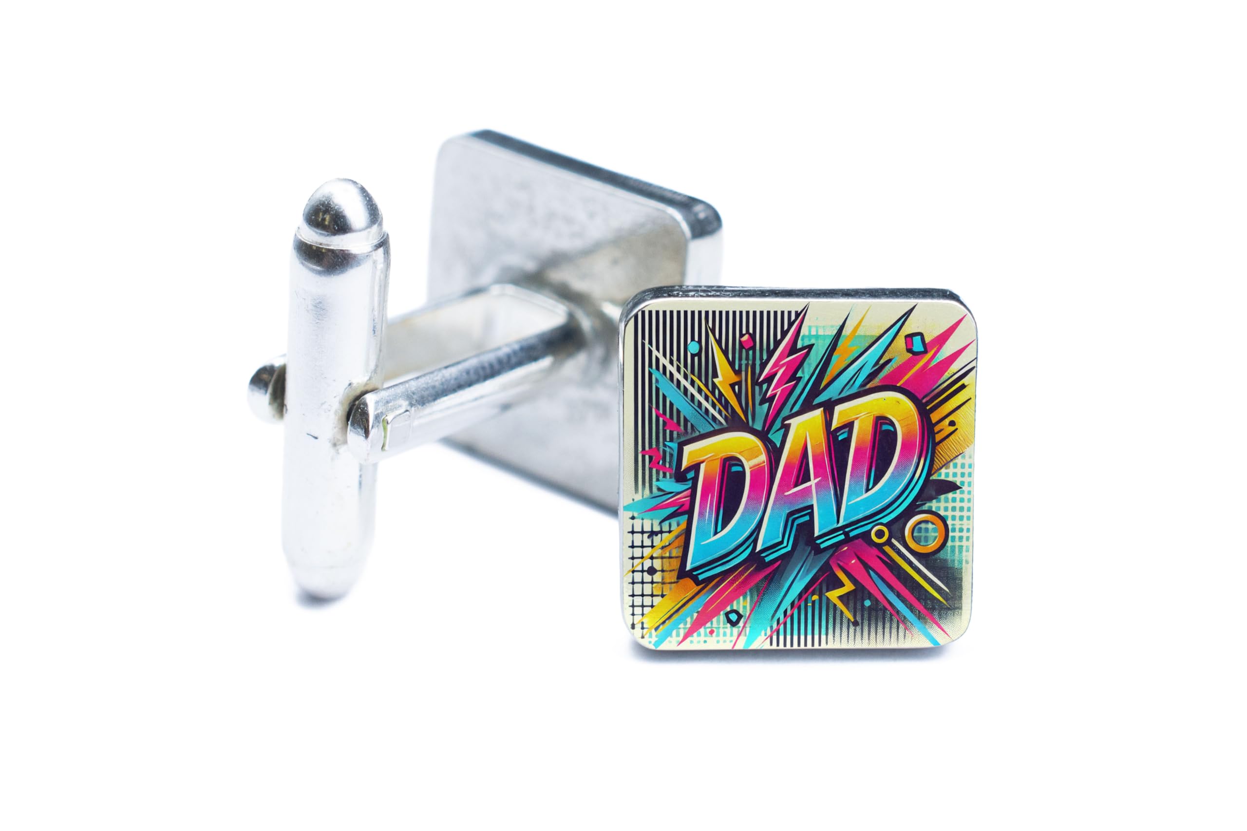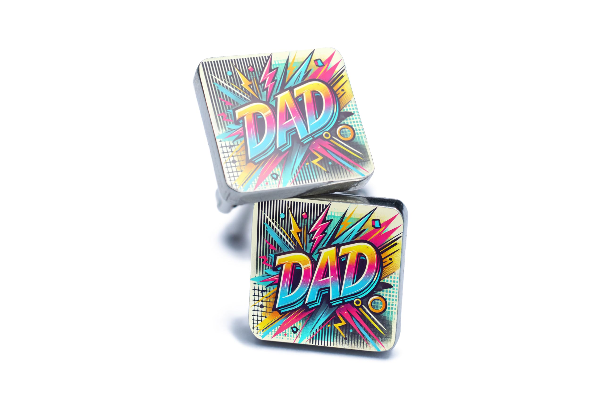 Celebrate the superhero in your life with these comic-inspired "Dad" cufflinks. Featuring a vibrant and dynamic design straight out of a comic book, these cufflinks are the perfect way to show your dad how much he means to you. The bold colors and playful details bring a touch of fun and personality to any formal outfit. Crafted with premium materials and finished with a polished silver look, these cufflinks are built to last while adding an extra flair of style. Whether for Father?s Day, a birthday, or just to say thank you, these cufflinks make a meaningful and fun gift. Presented in a stylish gift box, these cufflinks are ready to surprise and delight. Let your dad shine like the superhero he is with this unique and thoughtful accessory!