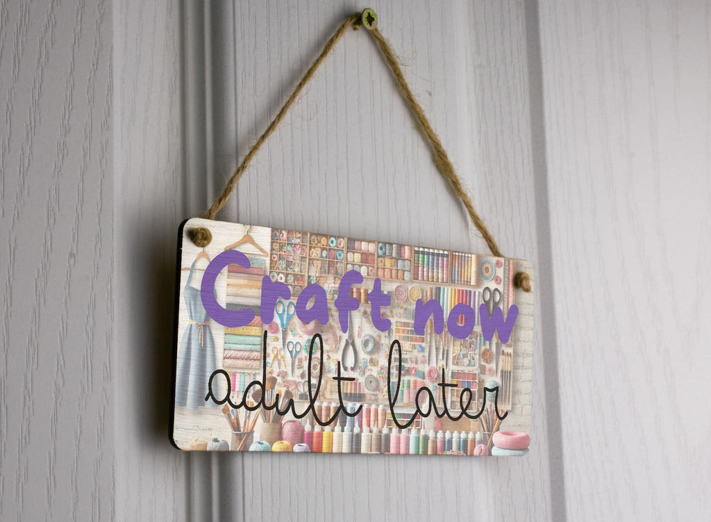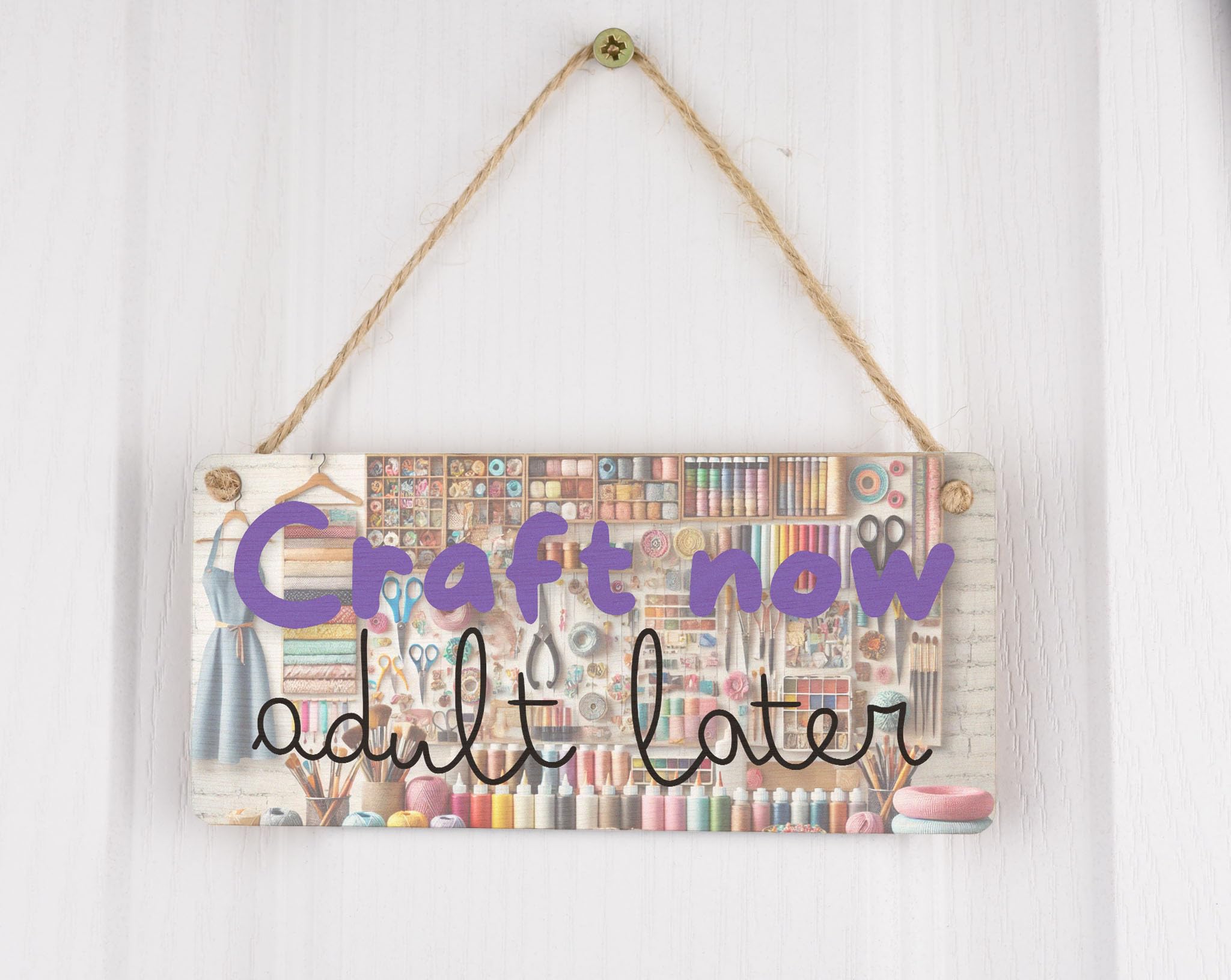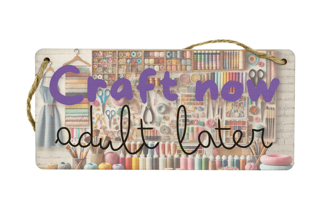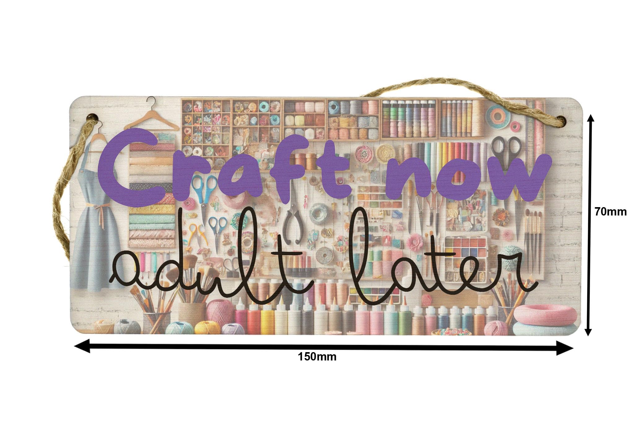 Transform your crafting space into a fun and vibrant haven with our 'Craft Now, Adult Later' Colourful Craft Room Decor Sign. This playful message encourages you to take a break from adulting and dive into the joy of crafting, DIY projects, and creative expression. Featuring a whimsical design showcasing a colourful craft room filled with craft supplies, sewing tools, hobby room essentials, art supplies, yarn and fabric, and craft tools, this sign is the perfect addition to your craft area. The inspirational quote 'Craft Now, Adult Later' will bring a smile to your face and remind you to prioritise your creative passions. This handcrafted lasercut plywood sign is UV printed with a full-colour design using AI-generated art, ensuring a quality finish. Easy to hang with the included twine, this sign is a must-have for anyone who loves to craft and create. Add a touch of humour and creativity to your space with this unique craft room decor sign.