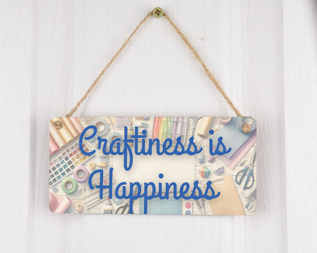 Bring a splash of colour and inspiration to your crafting space with our 'Craftiness is Happiness' hanging sign. This beautiful sign is perfect for anyone who loves craft-themed decor and wants to create a welcoming and artistic workspace. The full-colour design features a watercolour-style crafting table with supplies such as scissors and glue, making it the ideal addition to any hobby room. Crafted from quality plywood and laser cut for precision, this sign is hand-finished with UV printed AI-generated art to ensure a vibrant and long-lasting finish. The positive message 'Craftiness is Happiness' will motivate and inspire you as you work on your DIY projects and handmade crafts. Whether you're a seasoned crafter or just starting out, this sign is sure to add a touch of creativity and joy to your craft room decor. Each sign comes with twine for easy hanging, making it a versatile and charming addition to any artistic space.