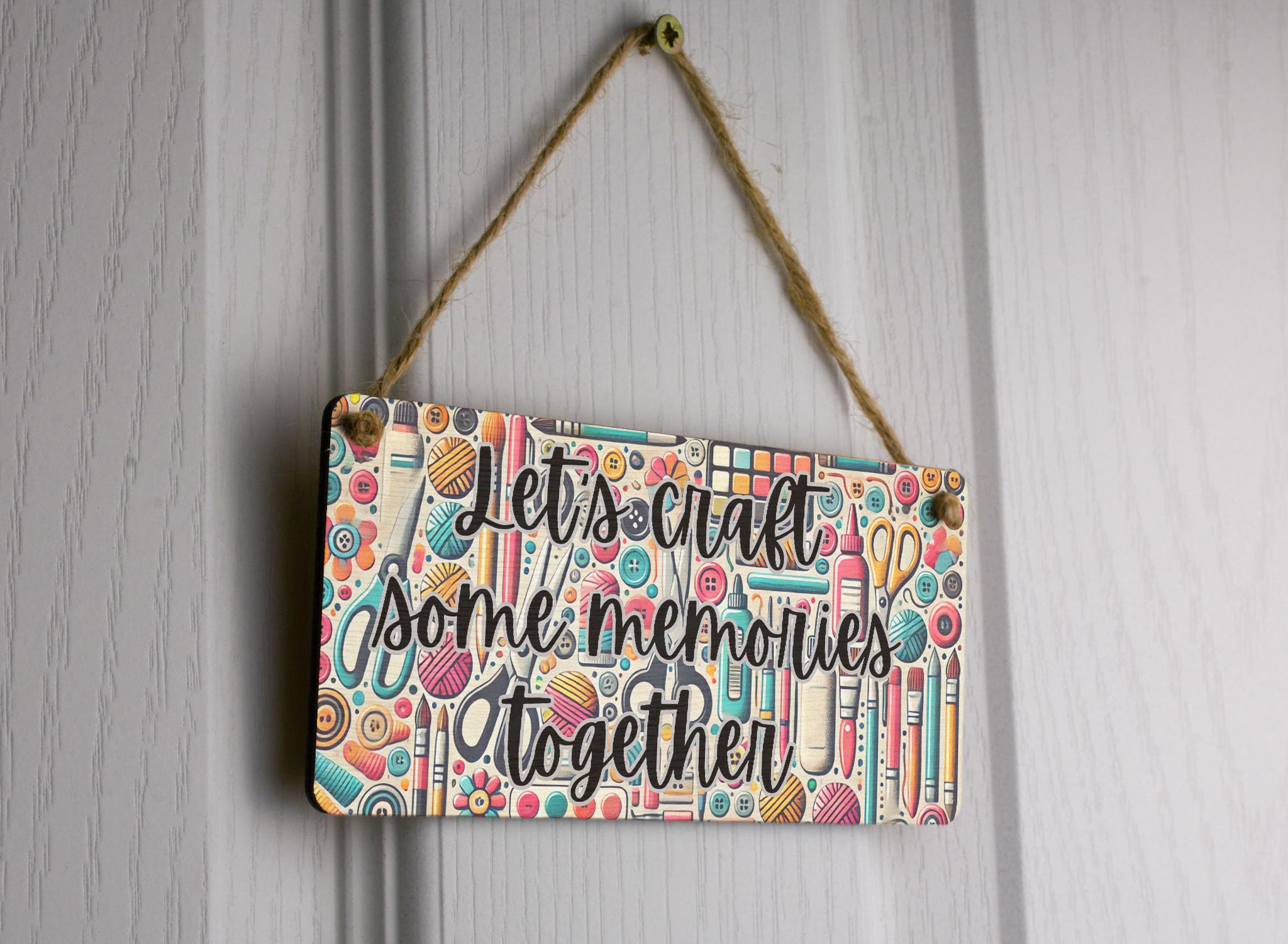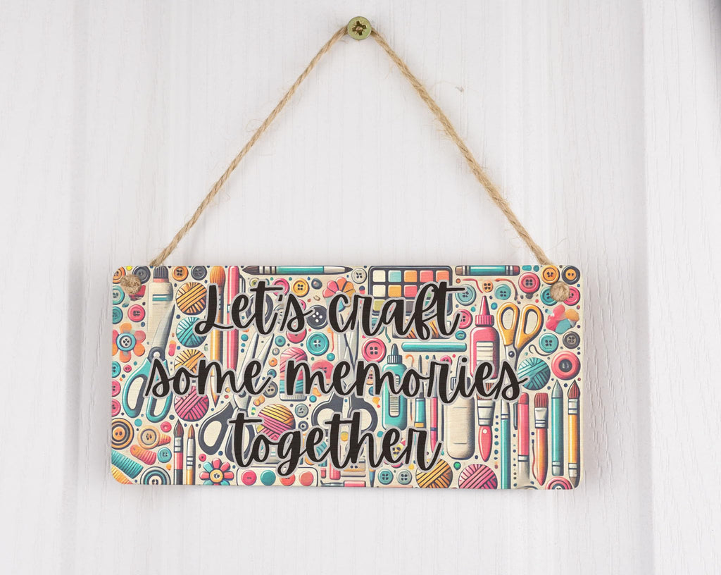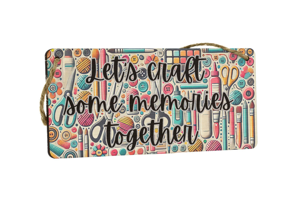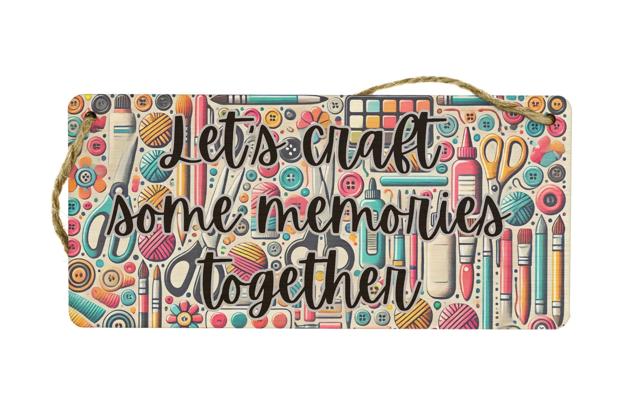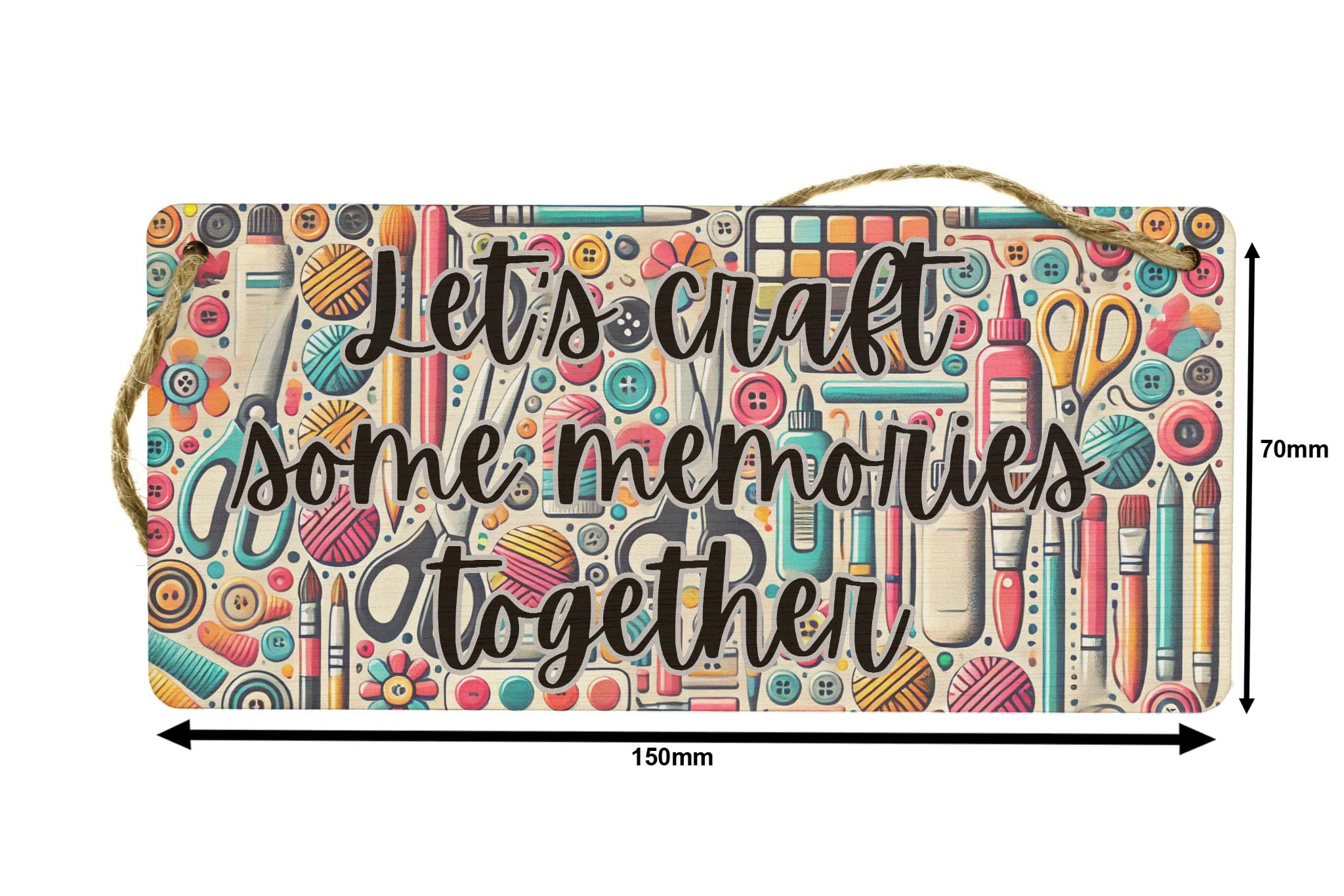 Create beautiful memories with your loved ones with this stunning 'Crafting Memories Together' colourful artistic plywood sign. This DIY craft kit is perfect for unleashing your creativity and spending quality time with family and friends. Featuring a vibrant full-colour design showcasing a background filled with various art supplies like scissors, paintbrushes, buttons, and glue, this inspirational hanging sign reads 'Let's craft some memories together'. Craft room decor has never looked better with this handcrafted laser-cut plywood sign, making it a perfect addition to your creative space. The AI-generated art and UV printed design ensures a quality finish, while the included twine makes it easy to hang and display your masterpiece. Whether you're a seasoned crafter or just starting out, this artistic plywood sign is sure to bring joy and inspiration to your hobby.