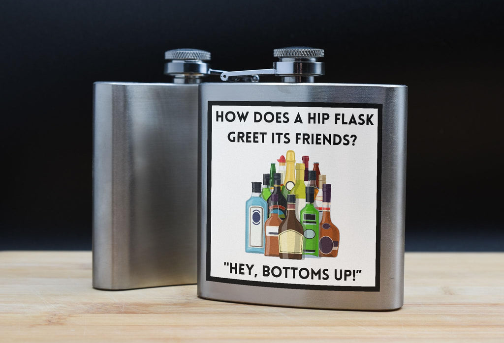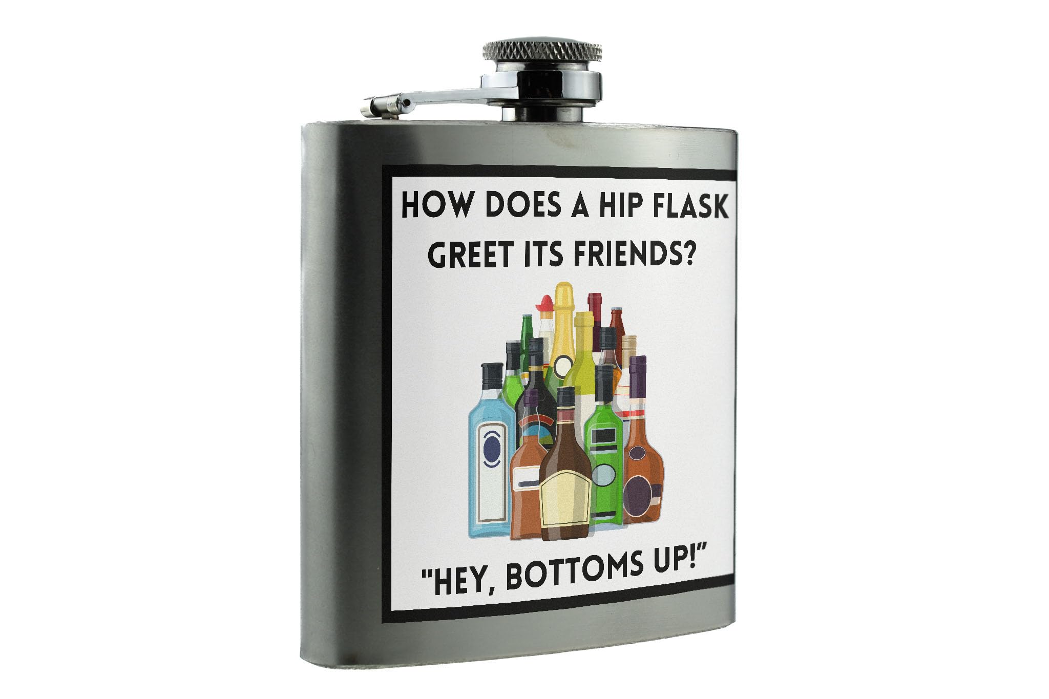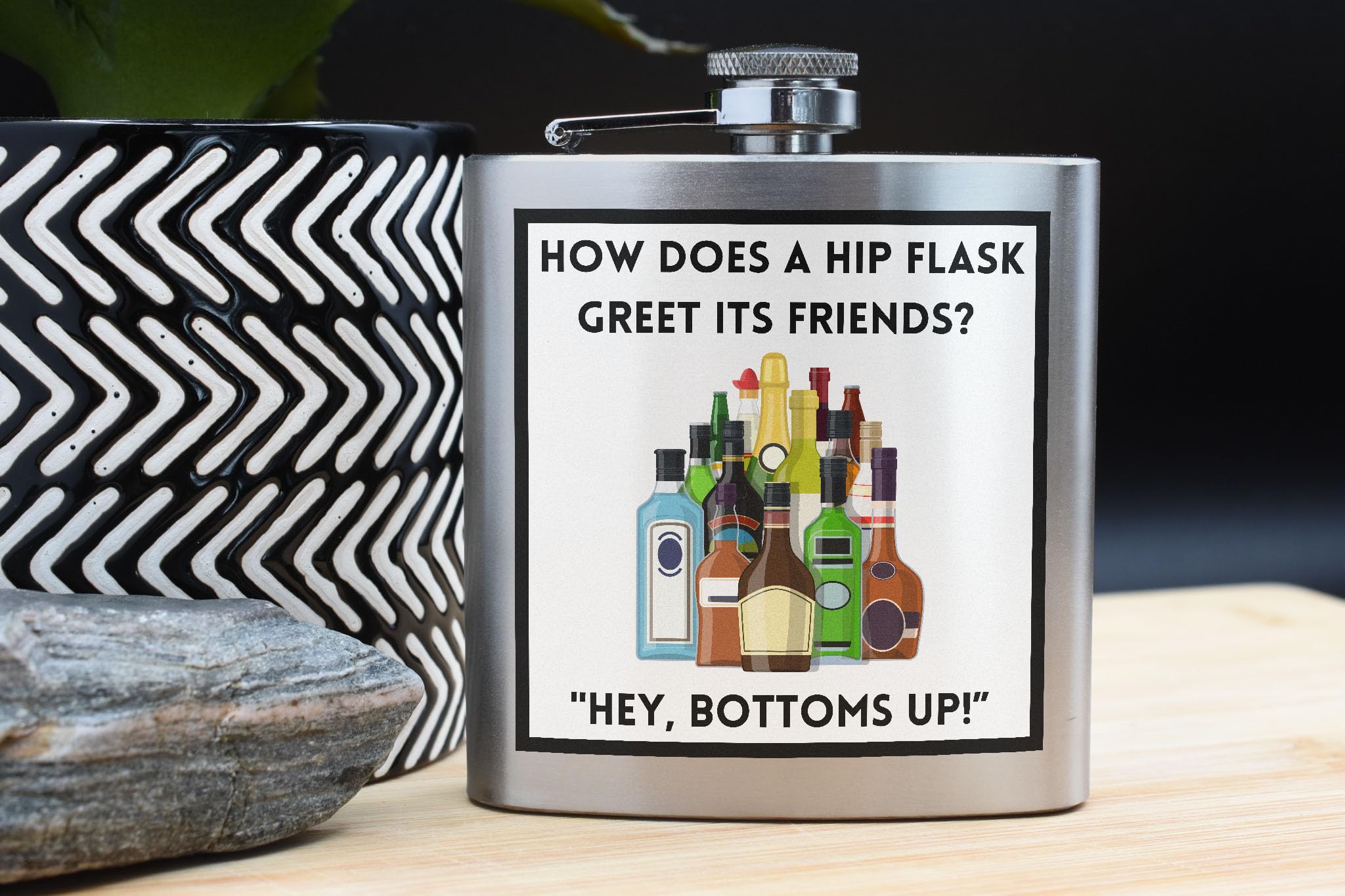 - Features a full-color design with a bad joke that reads: 'how does a hipflask greet its friends? hey bottoms up!'