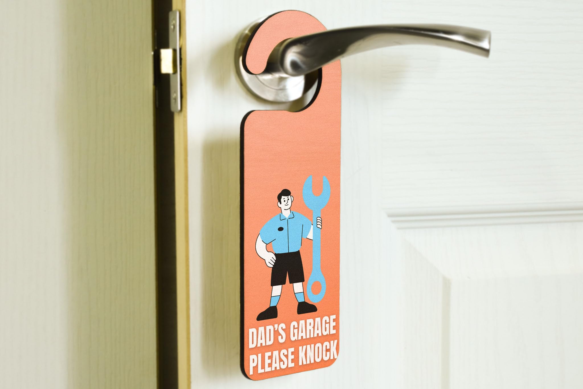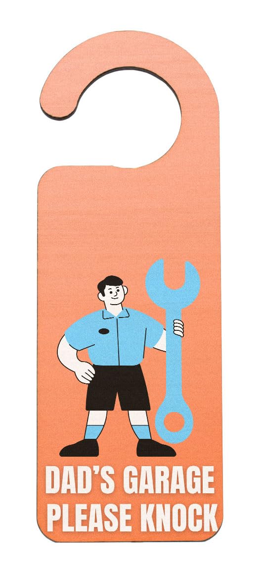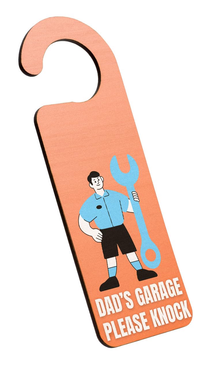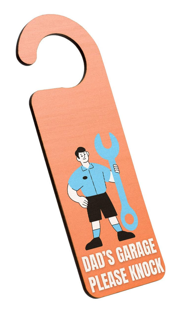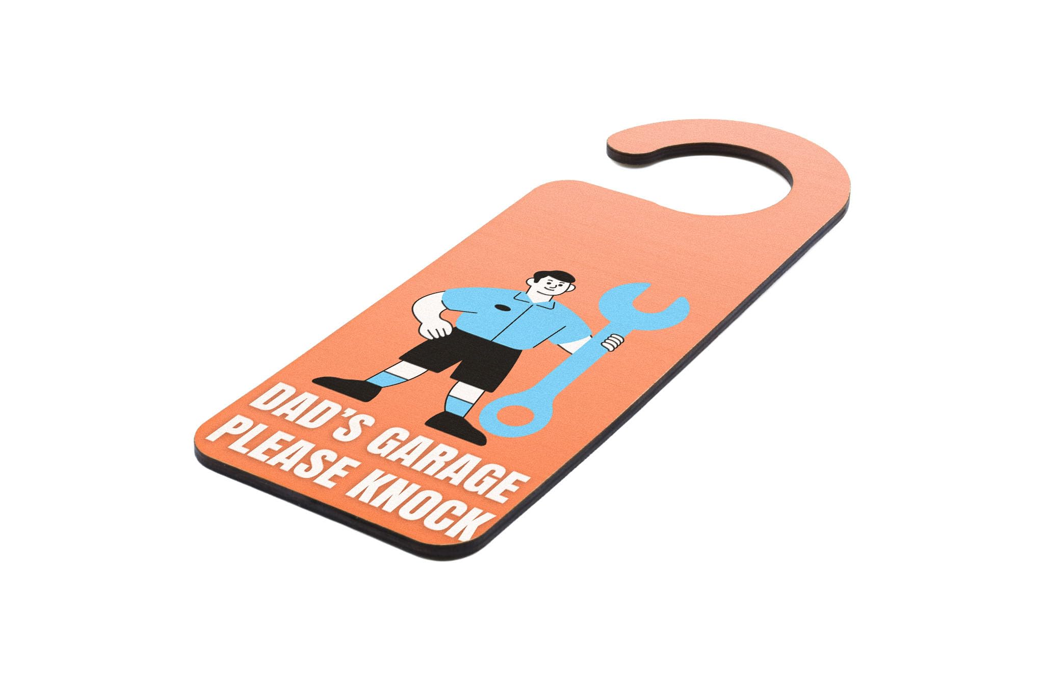 Introducing our Dad's Garage Please Knock Door Hanger, the perfect addition to any man cave or DIY space! This handmade laser cut plywood product features a full colour design with a simple orange tool graphic, making it the ideal workshop sign for Dad's workspace. This unique garage decor piece serves as a warning sign to visitors, kindly asking them to knock before entering Dad's repair shop. Add a touch of personality to your garage entry with this 'Do not disturb' door hanger, prioritising Dad's privacy and letting everyone know that this is his domain. Give your handy dad the gift of a personalised mechanic sign that shows off his love for all things DIY.