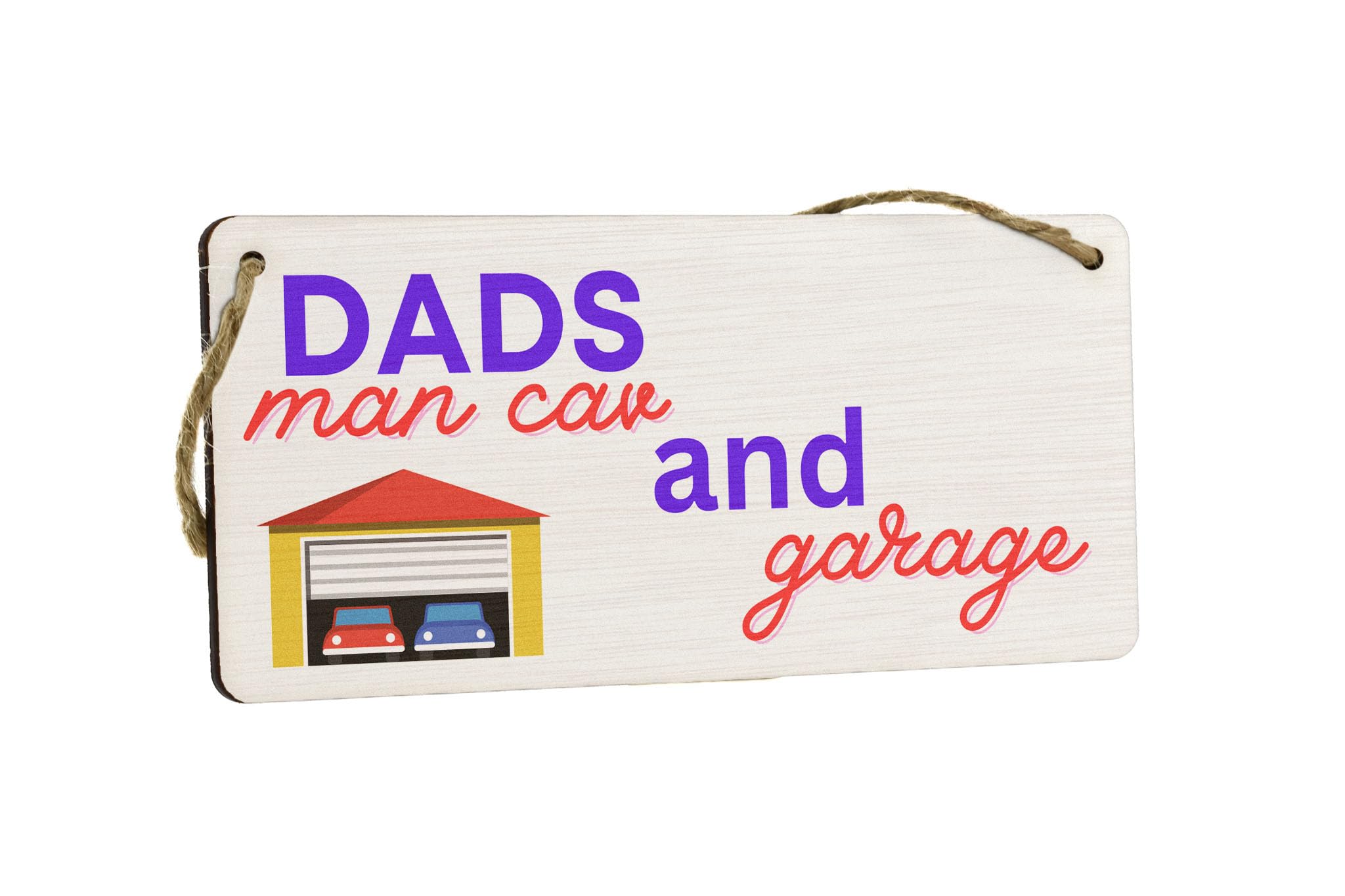 Add a touch of character to your dad's man cave or garage with this Dad's Man Cave and Garage - Plywood Hanging Sign. This novelty sign is the perfect Father's Day gift for all the hardworking dads out there. With its full colour design, it features an image of a garage with cars, creating a vibrant and eye-catching display. The sign is made from quality plywood and comes with a cream background, complemented by purple and red writing that reads 'Dad's Man Cave and Garage'. Hang it up on the wall or door to instantly upgrade any room's decor. Whether it's for your dad or a friend who is a proud father, this plywood hanging sign is sure to bring a smile to their face.