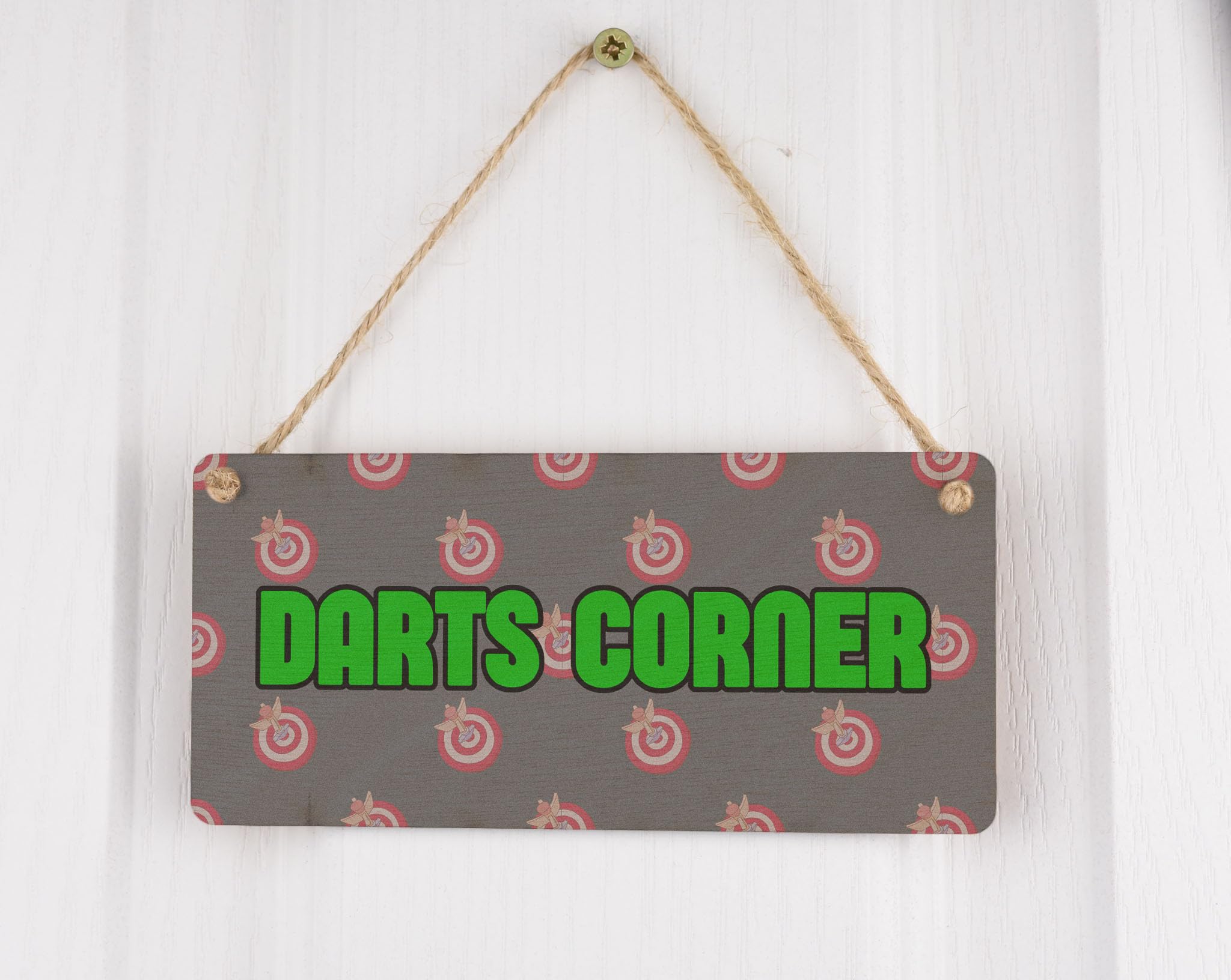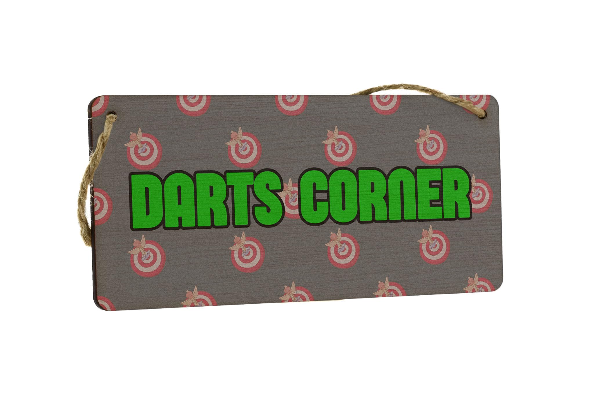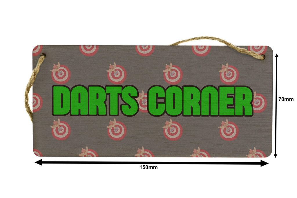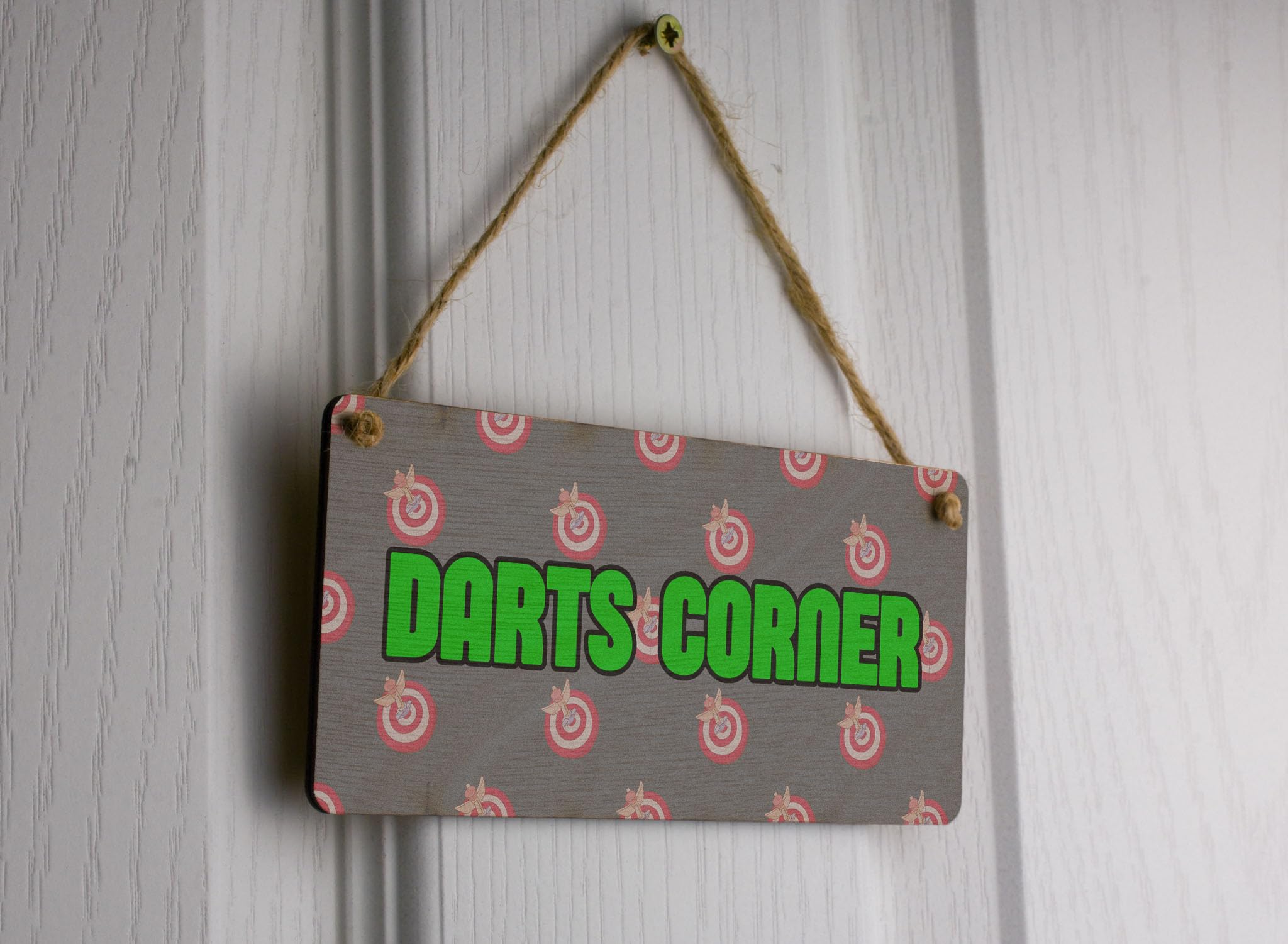 Add a touch of dartboard excitement to your home decor with this Darts Corner - Plywood Hanging Sign. Made from quality plywood, this room sign is designed to be hung on walls, doors, or any other desired location. With its eye-catching design featuring dart boards pattern on a brown background and green writing, this sign is perfect for darts fans and enthusiasts. Whether you want to spruce up your home, bar, or game room, this bar sign is a great addition. It adds a fun and unique touch to any space and is sure to be a conversation starter. Its full-colour design and durable construction ensure long-lasting use and enjoyment. This hanging sign also makes a fantastic novelty gift for your loved ones. Surprise your husband, wife, girlfriend, boyfriend, son, daughter, or siblings who are darts enthusiasts with this unique and thoughtful present. They will appreciate the personalised touch and the nod to their favourite game.