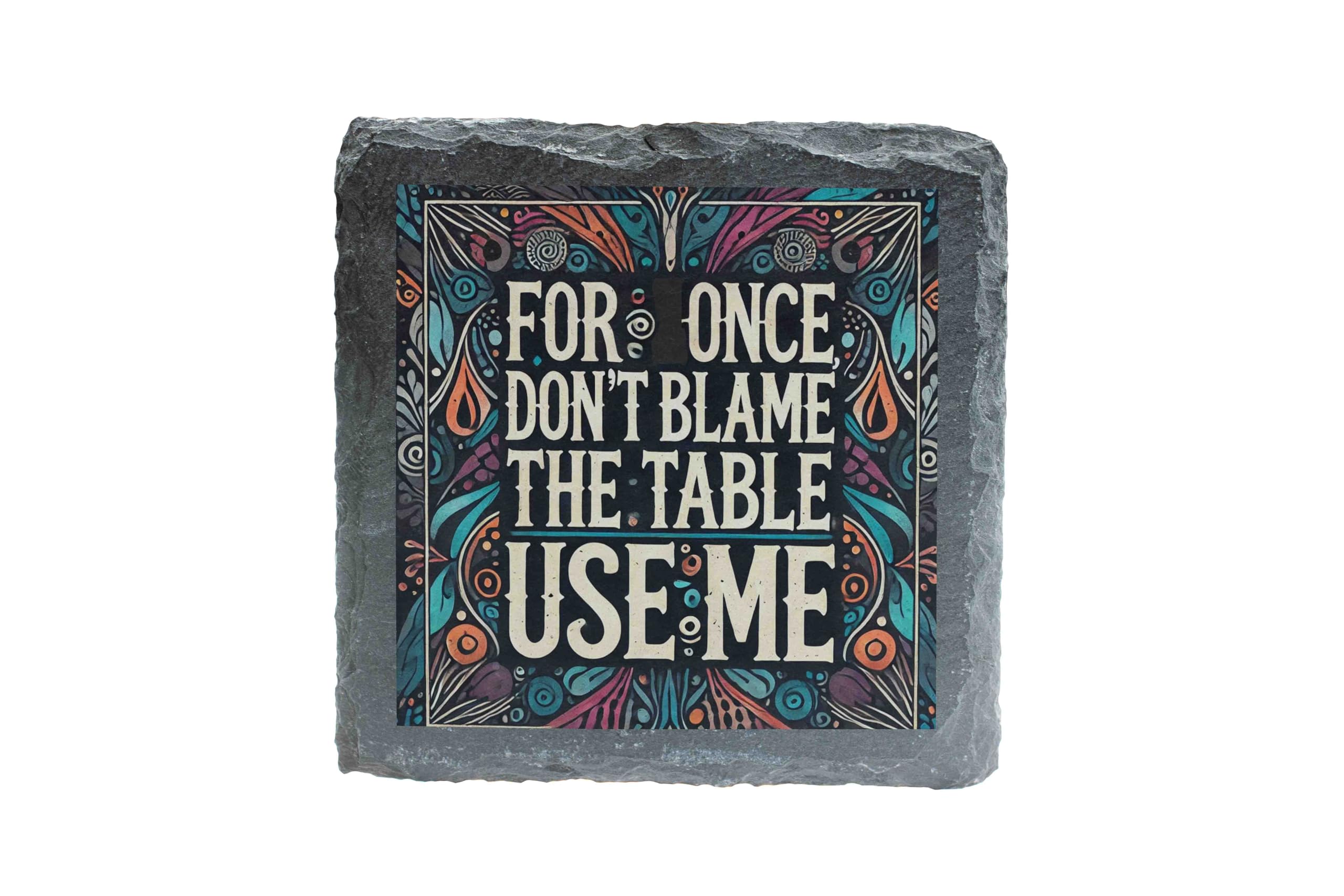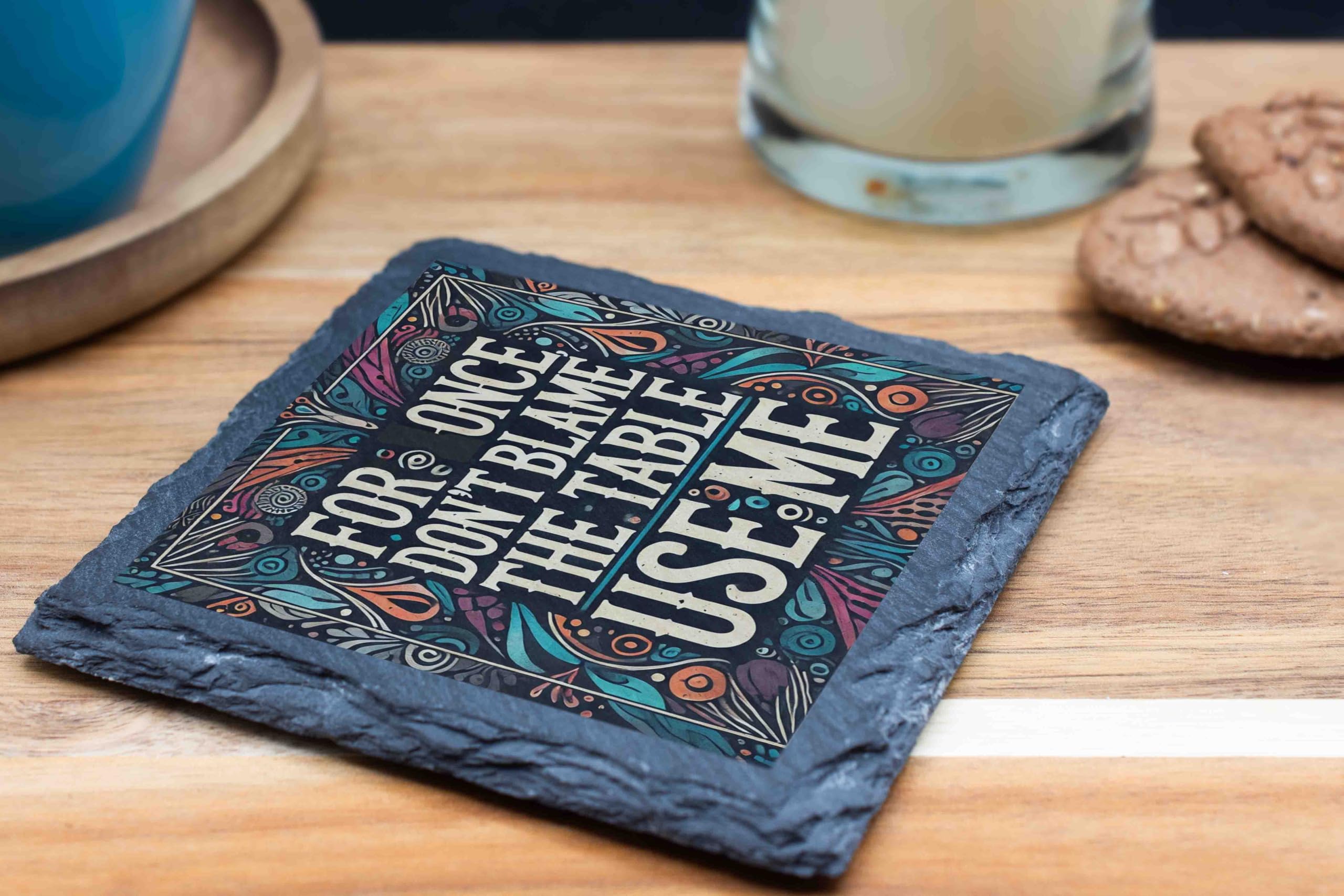 Add charm and functionality to your living space with this stylish slate coaster featuring the playful phrase, "Don't Blame the Table, Use Me." The intricate colorful design creates a striking centerpiece for your coffee table or workspace, while its durable slate material ensures your surfaces remain scratch and spill-free. This unique coaster blends humor with practicality, making it the perfect gift for friends and family. Whether you're sipping your morning coffee or hosting a party, this coaster is a delightful conversation starter and a must-have for anyone who appreciates style with a touch of wit.