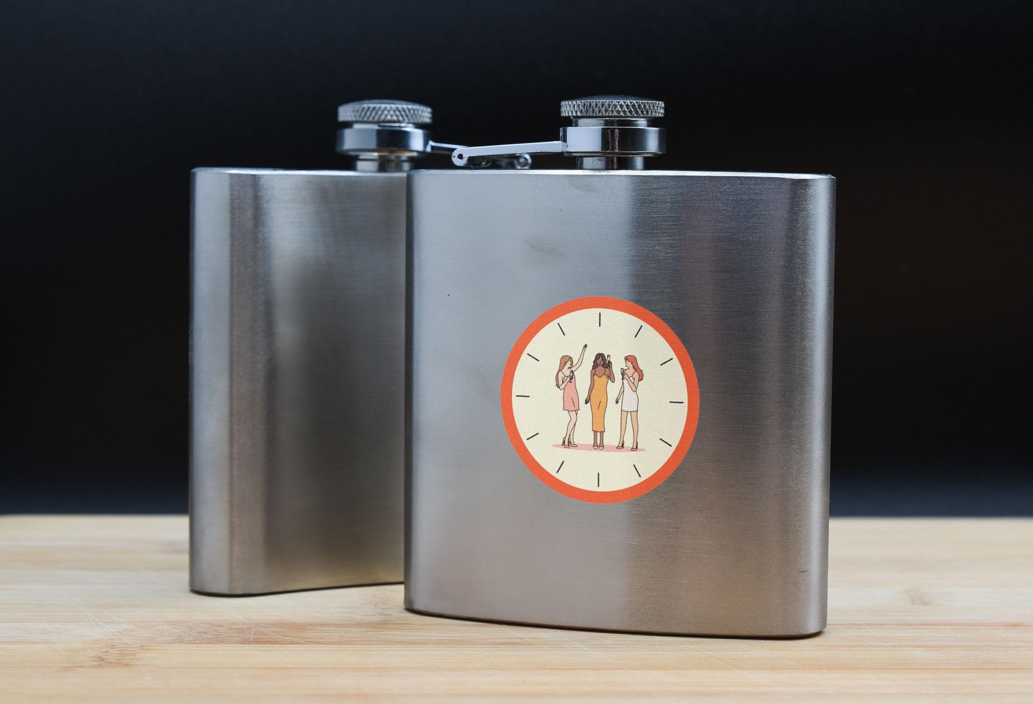 - Features a decorative full colour design with an image of ladies partying and a clock background