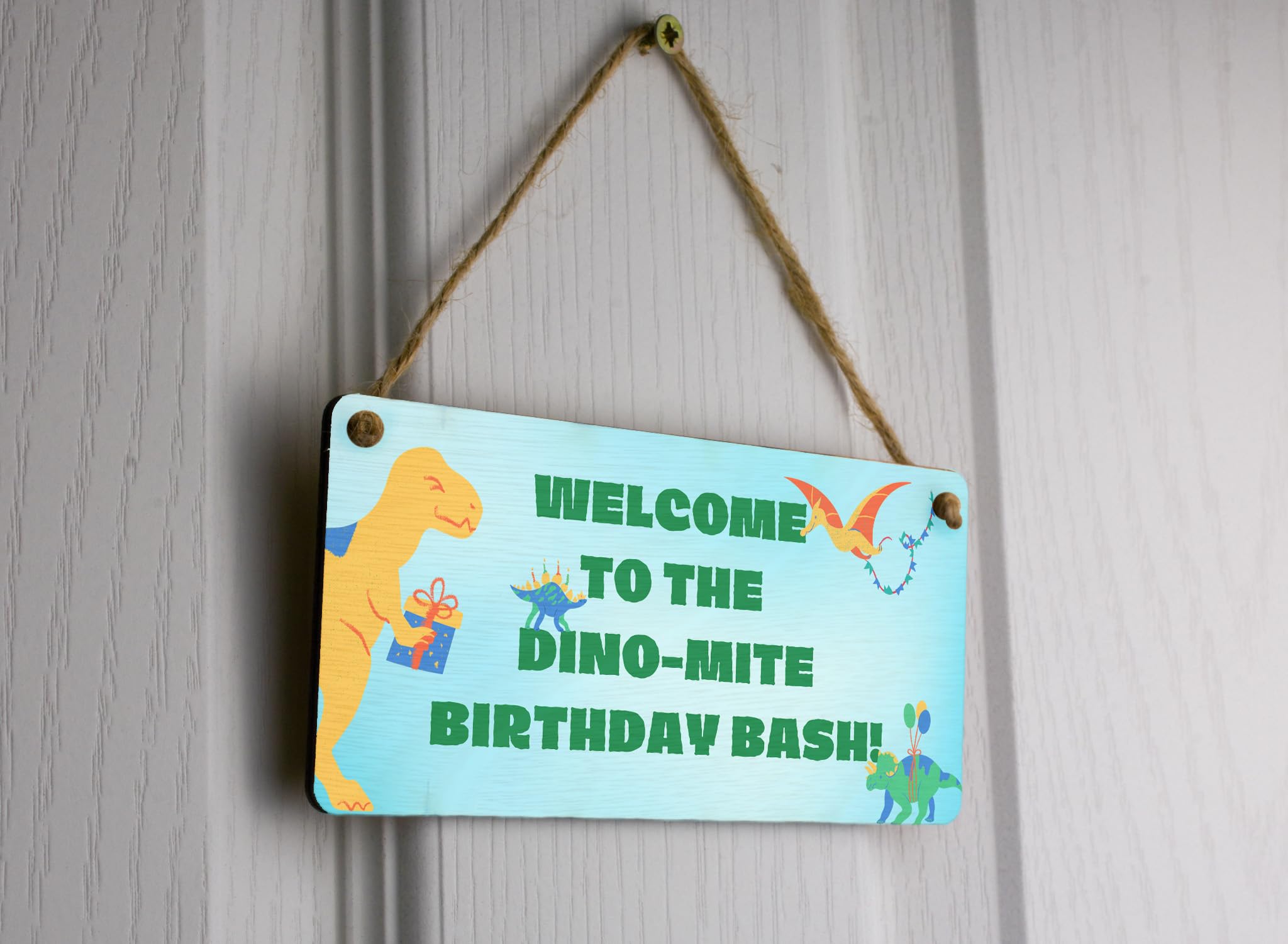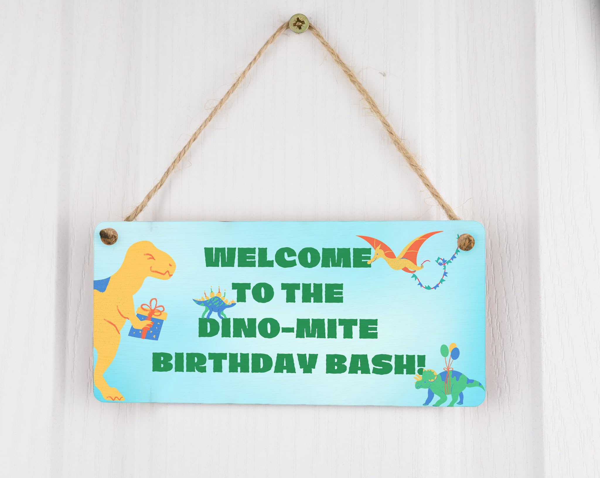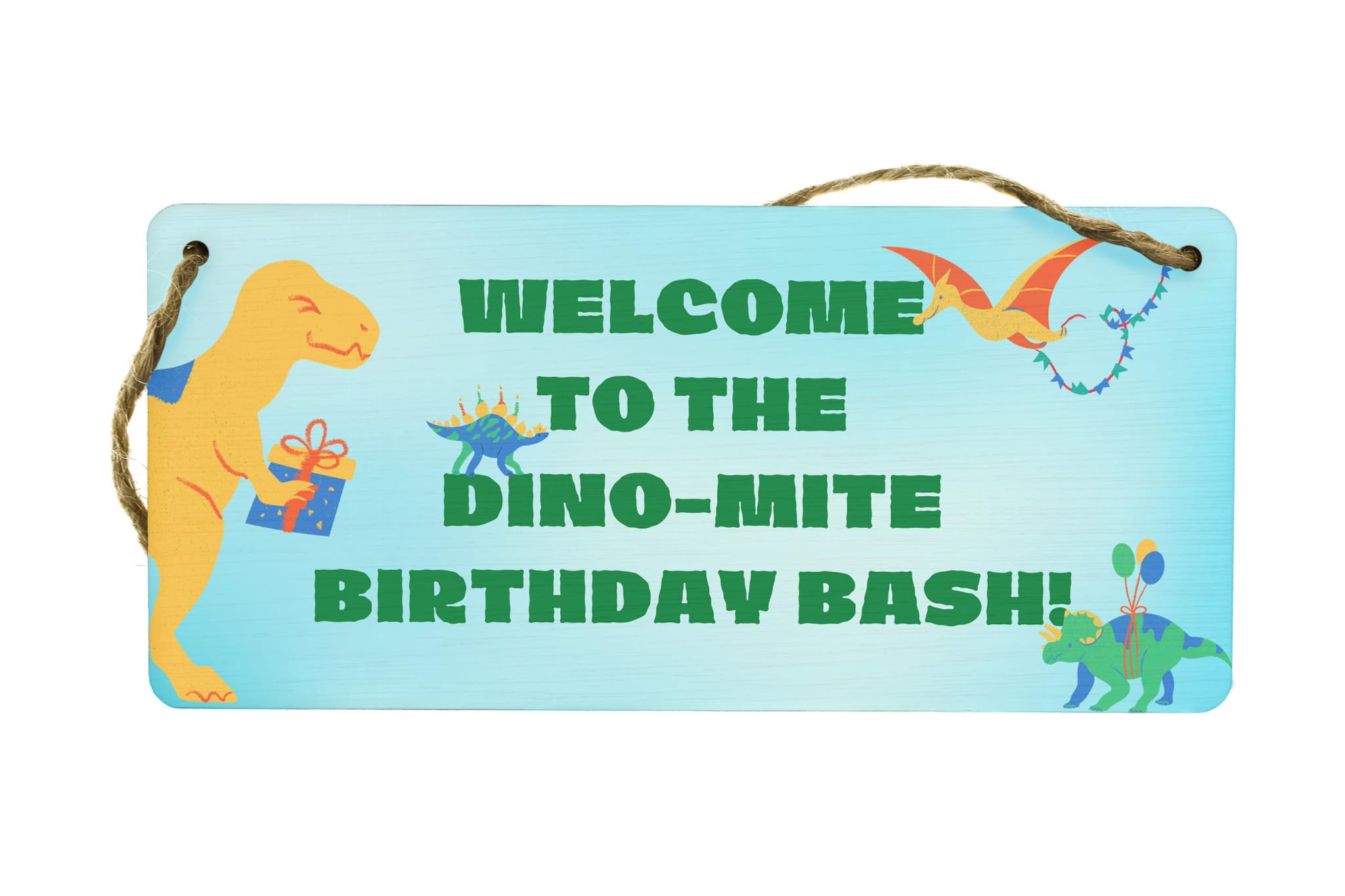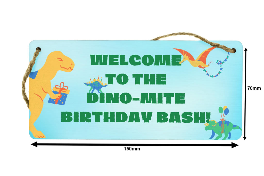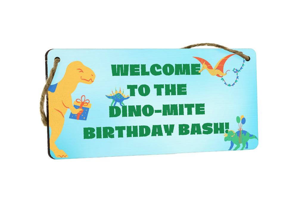 - Reads 'Welcome to the Dino-mite Party' for a warm welcome
