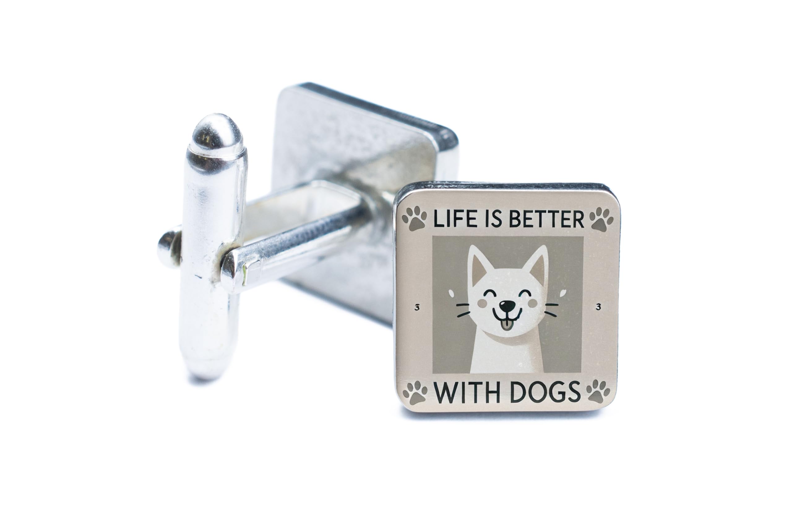 ### Product Title: "Dog Lover's Cufflinks ? 'Life is Better with Dogs' Design" --- ### Bullet Points: - **Adorable Design**: Features a cheerful dog illustration with the heartfelt phrase "Life is Better with Dogs." - **High-Quality Material**: Crafted with durable, polished metal for a sophisticated finish. - **Perfect for Dog Enthusiasts**: A must-have accessory for anyone who loves dogs and celebrates the joy they bring. - **Gift-Ready**: Comes in elegant packaging, making it an ideal gift for birthdays, holidays, or special occasions. - **Versatile Style**: Perfect for casual or formal wear, adding a touch of personality to any outfit. --- ### Product Description: **Celebrate Your Love for Dogs** Add a playful yet elegant touch to your attire with these charming cufflinks, showcasing a happy dog and the message "Life is Better with Dogs." Designed for dog enthusiasts, these cufflinks are a perfect reminder of the happiness and loyalty that our furry friends bring to our lives. **Sophisticated and Durable** Made with premium-quality materials, these cufflinks feature a sleek and polished finish, ensuring they are both stylish and long-lasting. Whether you?re dressing up for a special event or adding flair to your everyday look, these cufflinks are the perfect choice. **Thoughtful Gift for Dog Lovers** Delight your loved ones with this unique accessory that speaks to their passion for dogs. Packaged in a stylish box, these cufflinks make an excellent gift for any dog lover in your life. Celebrate the bond between humans and their loyal companions with these beautifully designed cufflinks.