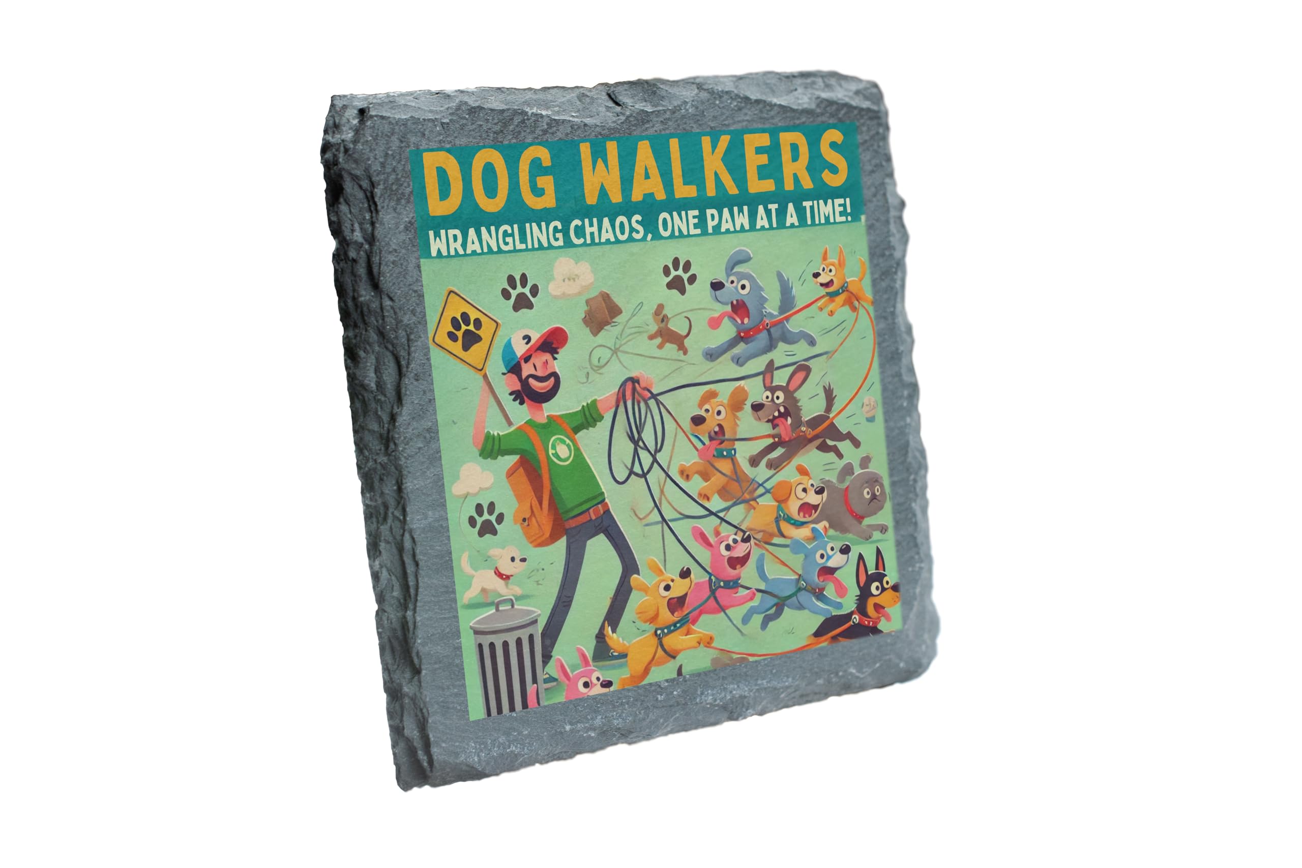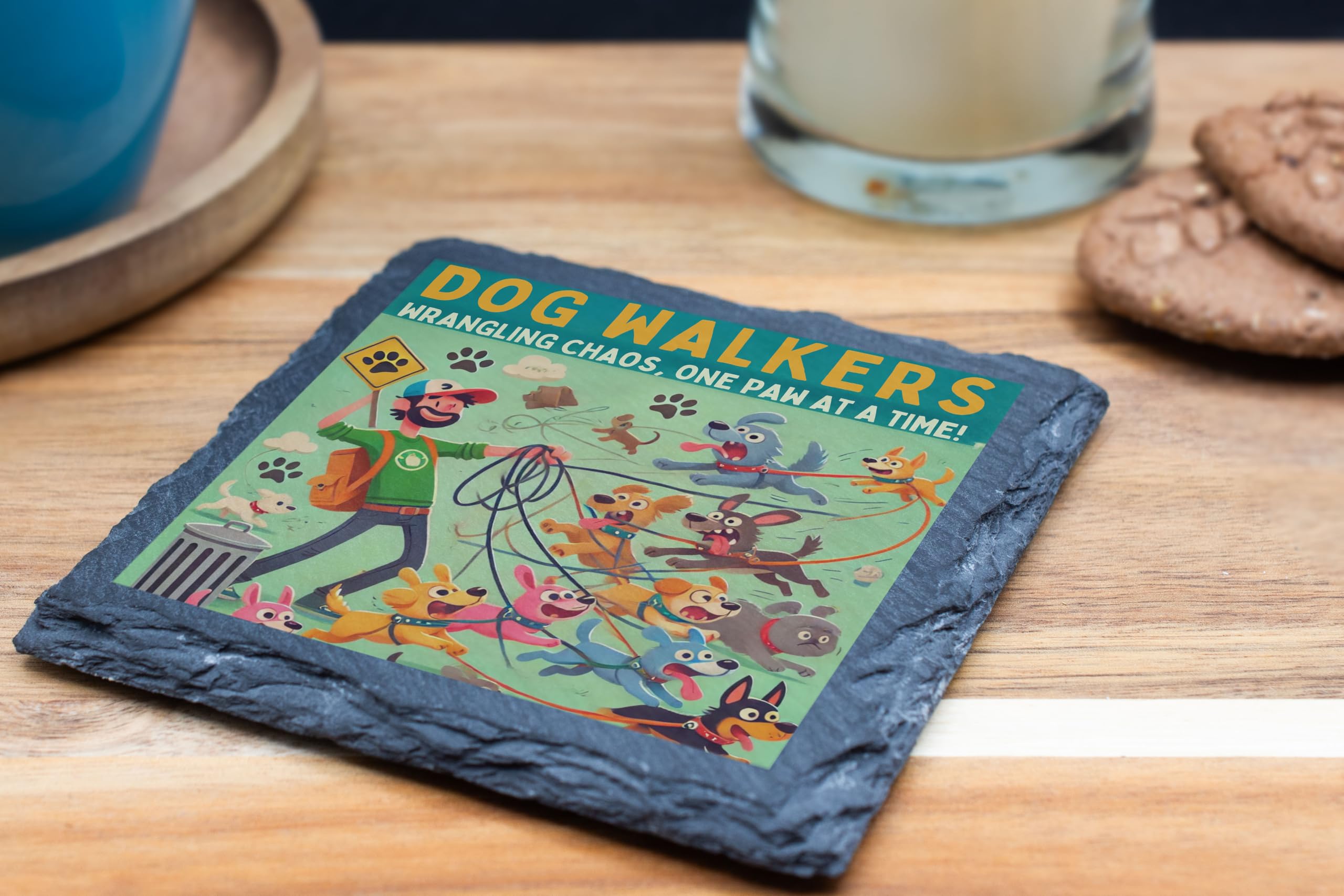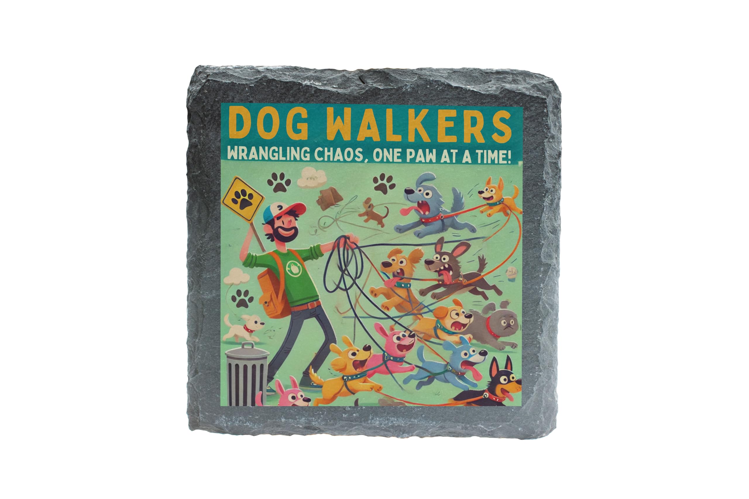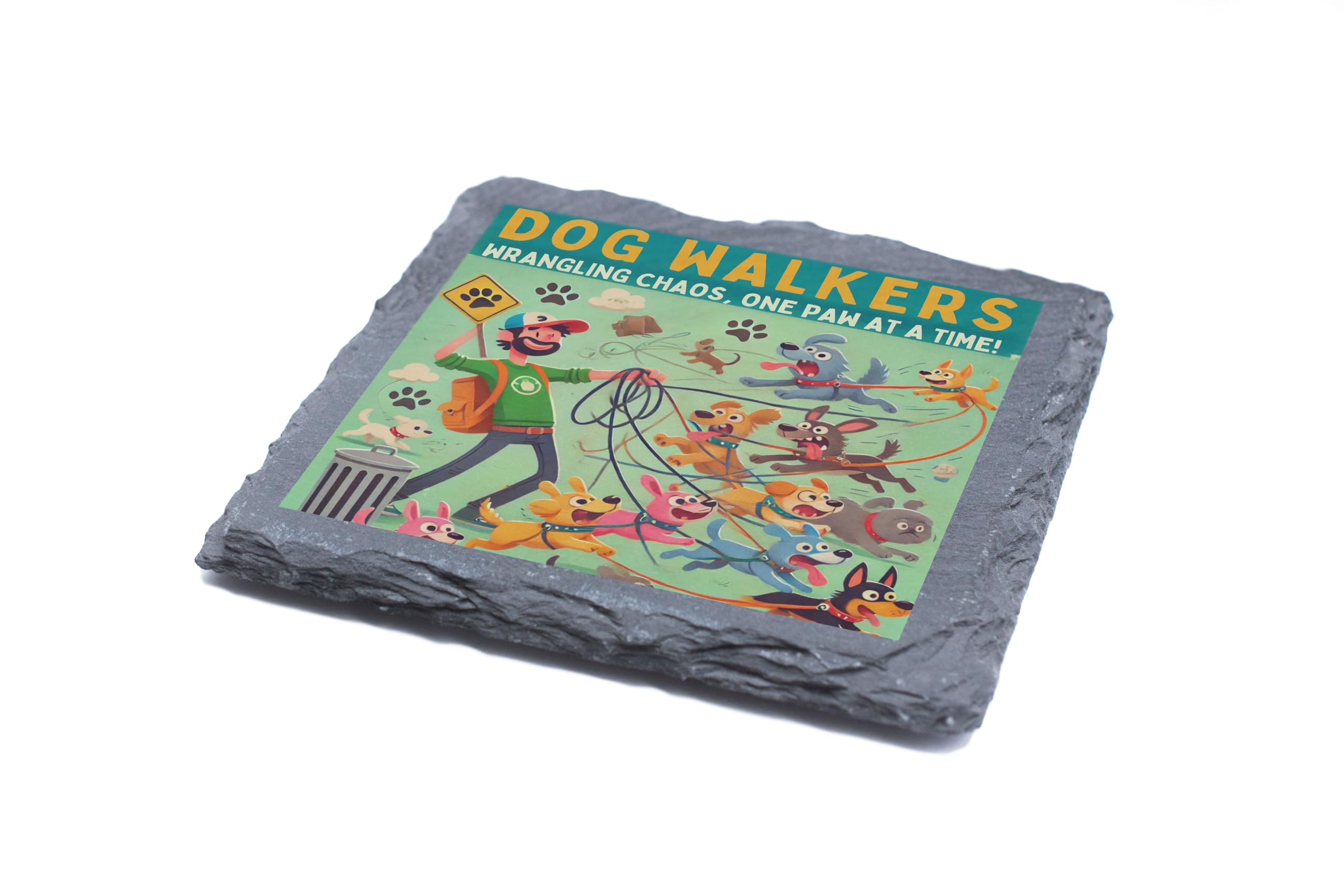 Celebrate the chaos and joy of dog walking with this Dog Walkers-Themed Slate Coaster! Featuring a whimsical and lively illustration of a dog walker managing an energetic pack of pups, this coaster is a playful tribute to the adventures of dog lovers everywhere. The design is paired with the tagline ?Wrangling Chaos, One Paw at a Time!? to bring a smile to every pet parent?s face. Crafted from premium natural slate, this coaster offers a sturdy and stylish solution to protecting your furniture from spills and scratches. Its rustic texture complements both modern and classic home aesthetics, making it a charming addition to any space. Whether you?re looking for a unique gift for a dog walker, pet enthusiast, or your own collection, this coaster is perfect for showcasing your love for four-legged friends.