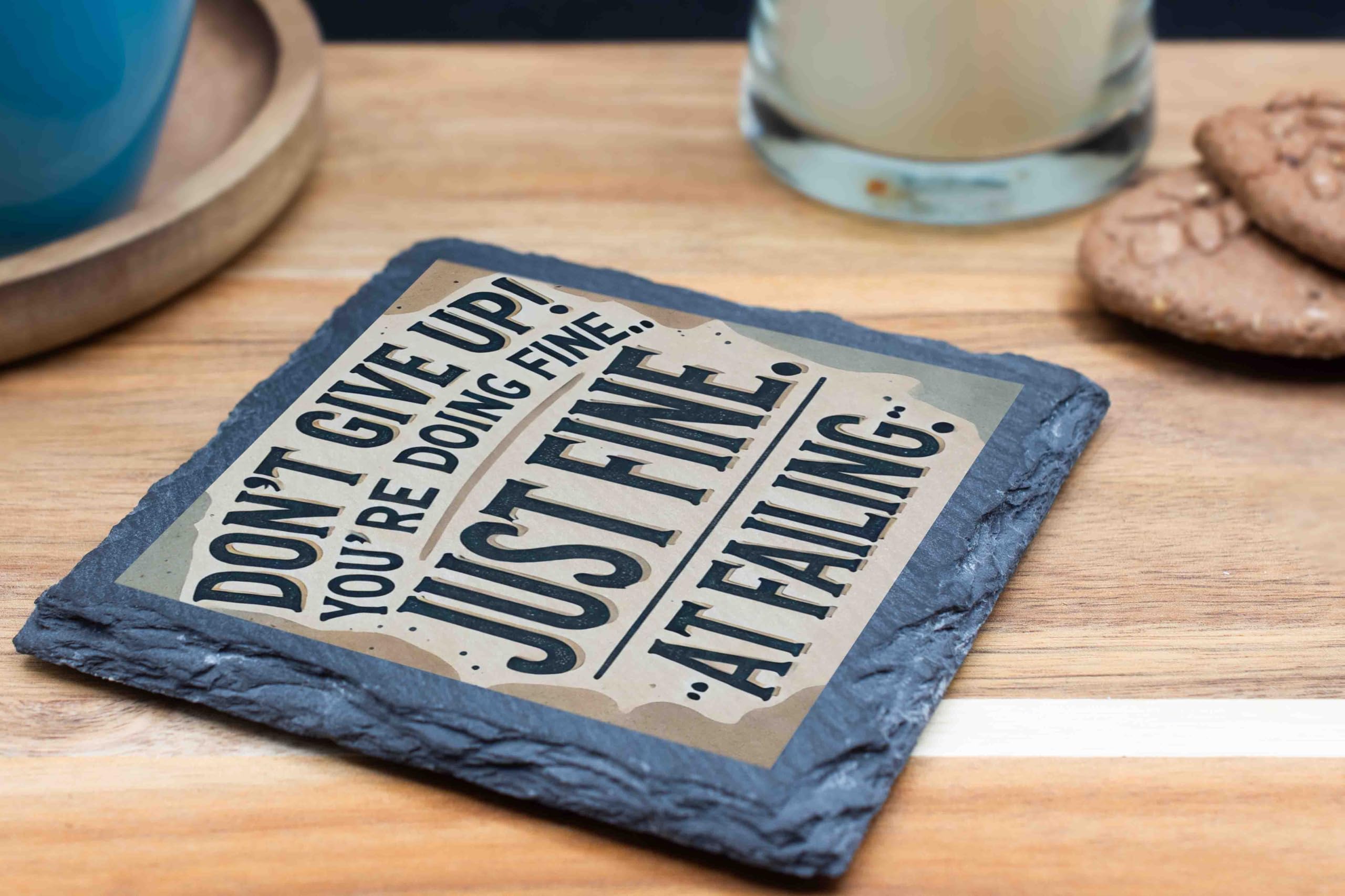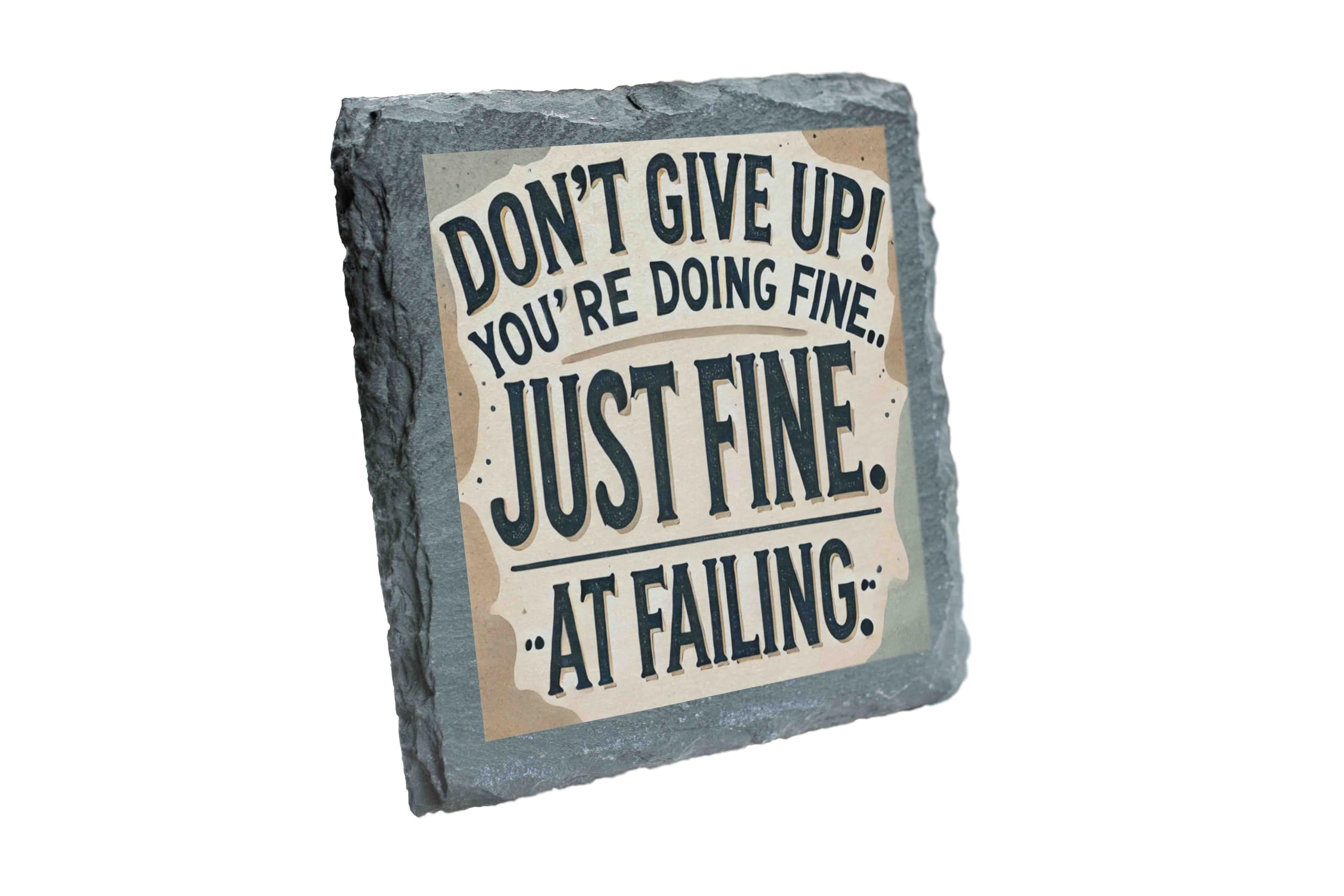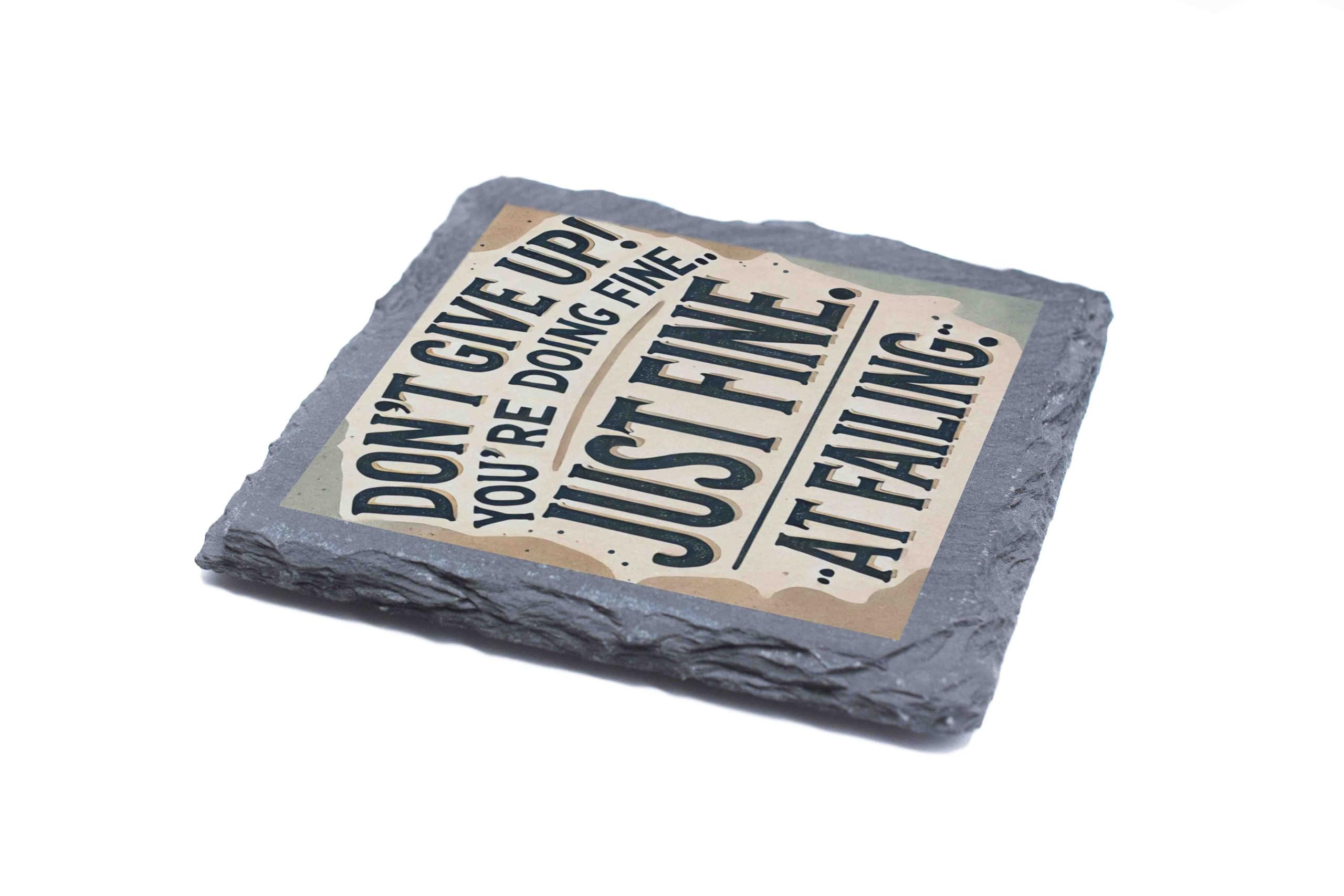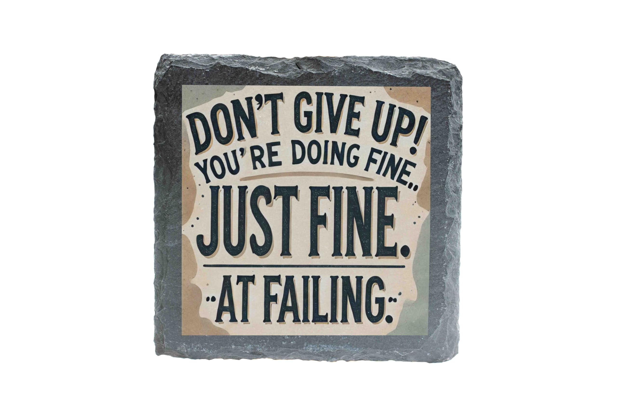 Inject a dose of humor and motivation into your day with the "Don't Give Up! You're Doing Fine... Just Fine at Failing" Slate Coaster. This quirky and relatable design combines a vintage-style aesthetic with a playful message, making it the perfect table accessory to brighten up your space. Crafted from high-quality natural slate with rugged edges, this coaster is as practical as it is decorative. It protects surfaces from heat, moisture, and scratches while adding a unique and witty touch to your d?cor. Whether as a lighthearted gift or a personal addition to your home, this coaster is a delightful way to celebrate life?s imperfections with a smile!