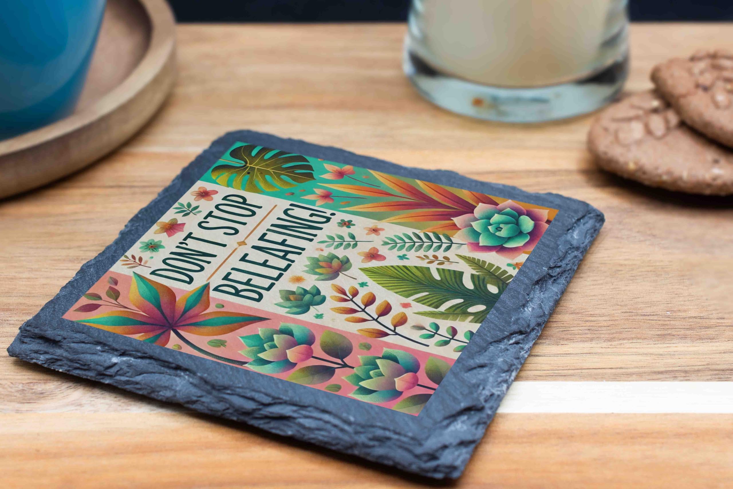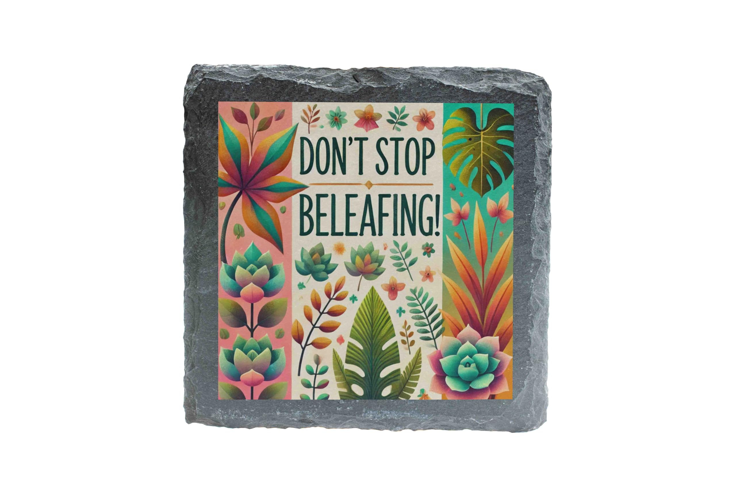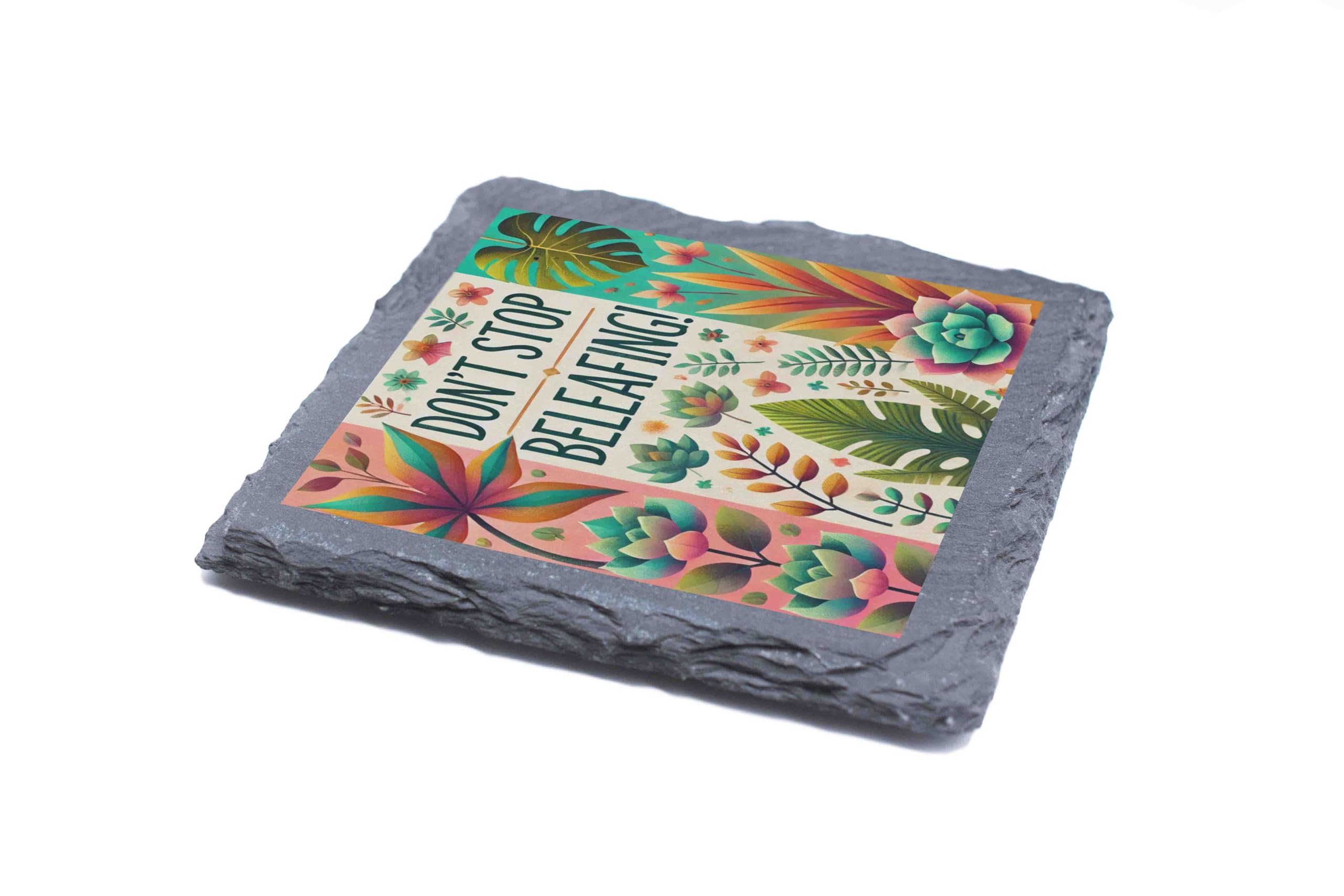 Don't Stop Beleafing Slate Coaster ? Tropical Plant-Themed Design (slco-kf25-beleafinghg)