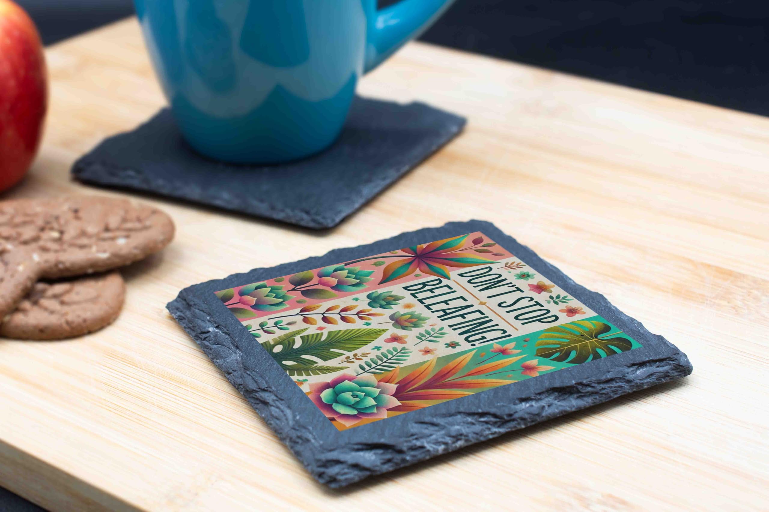 Add a splash of color and positivity to your space with this "Don't Stop Beleafing" Slate Coaster. With its vibrant tropical leaf design and cheerful message, this coaster is perfect for plant lovers and those who appreciate a good pun. Crafted from premium slate with a natural, rugged edge, this coaster provides both protection for your surfaces and a delightful accent to your decor. Whether you're sipping coffee, tea, or tropical cocktails, this coaster is a stylish and functional addition to your home or office. It also makes a great gift for plant parents or anyone who could use a dose of encouragement and color in their life.