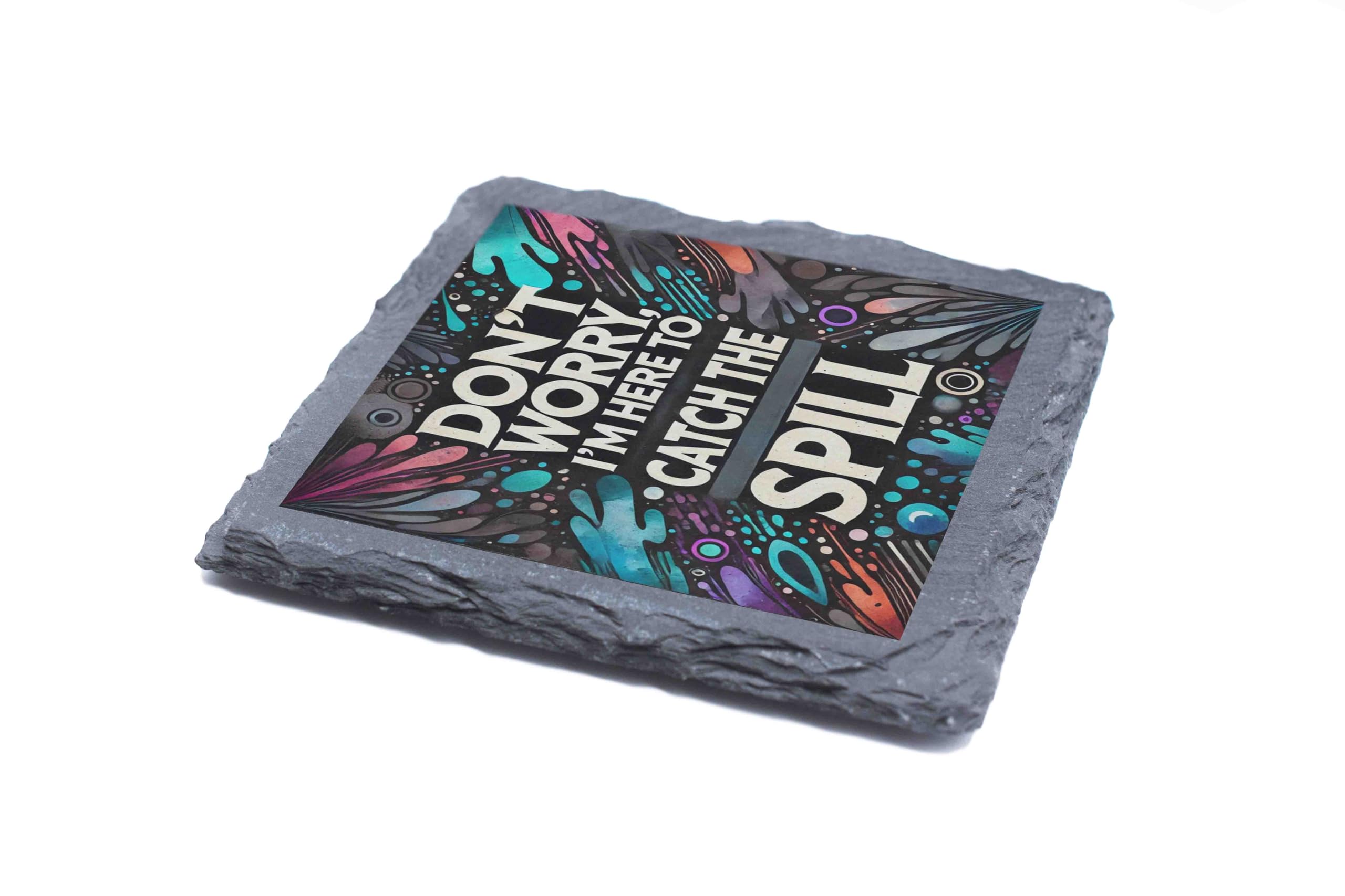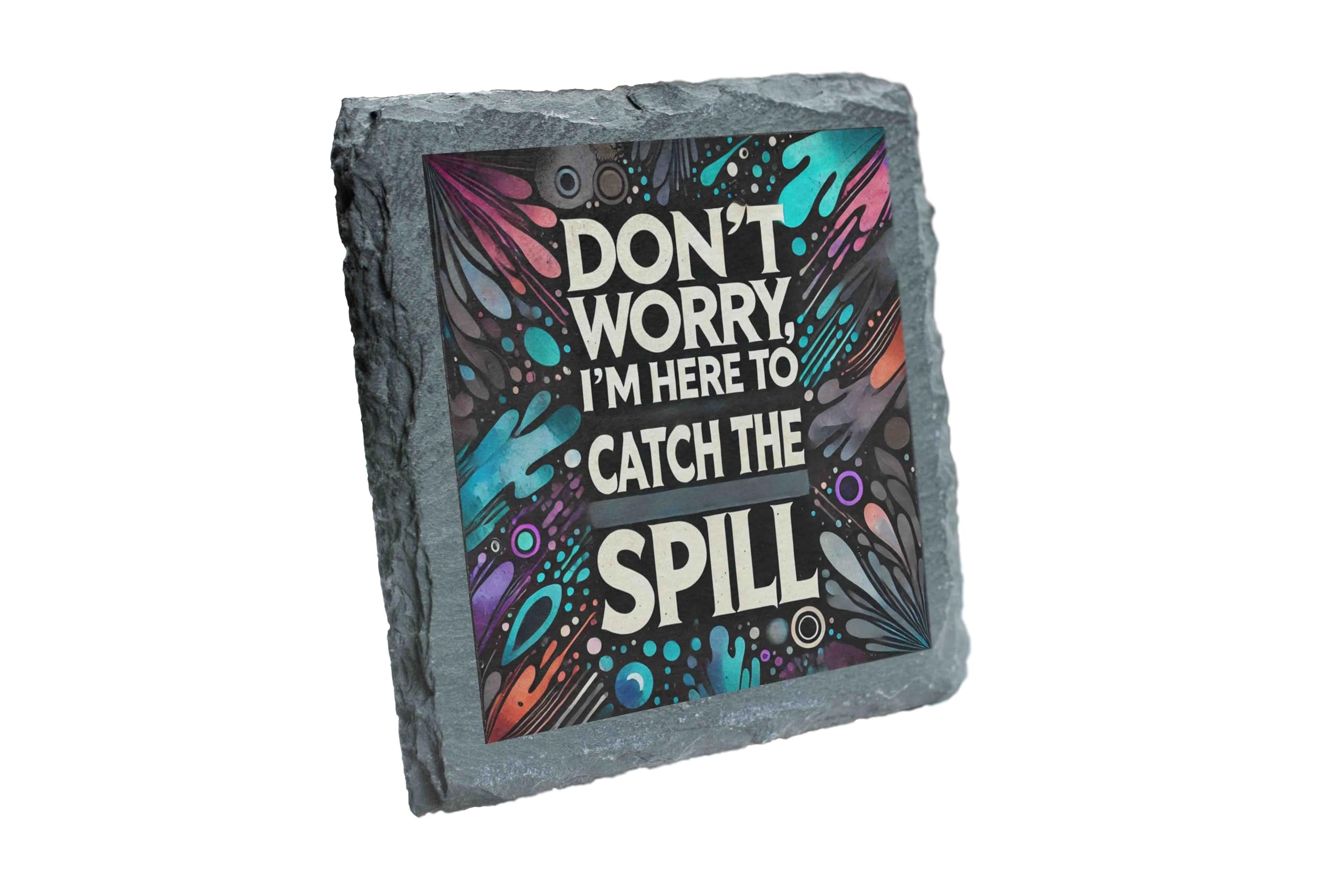 Add a touch of humor and practicality to your table with the "Don't Worry, I'm Here to Catch the Spill" Slate Coaster. This unique design combines a playful phrase with a vibrant splash-inspired background, making it a standout accessory for any coffee table, desk, or bar. Crafted from premium natural slate with rugged edges, this coaster blends functionality with a rustic aesthetic. Designed to protect your furniture from heat, moisture, and scratches, it?s perfect for everyday use or as a fun conversation piece. Whether as a personal accessory or a thoughtful gift for a friend, this coaster delivers on both style and substance. Easy to clean and made to last, it?s an essential addition to any home!
