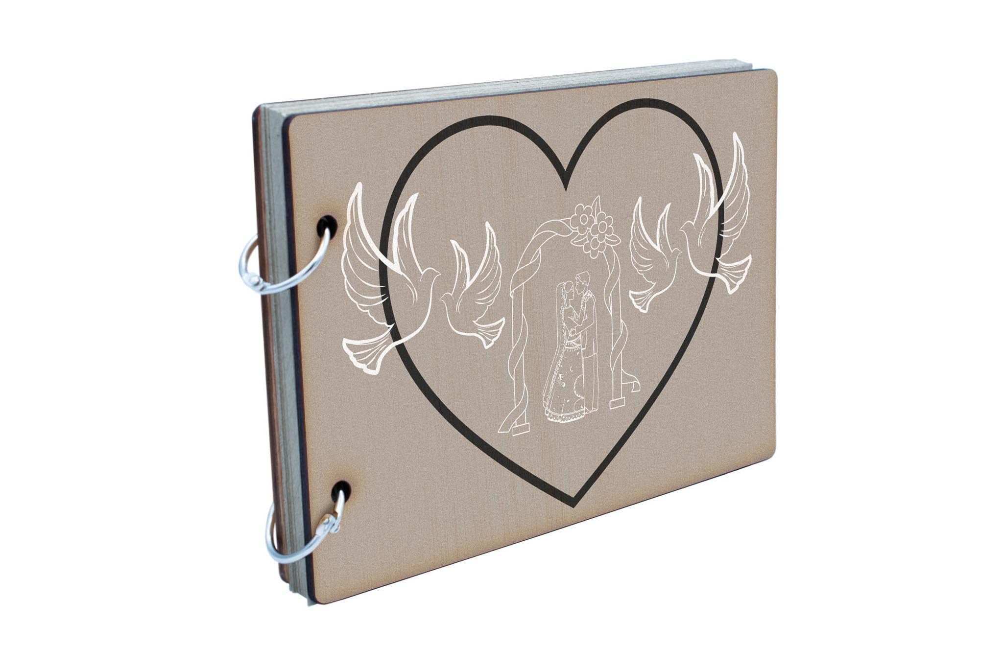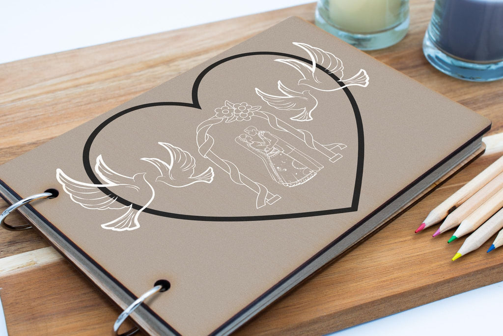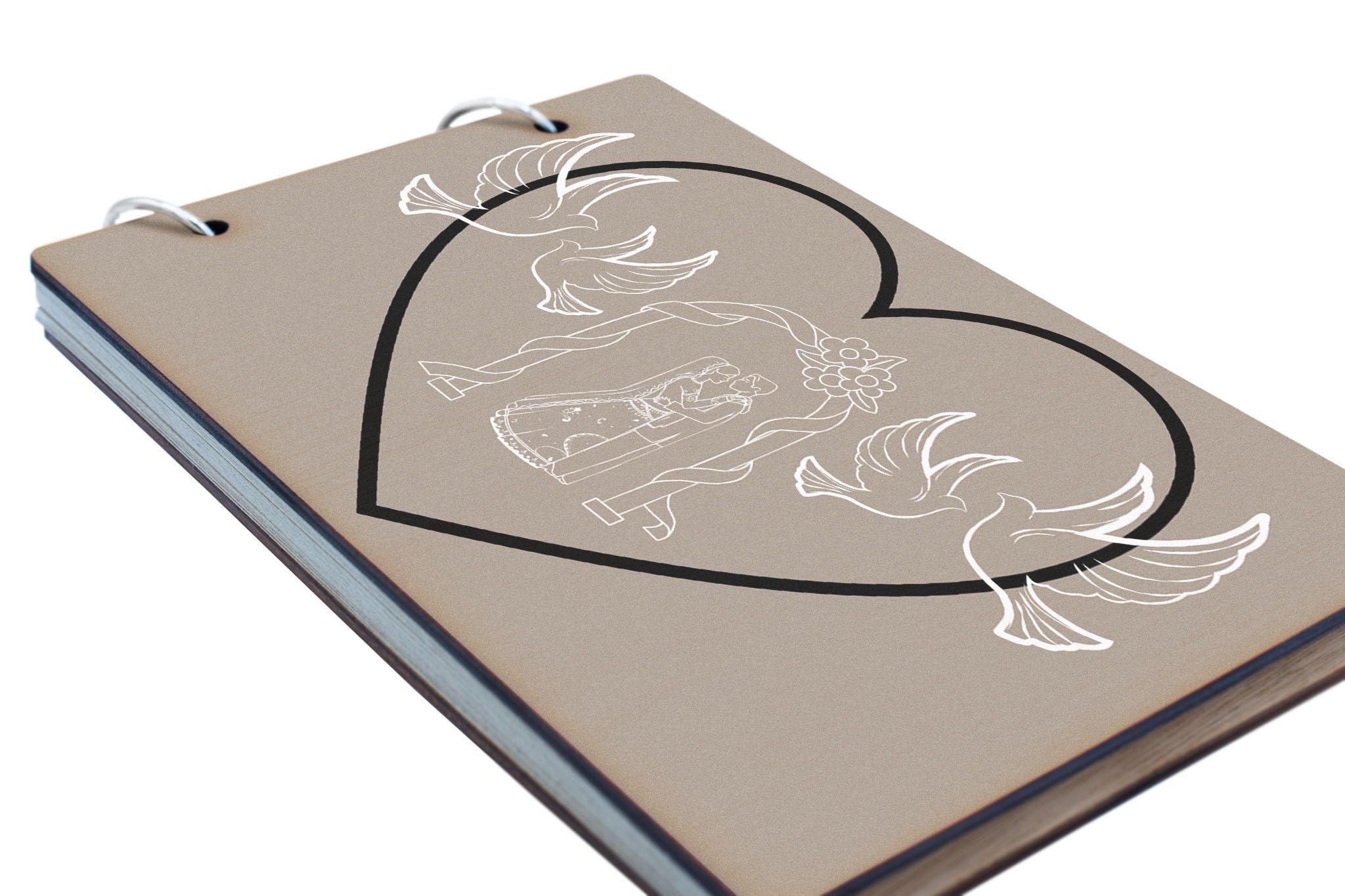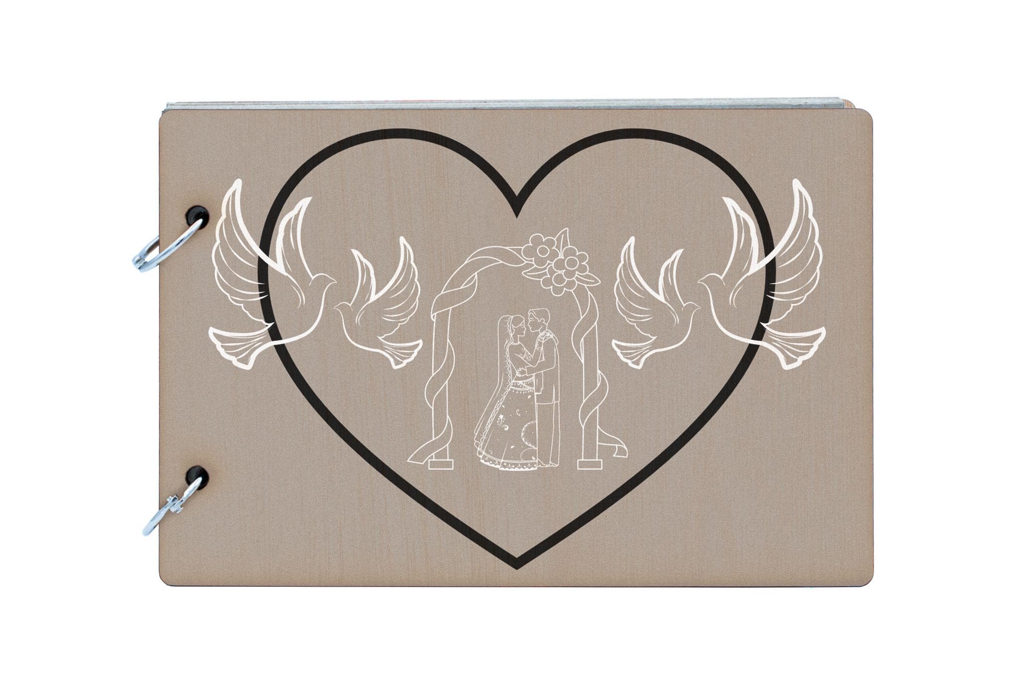Celebrate your special day with the Dove Heart Wedding Keepsake Album. This romantic album serves as a perfect wedding keepsake, memory book, and wedding journal all in one. Handmade with love, this elegant scrapbook is personalised with a lovely brown colour and designed with a heart featuring a married couple in love with doves flying around. Preserve your precious memories in this photo keepsake and create a beautiful couple's journal to cherish for years to come. The 25 recycled pages provide ample space to document your ceremony and prioritise your memories in a unique and meaningful way.