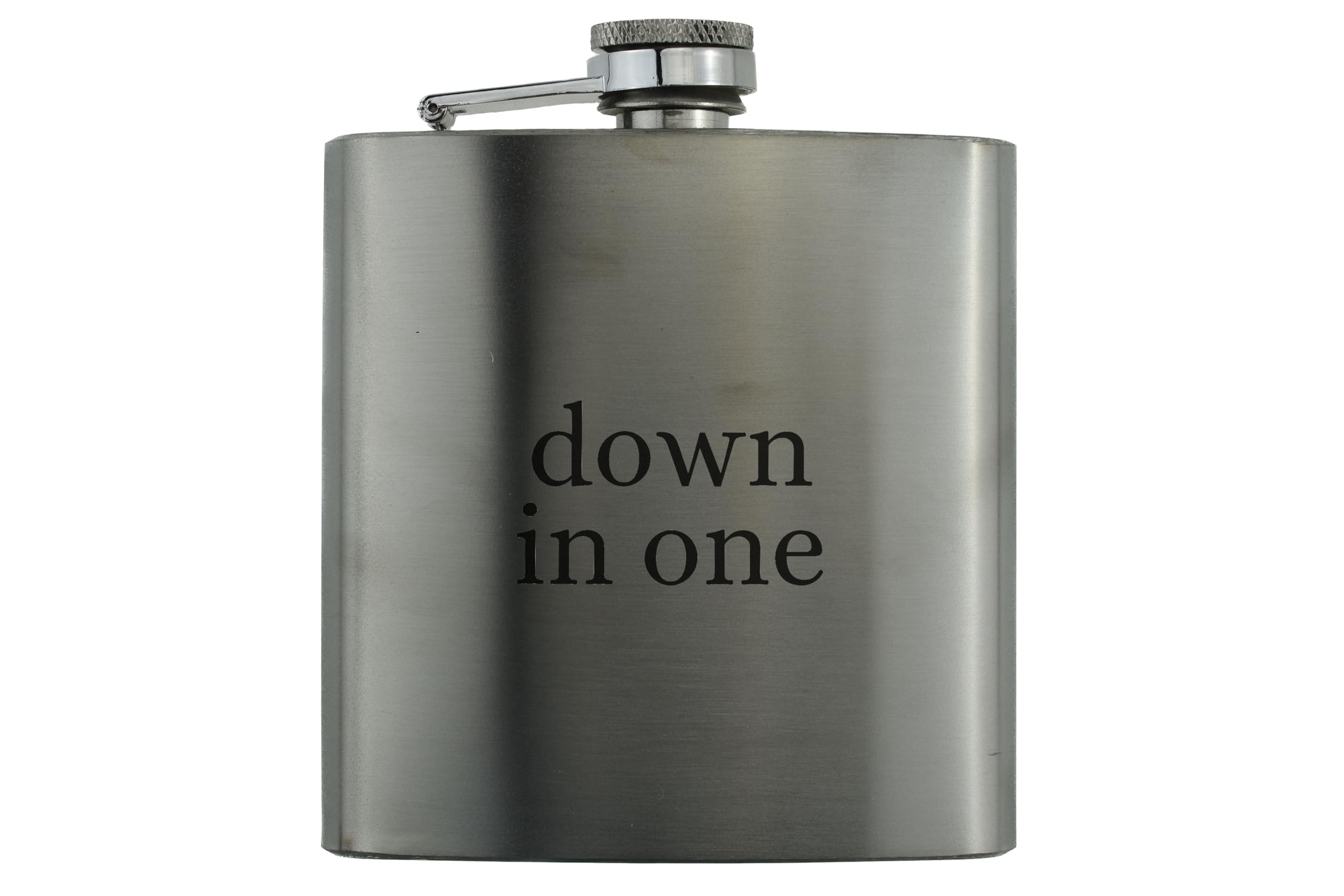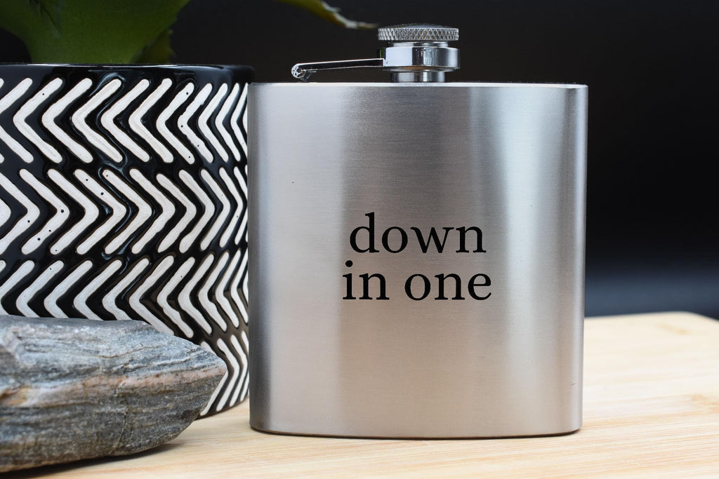The 'Down in One Celebration Flask' is the ultimate drinking challenge accessory for your next social gathering or party. This stainless steel flask features a simple and minimalist design, making it a fun and casual addition to your drinkware collection. The motivational phrase 'Down in One' is UV printed in full colour on the flask, adding a touch of personality and style to your night out. This barware gift is perfect for bachelor parties or any celebration where a drinking game is involved. Embrace the challenge and show off your skills with this sleek and stylish flask.