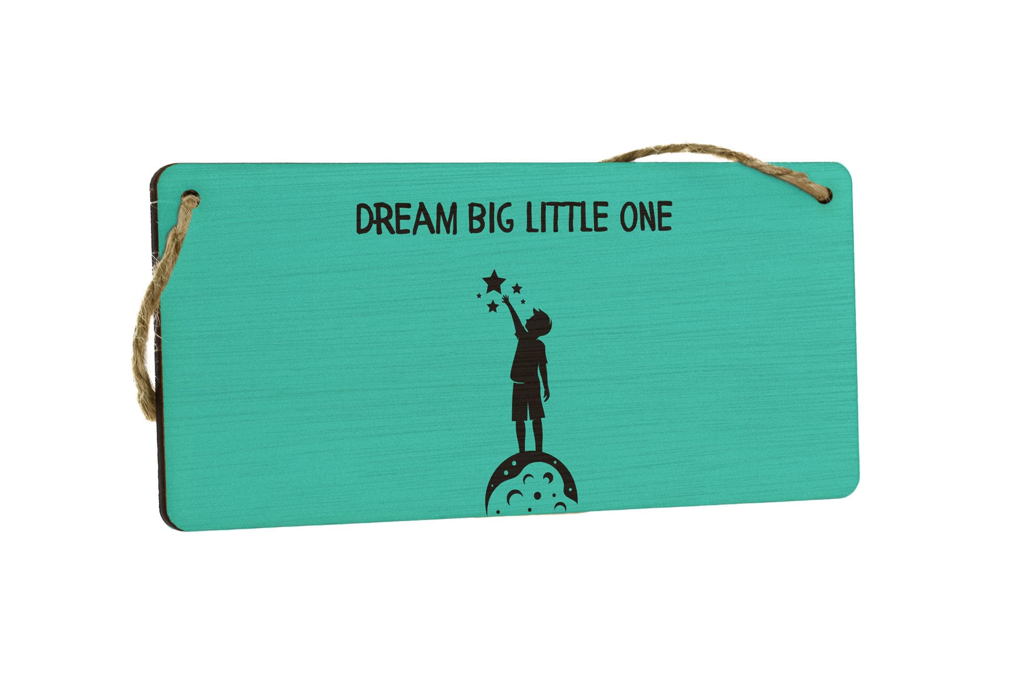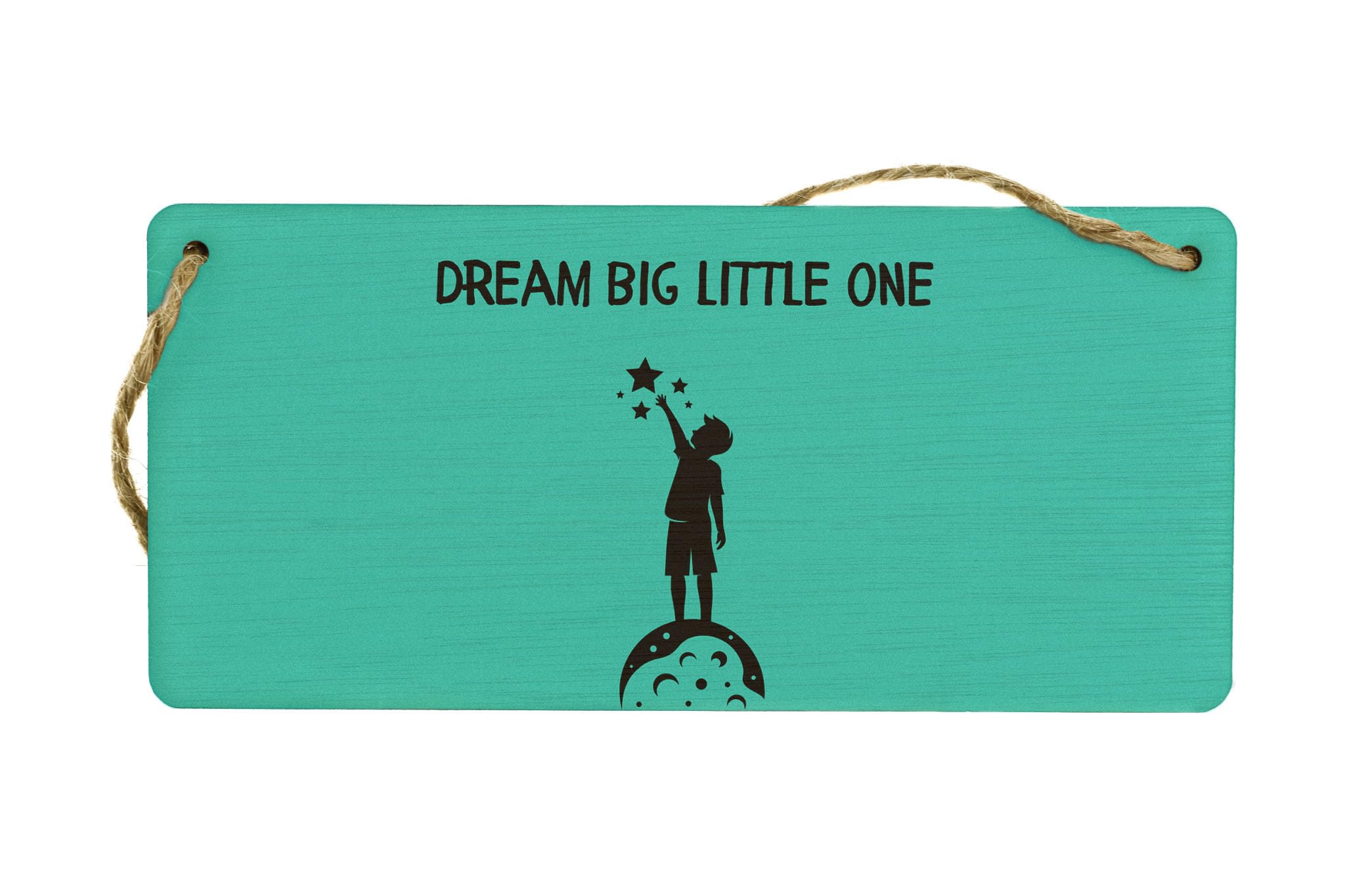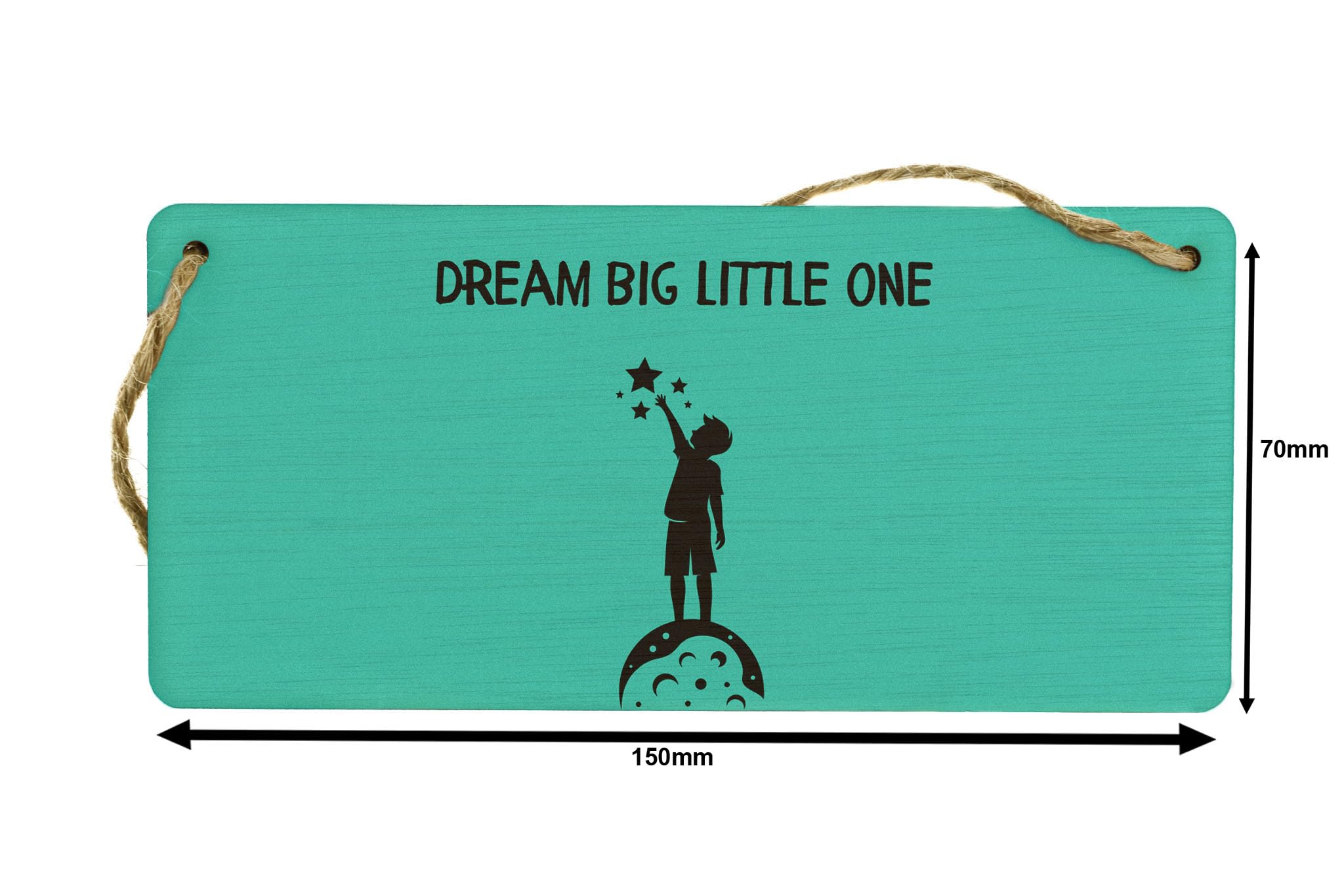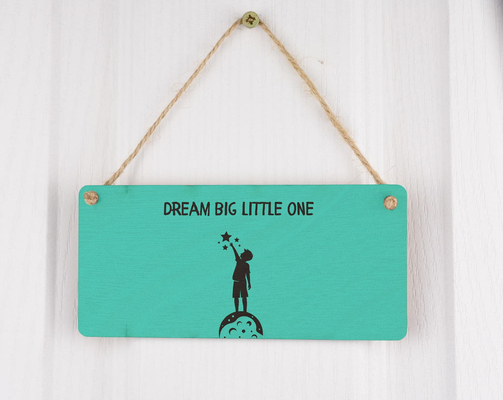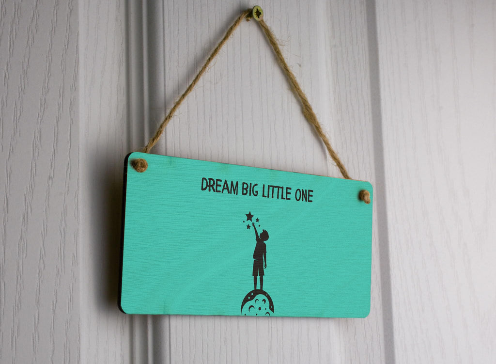 Add a touch of whimsy and inspiration to your little one's room with our Dream Big Little One Plywood Hanging Room Sign. This charming hanging sign is the perfect gift for a child's nursery or bedroom, featuring a full colour design with black writing on a green background. The sign reads 'Dream Big Little One' and includes a sweet image of a child reaching for the stars, complete with a black shadow. Made from quality plywood, this kids room sign is durable and lightweight, making it easy to hang on a door, wall, or anywhere in your home. Whether you're decorating a nursery, baby's room, or kids bedroom, this home decor sign is sure to add a touch of charm and whimsy to any space.