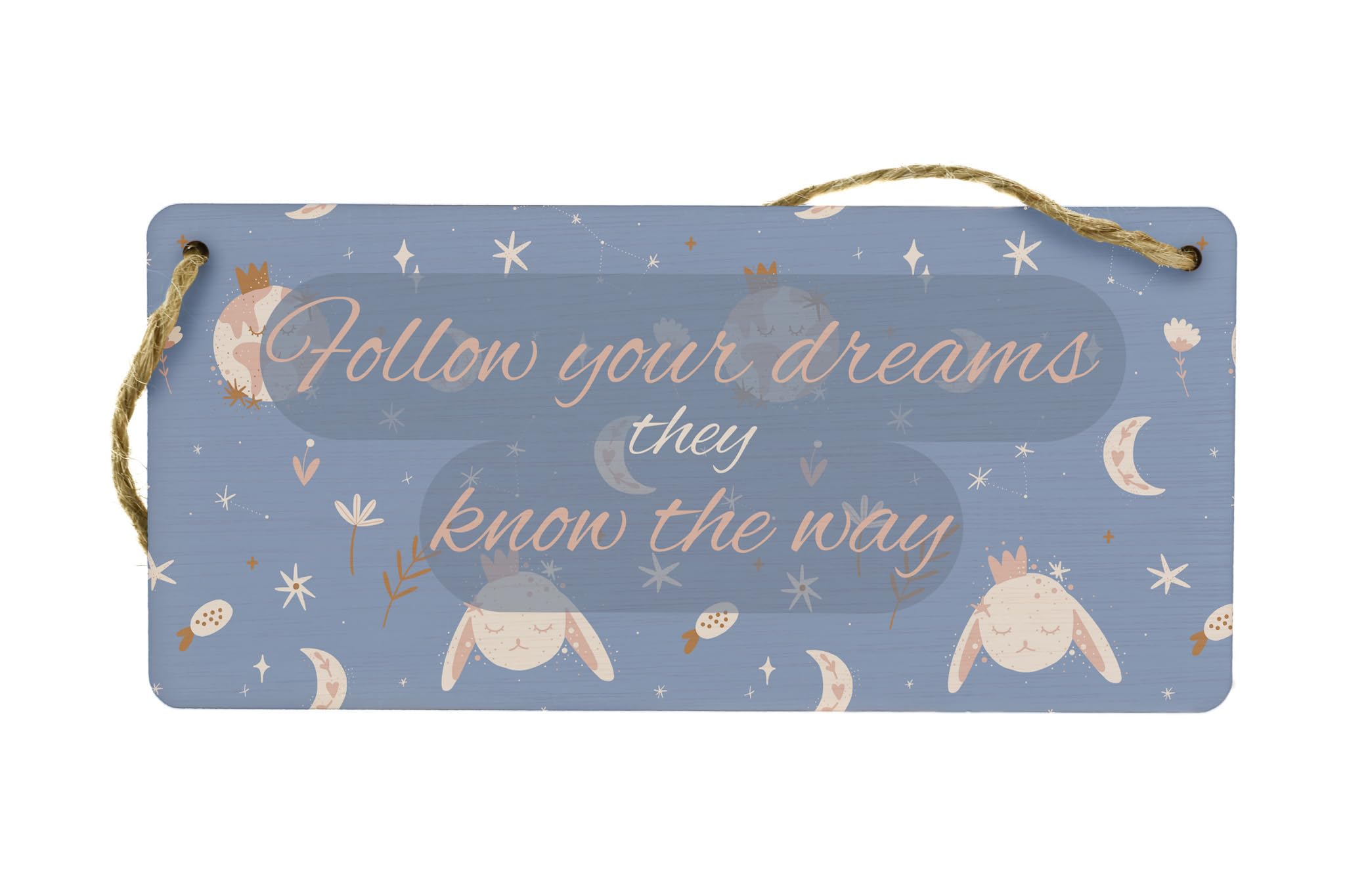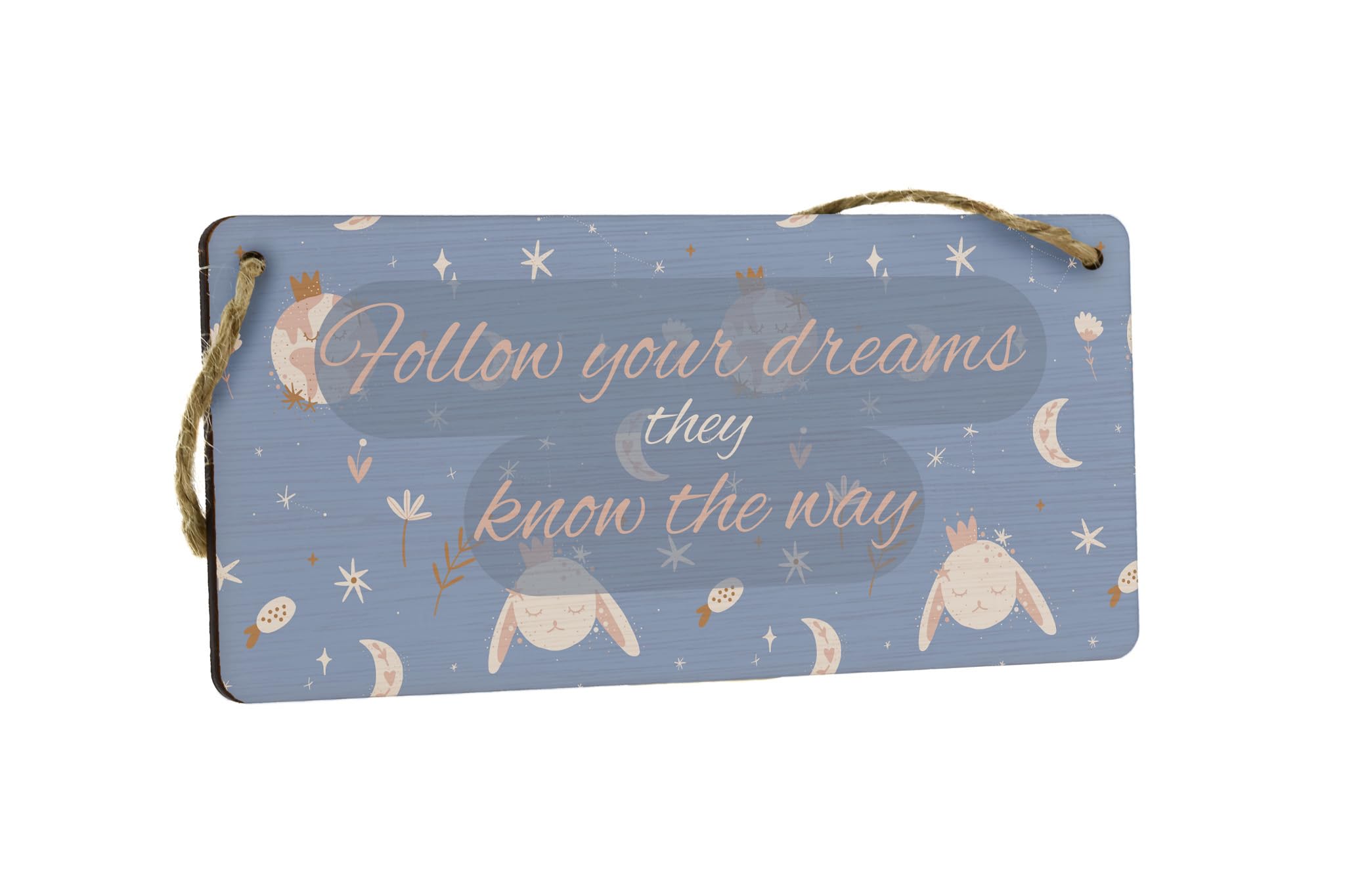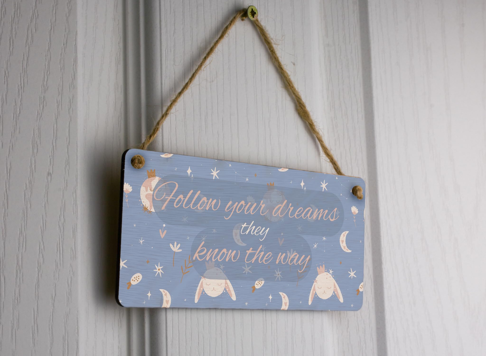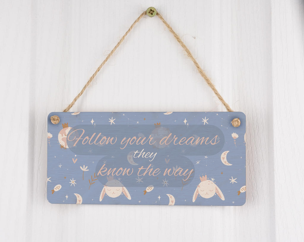 Add a touch of whimsy and inspiration to your nursery or girls' room with our Dreamy Delight Plywood Hanging Sign. Made from high-quality plywood, this charming hanging sign features a beautiful design that reads 'Follow Your Dreams, They Know the Way'. The delicate script and intricate details make it the perfect addition to any wall. Whether you hang it above the crib or on a gallery wall, this sign is sure to bring joy and inspiration to your little one's space. Our Dreamy Delight Plywood Hanging Sign is not only a piece of wall art, but also a reminder to always chase your dreams.
