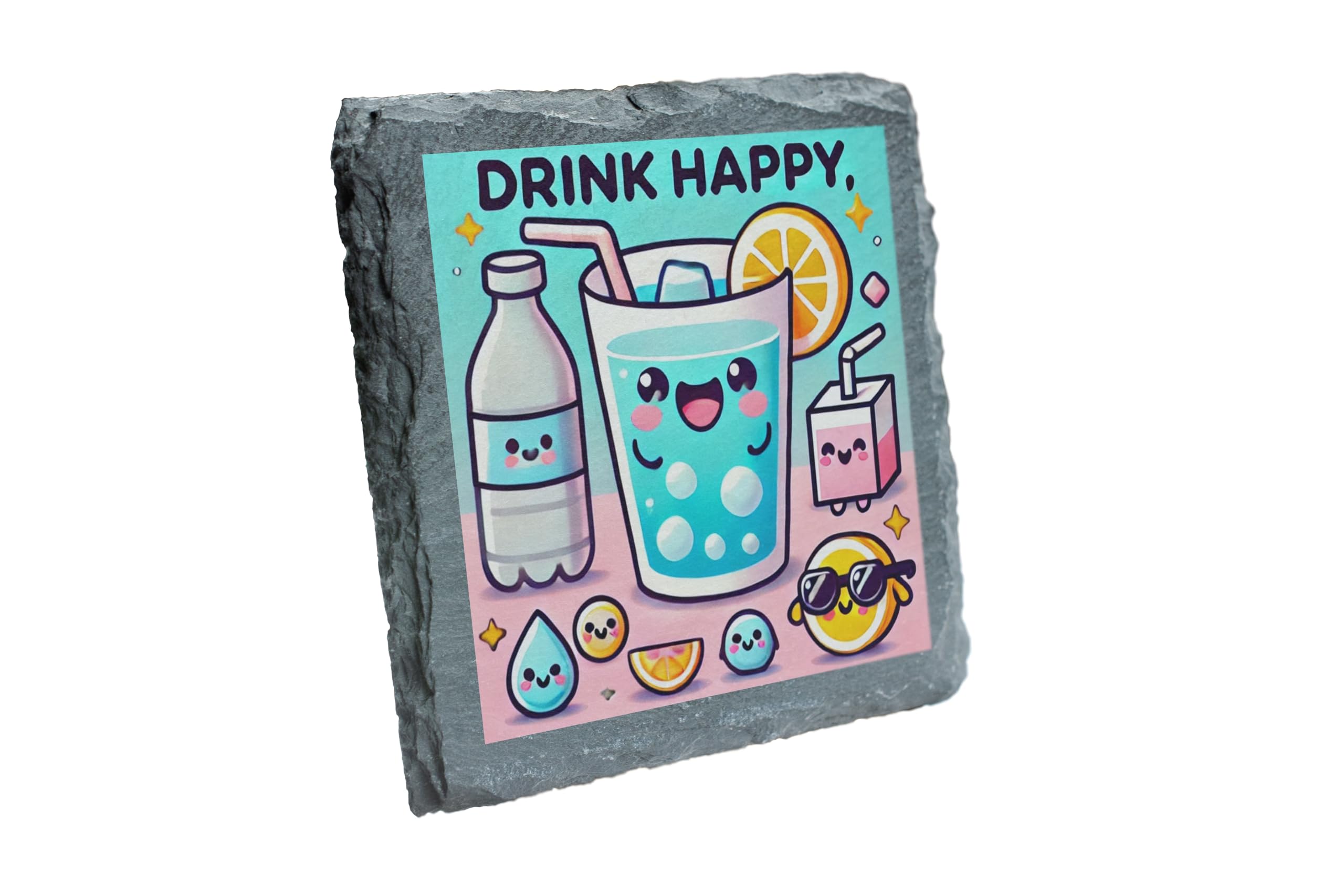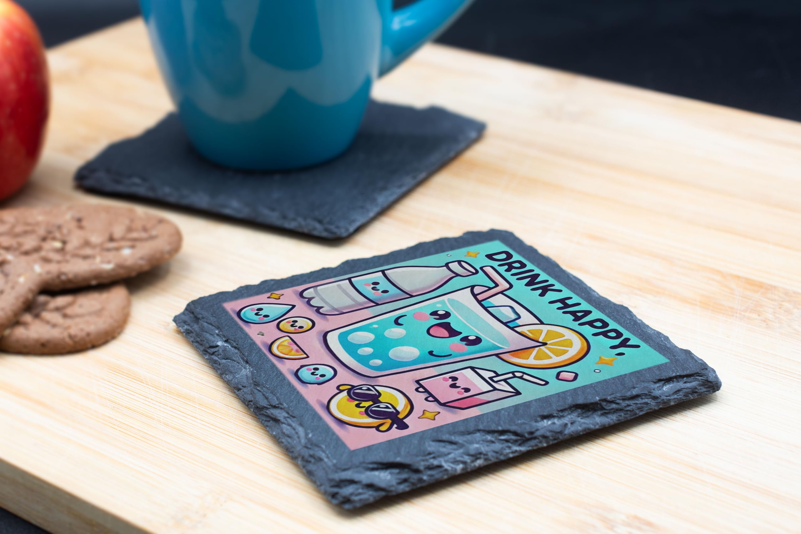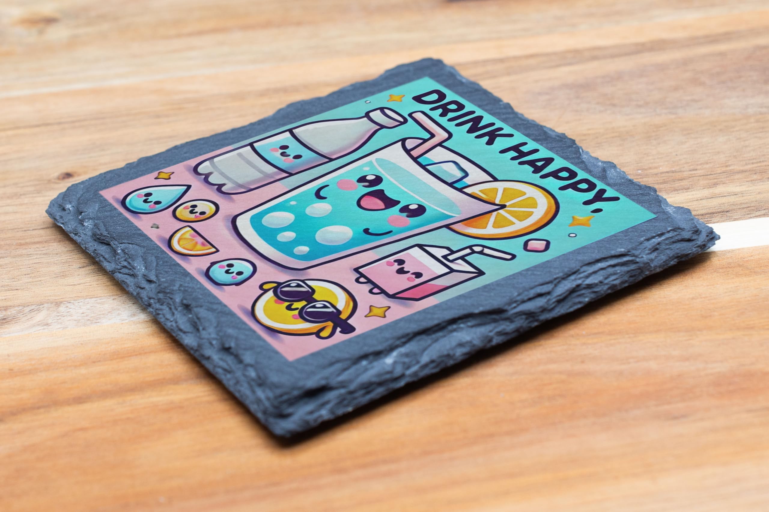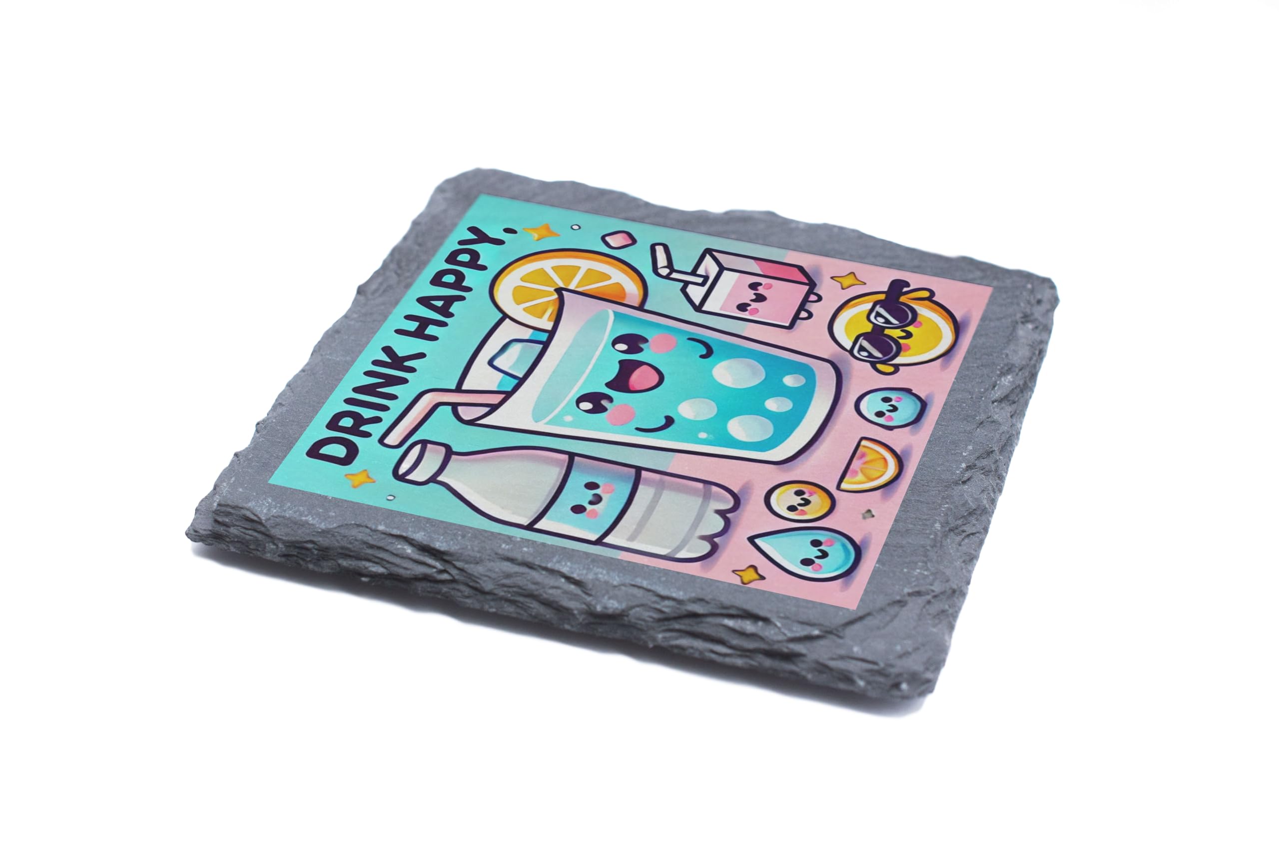Infuse your space with happiness and charm with the "Drink Happy" Fun Cartoon Slate Coaster. This delightful coaster showcases smiling drinks, citrus slices, and milk cartons, creating a whimsical and vibrant display. Made from premium slate, this coaster is as durable as it is decorative. Its rustic edges and detailed print make it the perfect blend of functionality and fun. Whether you're using it to protect your furniture or as a quirky accent piece, this coaster is sure to bring a smile to your face. Ideal for gifting, this coaster makes a thoughtful present for anyone who loves colorful and unique decor. Add some joy to your home or share it with a loved one!