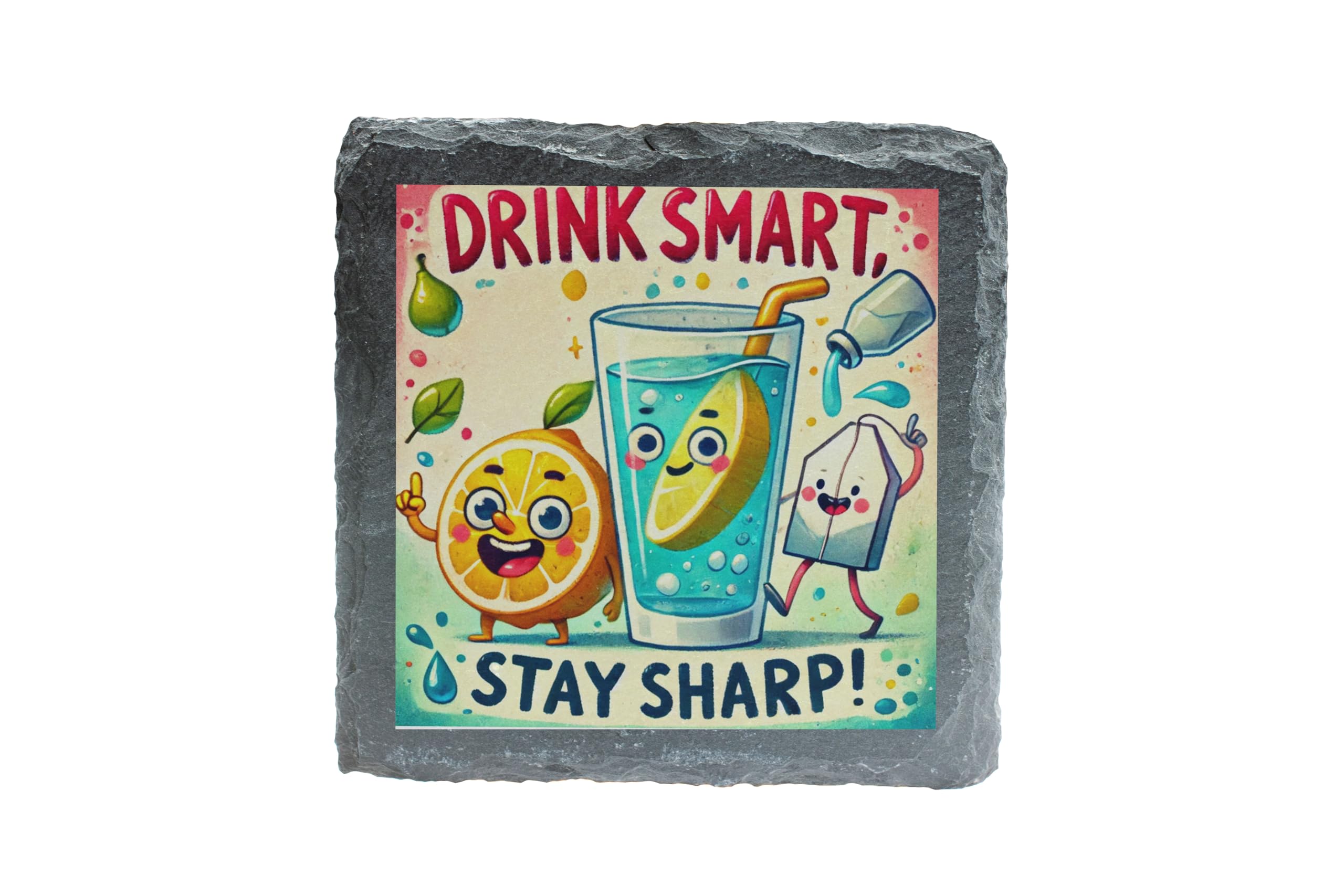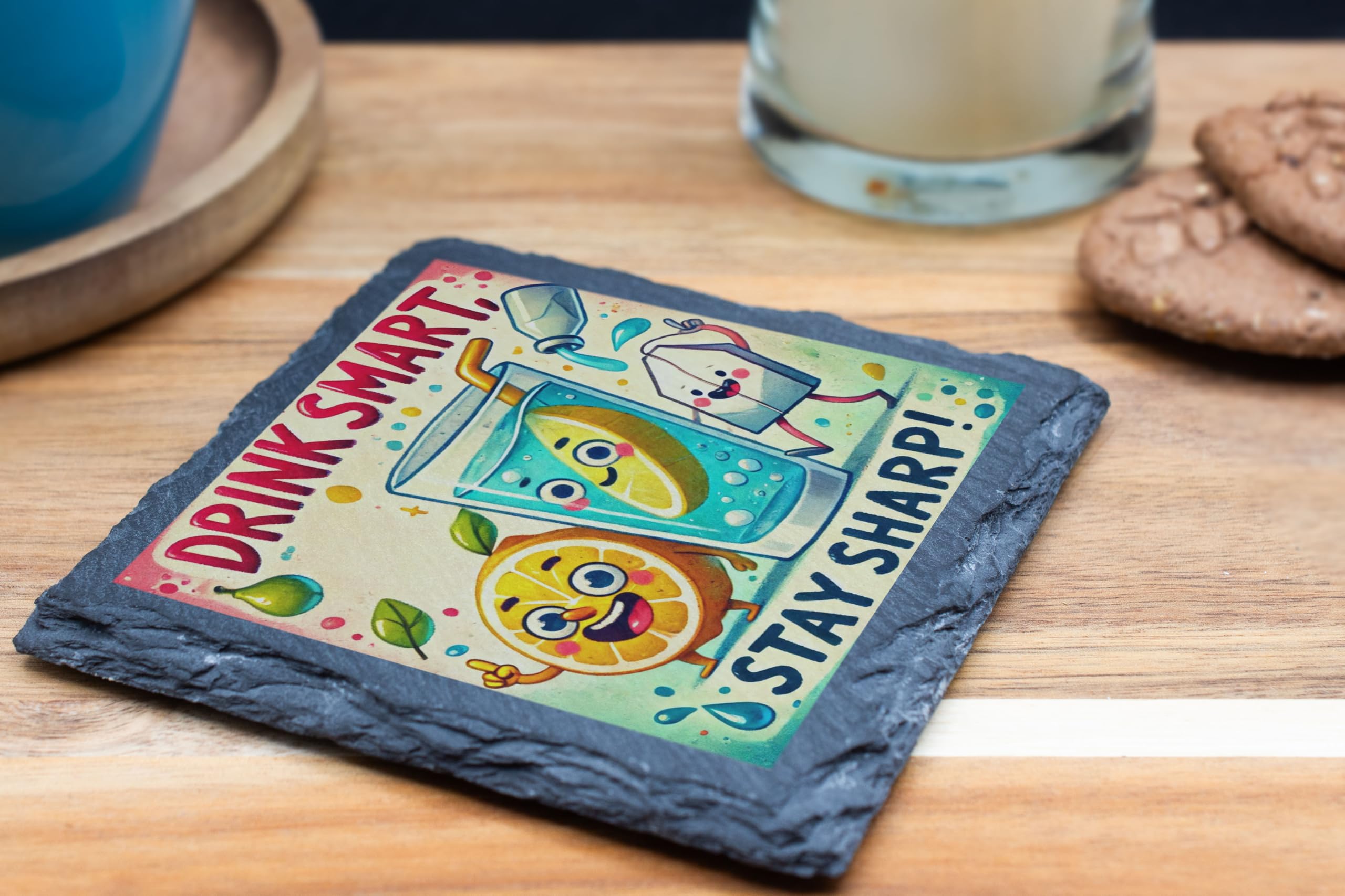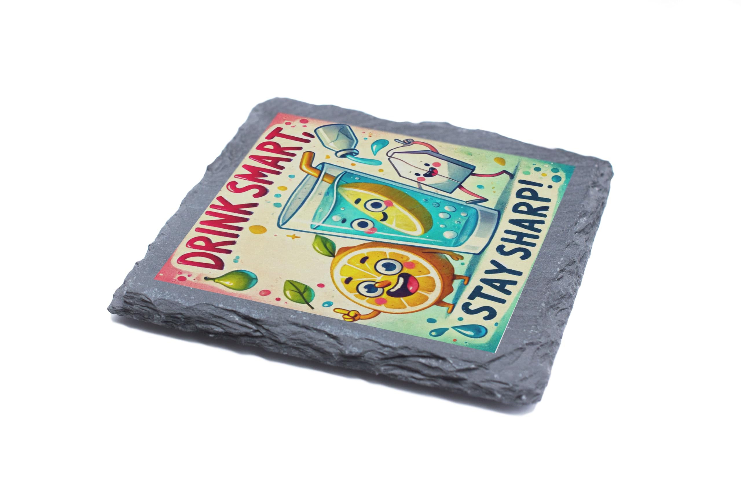 Elevate your hydration game with the "Drink Smart, Stay Sharp!" Beverage-Themed Slate Coaster. Featuring a cheerful design with a smiling glass of lemonade, joyful lemon slices, and animated tea bags, this coaster is sure to add a dash of fun to your day. Crafted from high-quality slate, this coaster not only protects your surfaces but also adds a touch of whimsy to any setting. Its fade-resistant artwork ensures vibrant colors for years to come, making it an excellent conversation piece. Whether you're sipping tea, coffee, or a refreshing lemonade, this coaster is the perfect companion. A great gift for friends, family, or colleagues who love a bit of playful charm with their beverages!