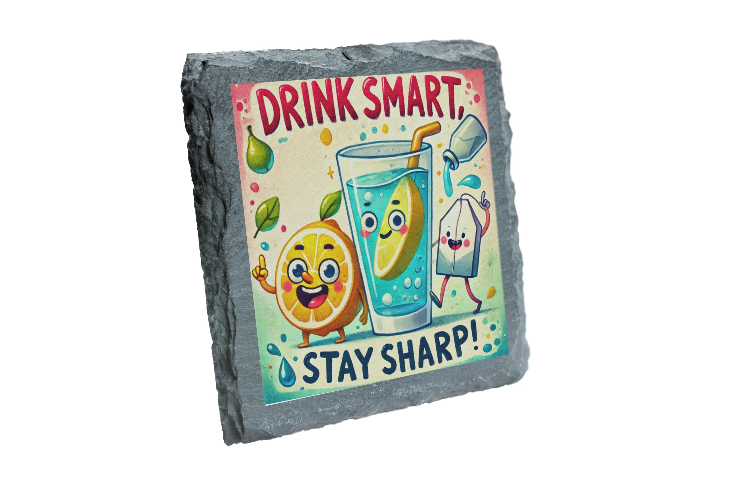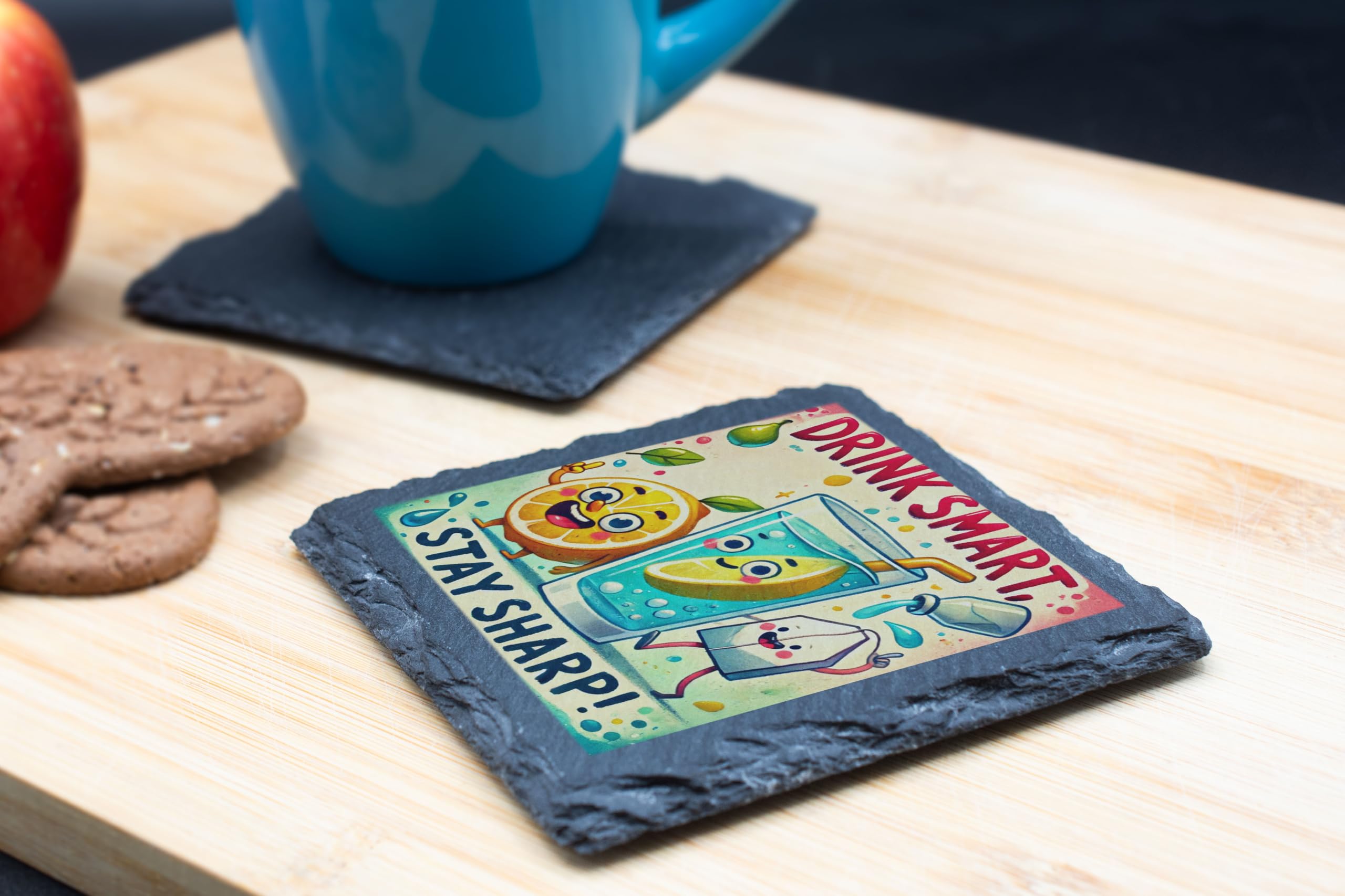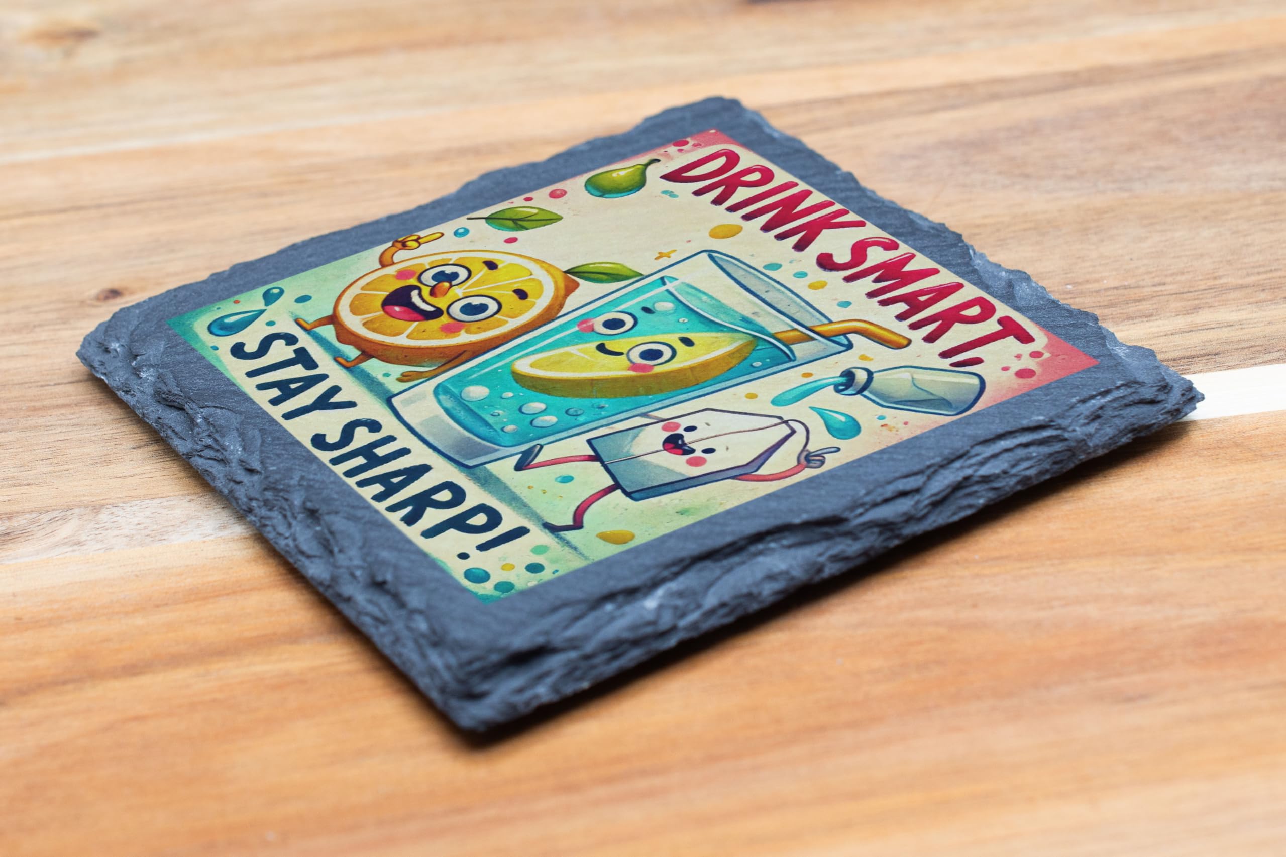 Elevate your hydration game with the "Drink Smart, Stay Sharp!" Beverage-Themed Slate Coaster. Featuring a cheerful design with a smiling glass of lemonade, joyful lemon slices, and animated tea bags, this coaster is sure to add a dash of fun to your day. Crafted from high-quality slate, this coaster not only protects your surfaces but also adds a touch of whimsy to any setting. Its fade-resistant artwork ensures vibrant colors for years to come, making it an excellent conversation piece. Whether you're sipping tea, coffee, or a refreshing lemonade, this coaster is the perfect companion. A great gift for friends, family, or colleagues who love a bit of playful charm with their beverages!