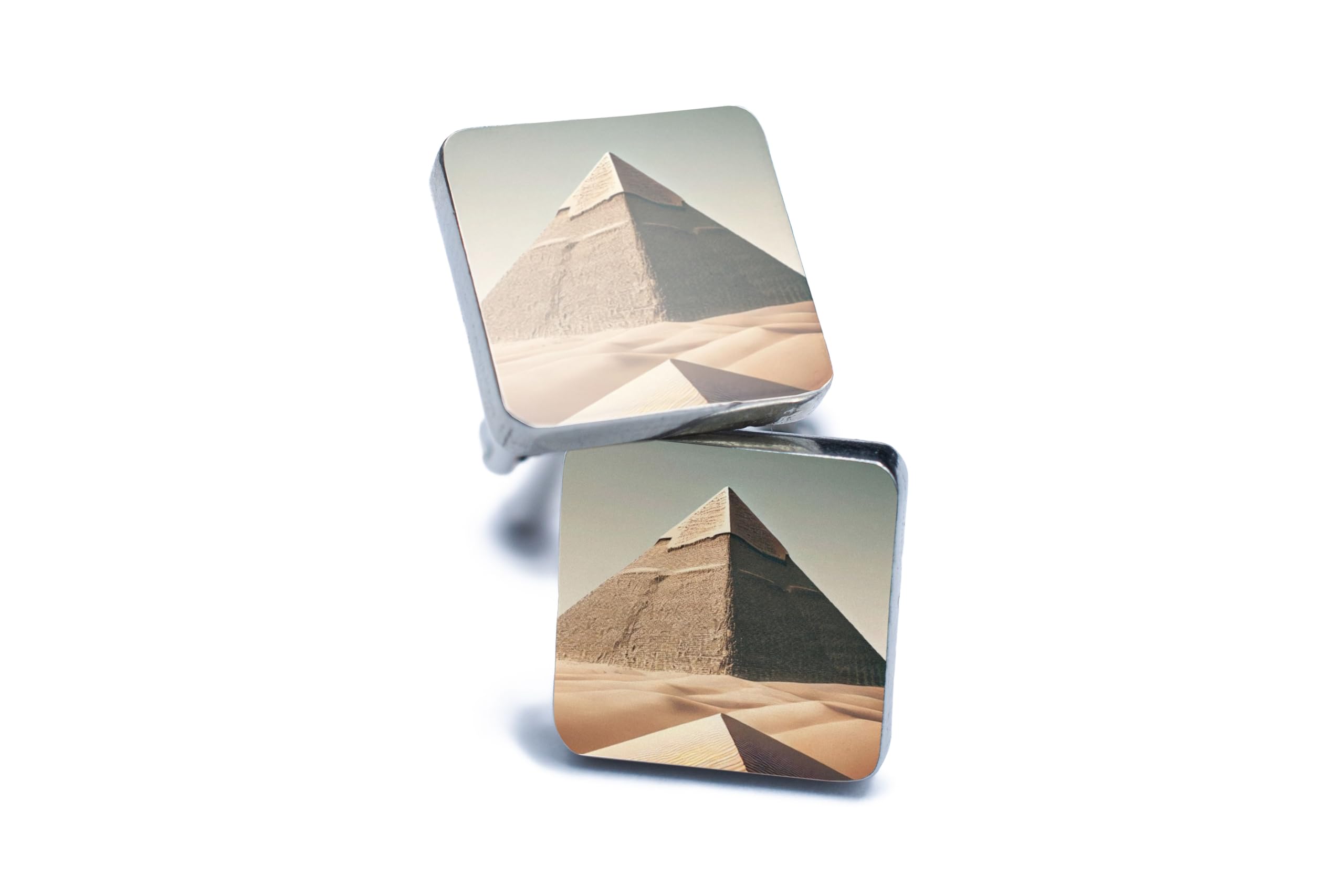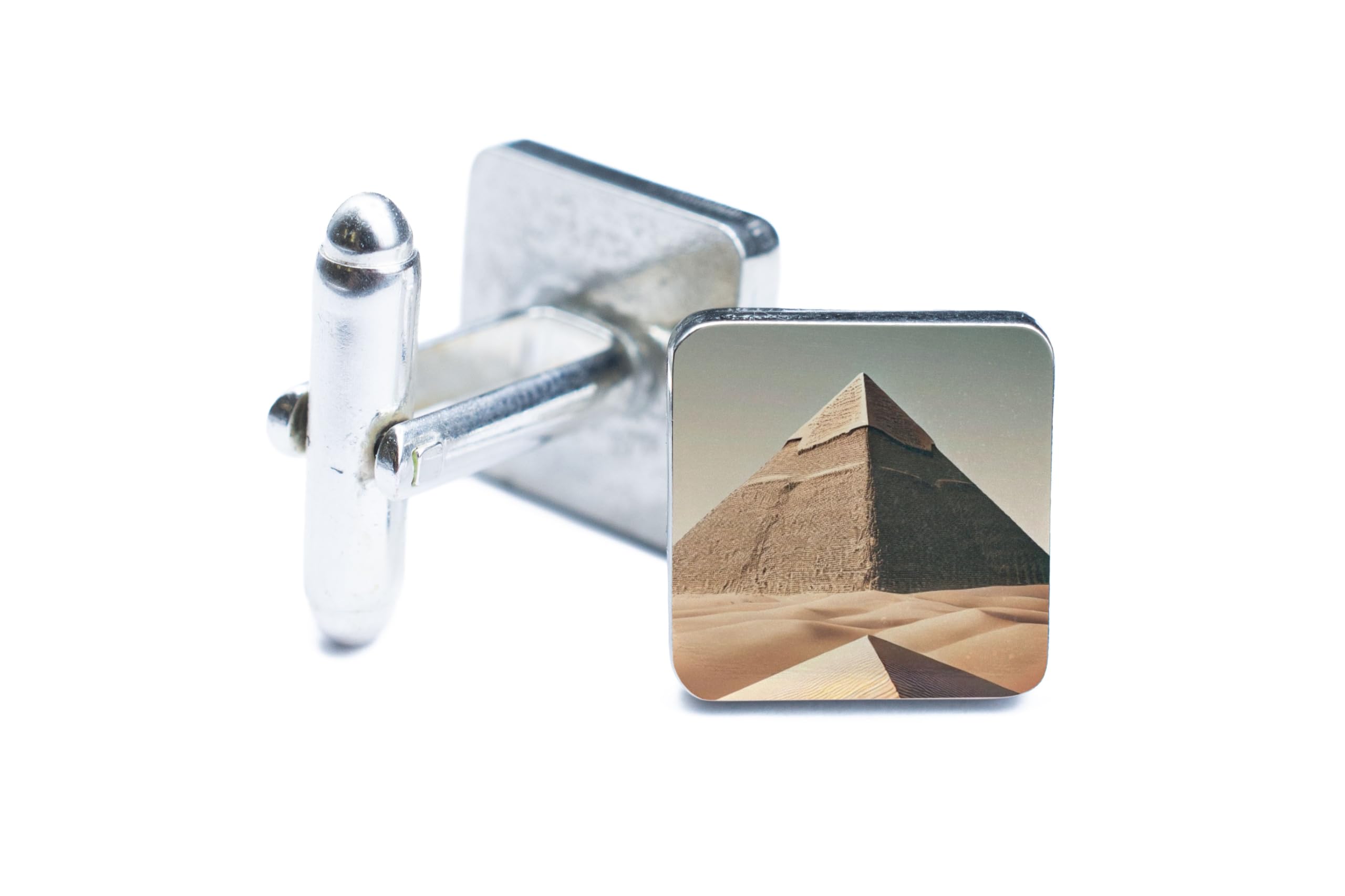 Travel Back to the Sands of Time Celebrate the wonders of ancient Egypt with these Egyptian Pyramid Cufflinks. Designed with the iconic pyramid surrounded by golden desert sands, these cufflinks evoke the timeless allure of one of the Seven Wonders of the Ancient World. Exceptional Craftsmanship Crafted from premium materials, these cufflinks feature a polished surface for a refined finish. Their robust construction ensures durability, making them a reliable accessory for years to come. A Statement Piece for History Lovers Whether you're attending a formal event or adding a touch of culture to your daily attire, these cufflinks make a bold statement. They are the perfect conversation starter for anyone passionate about ancient history or world heritage. A Gift of Timeless Elegance Surprise the history enthusiast in your life with a gift they'll cherish forever. Perfect for archaeologists, travelers, or admirers of Egyptian culture, these cufflinks are a thoughtful and unique keepsake. Add a piece of history to your wardrobe with these elegant Egyptian Pyramid Cufflinks. A sophisticated accessory that brings ancient wonders to modern fashion!