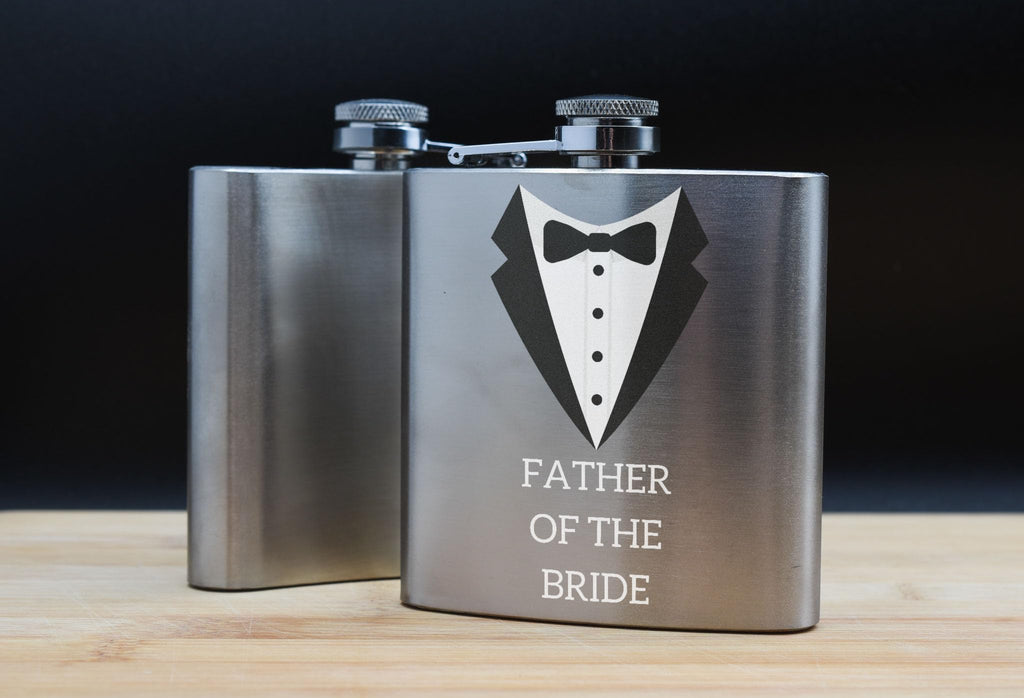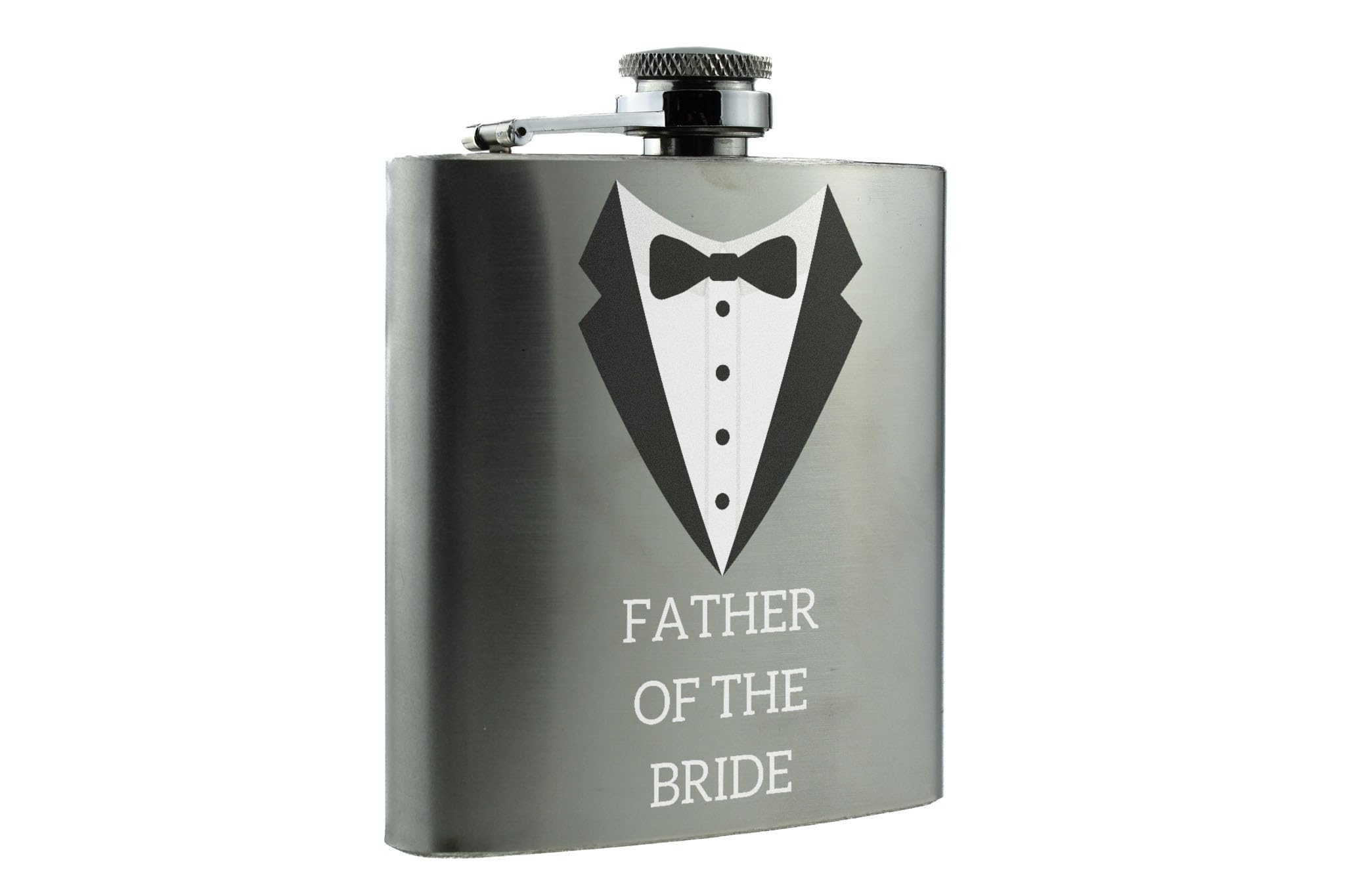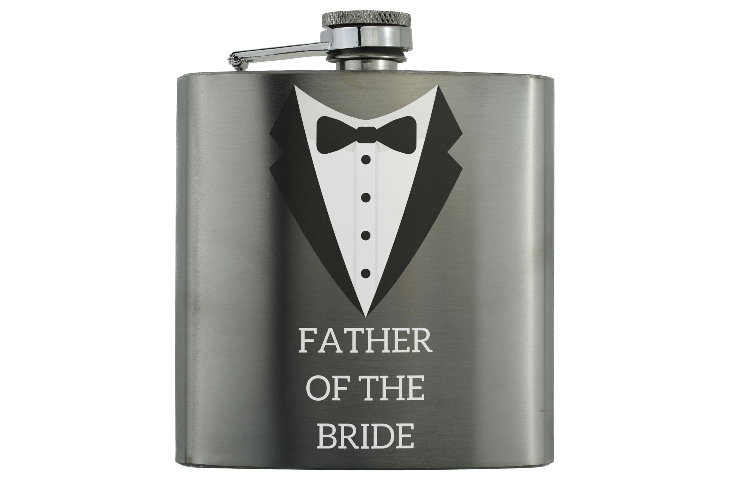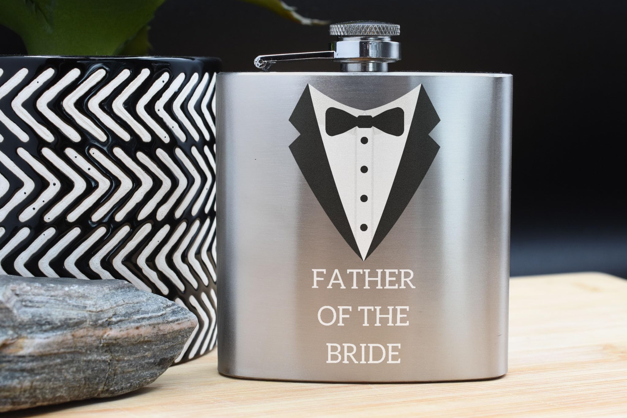 Make your father feel special on your wedding day with this elegant Father of the Bride Stainless Steel Flask. This classic tuxedo design flask is the perfect wedding accessory for your bridal party and a thoughtful gift for dad to commemorate his important role in your wedding celebration. Crafted from quality stainless steel, this flask is both practical and stylish, featuring a full color printed design that reads 'Father of the Bride'. Whether it's a Father's Day gift, a keepsake for your father, or a wedding day essential, this formal attire flask is sure to be a cherished item for years to come.