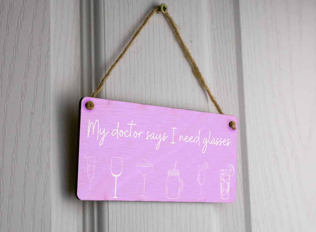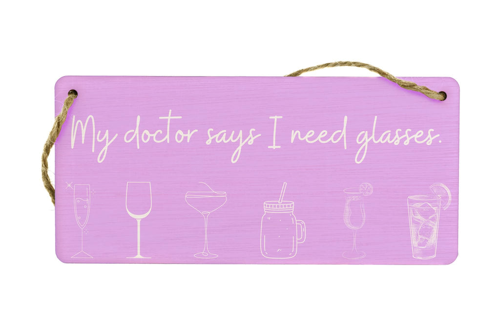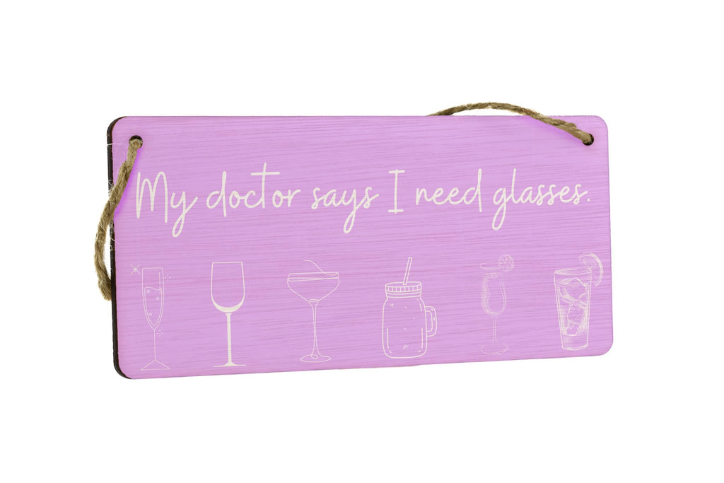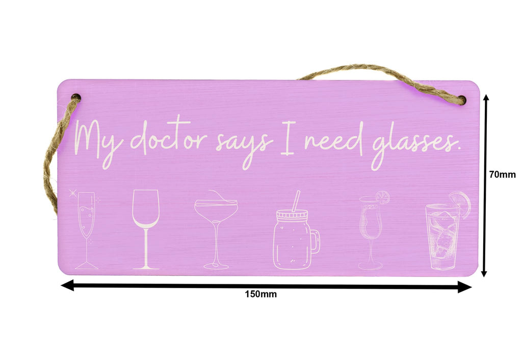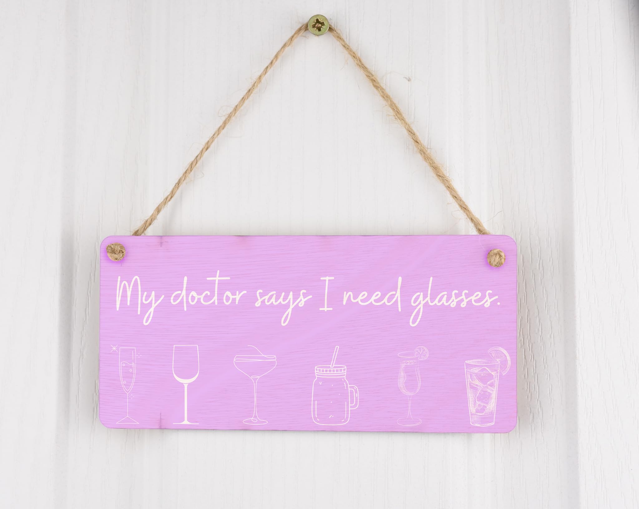 Introducing our elegant plywood hanging sign, perfect as a funny gift for mum and girlfriend or as a novelty home decor item. Made from quality plywood, this hanging sign features a unique design that is sure to catch everyone's attention. The sign reads 'My Doctor Says I Need Glasses!' and includes full-color images of drinking glasses, adding a touch of fun and humor to any space. Whether you want to spruce up your home or create a lively atmosphere in your bar, this sign is a great choice. Its elegant design and eye-catching imagery make it a visually appealing addition to any room. Get yours today and add a playful touch to your home decor or bar area!