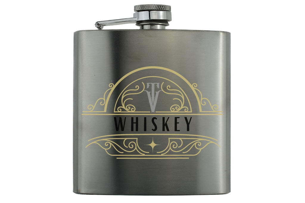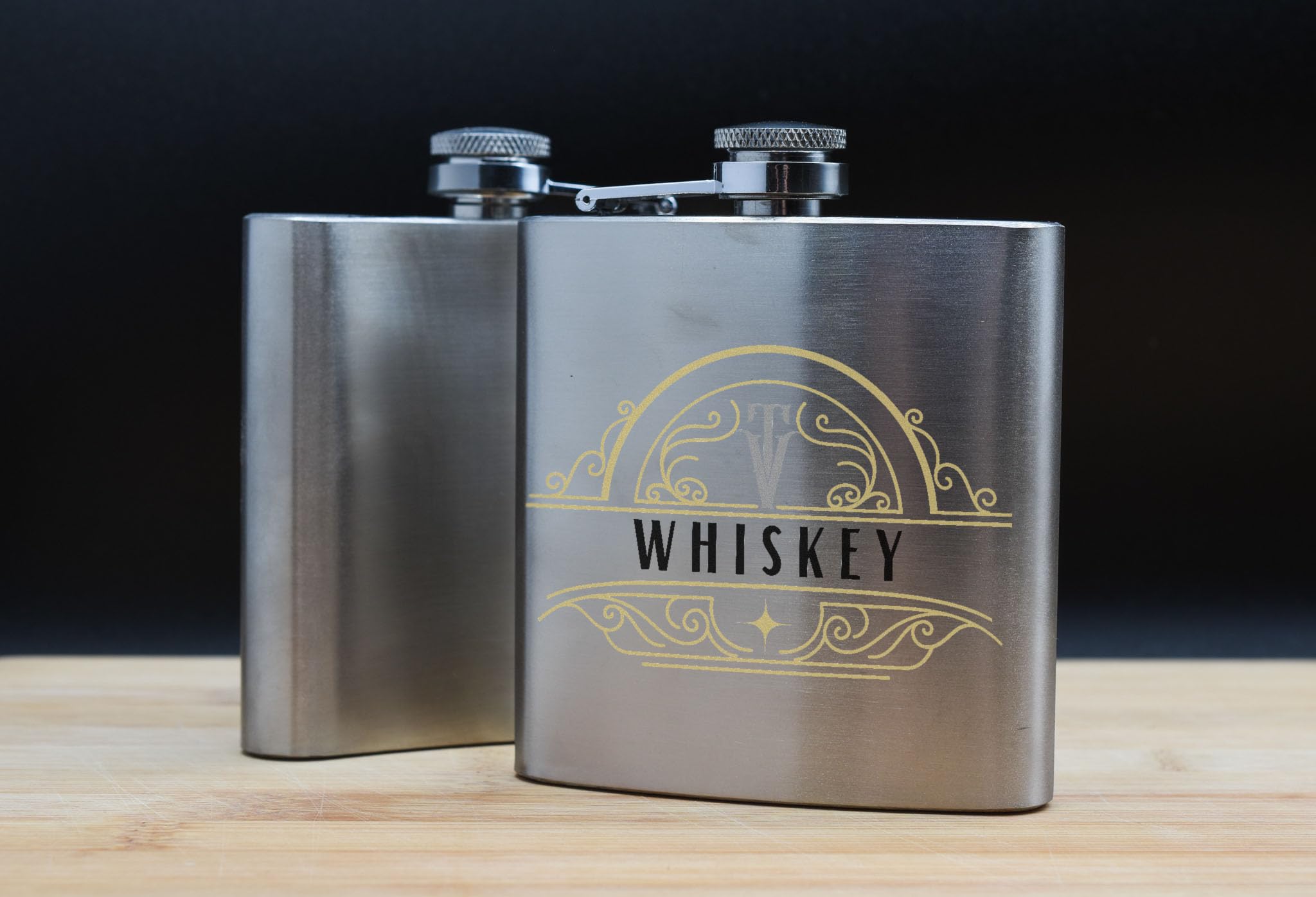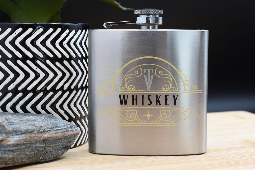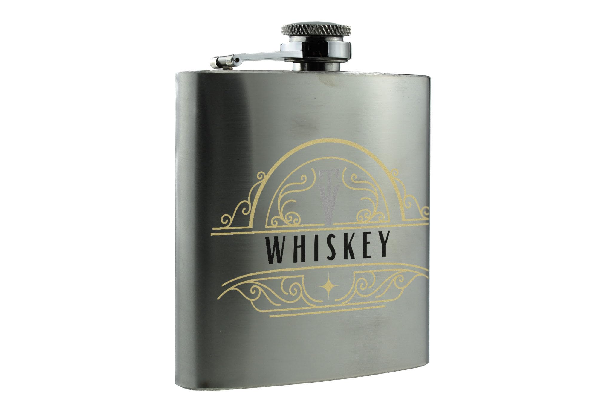 Introducing our Elegant Stainless Steel Whiskey Flask with Gold Accents, the perfect accessory for any whiskey lover. This classic whiskey hip flask is made from durable stainless steel, ensuring it will withstand the test of time. The flask features a vintage-inspired design with gold accents, adding a touch of elegance to your drinking experience. Its compact size makes it perfect for carrying your favourite drink on the go, whether you're attending a special occasion or simply enjoying a night out. The flask is UV printed with the word 'whiskey' in a stylish and ornate design, making it a unique and stylish gift for any whiskey aficionado.