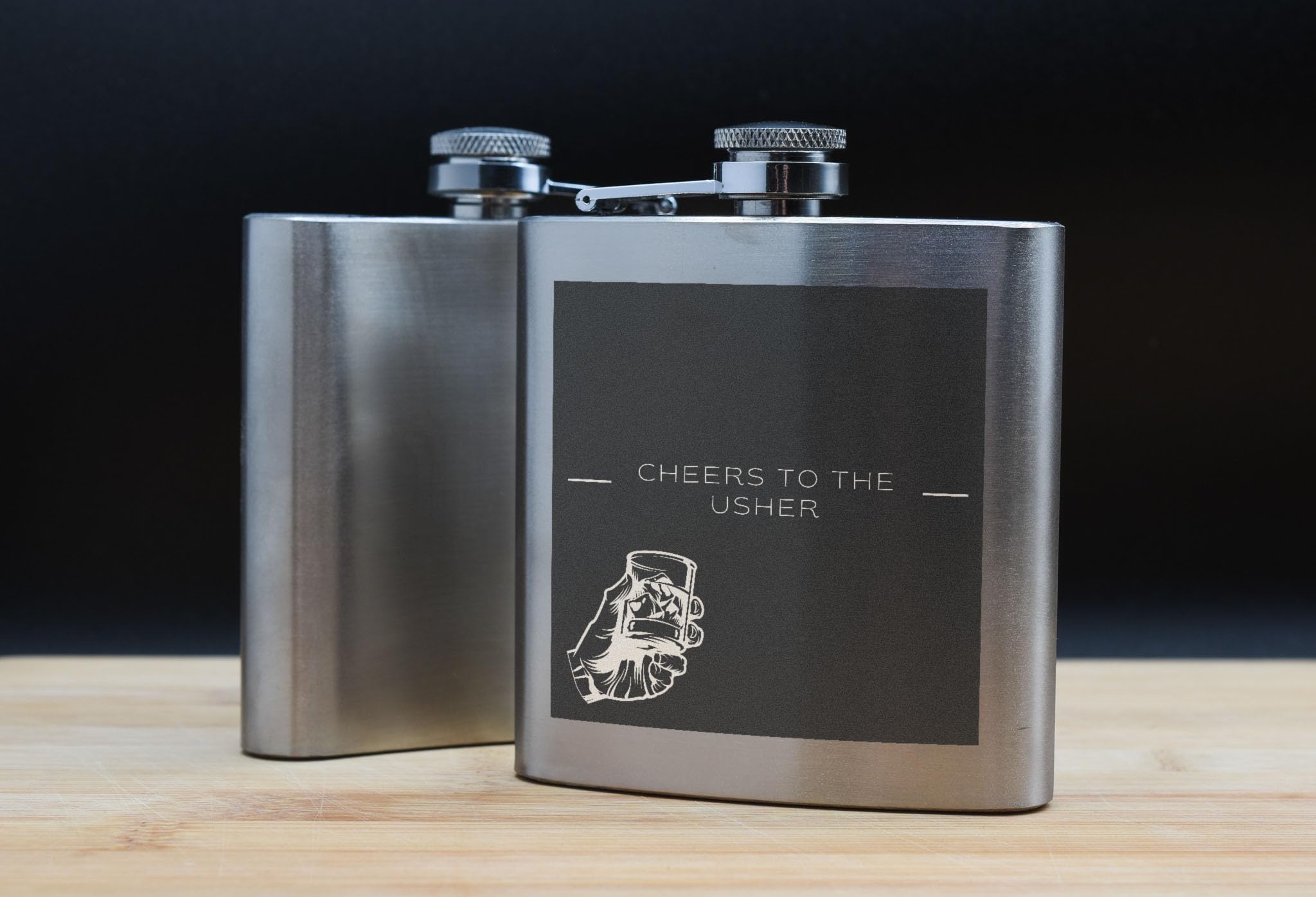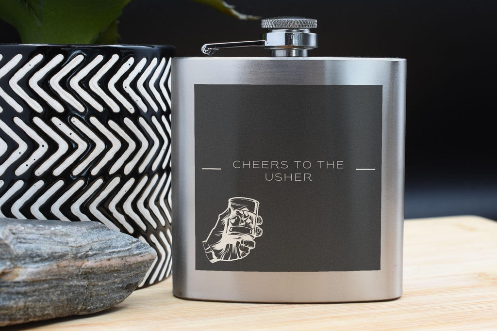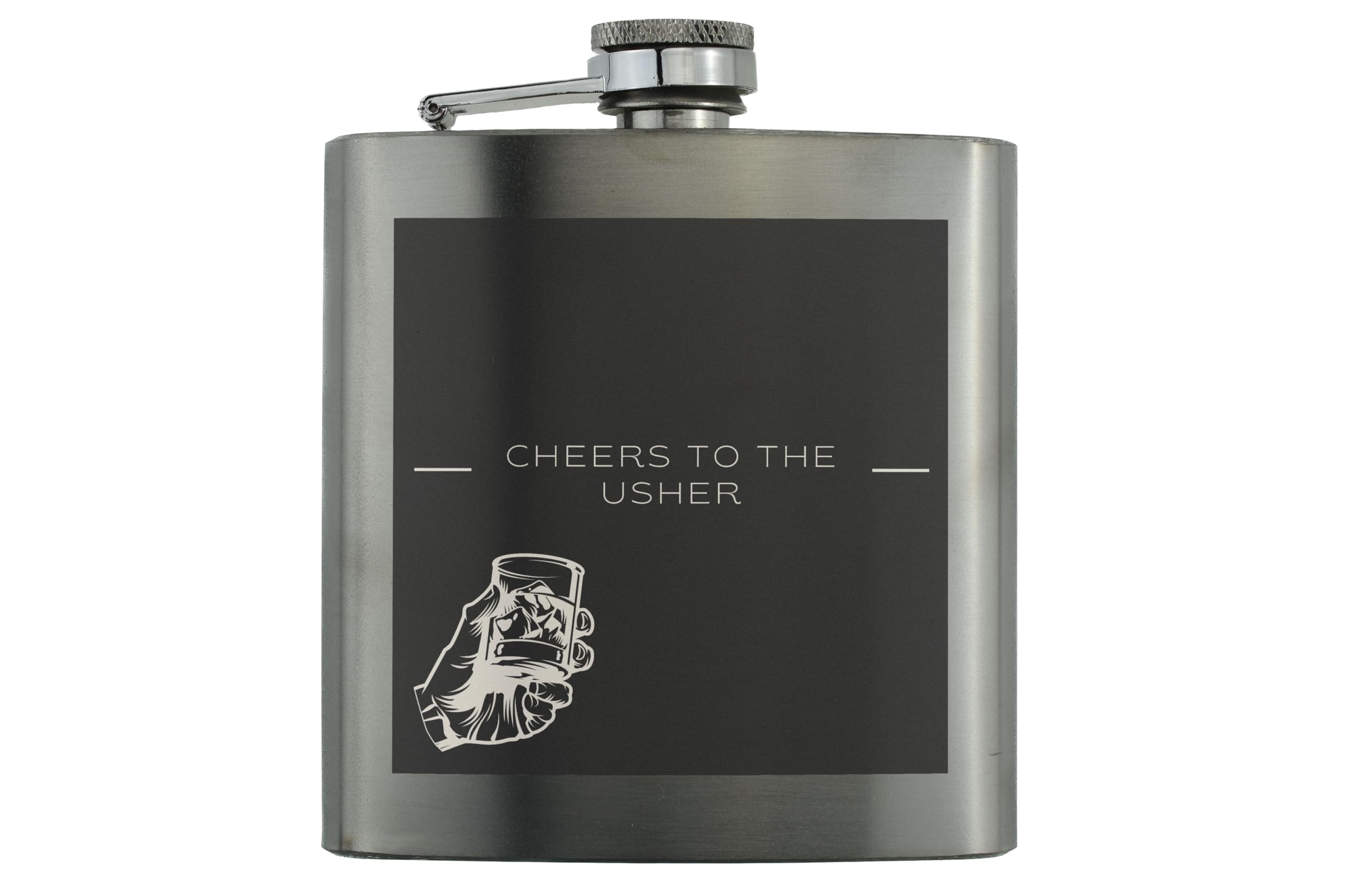 Make your wedding day even more special with our Elegant Wedding Usher Flask featuring a 'Cheers to the Usher' design. This unique and thoughtful gift is the perfect way to show your appreciation to the usher for their role in your special day. The flask is made of quality stainless steel and features a full colour printed design that is UV printed for added durability. The elegant wedding-themed design adds a touch of sophistication to this must-have accessory for any formal occasion. Whether you are toasting to the usher or just want to say thank you, this flask is a keepsake that will be cherished for years to come.