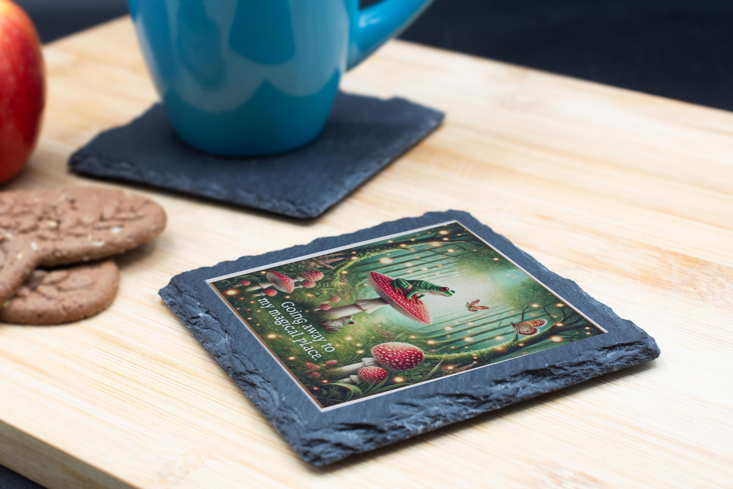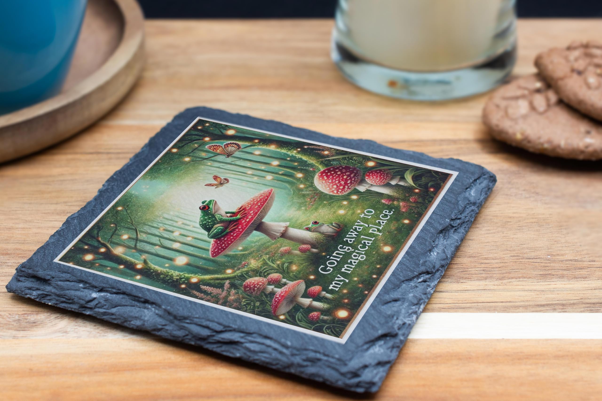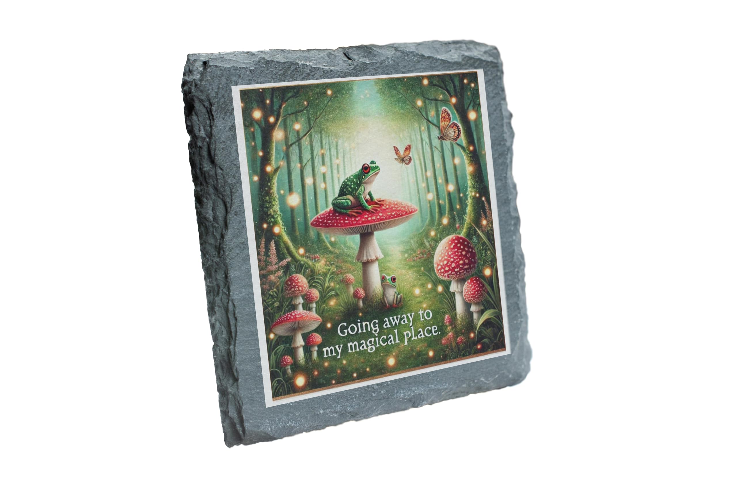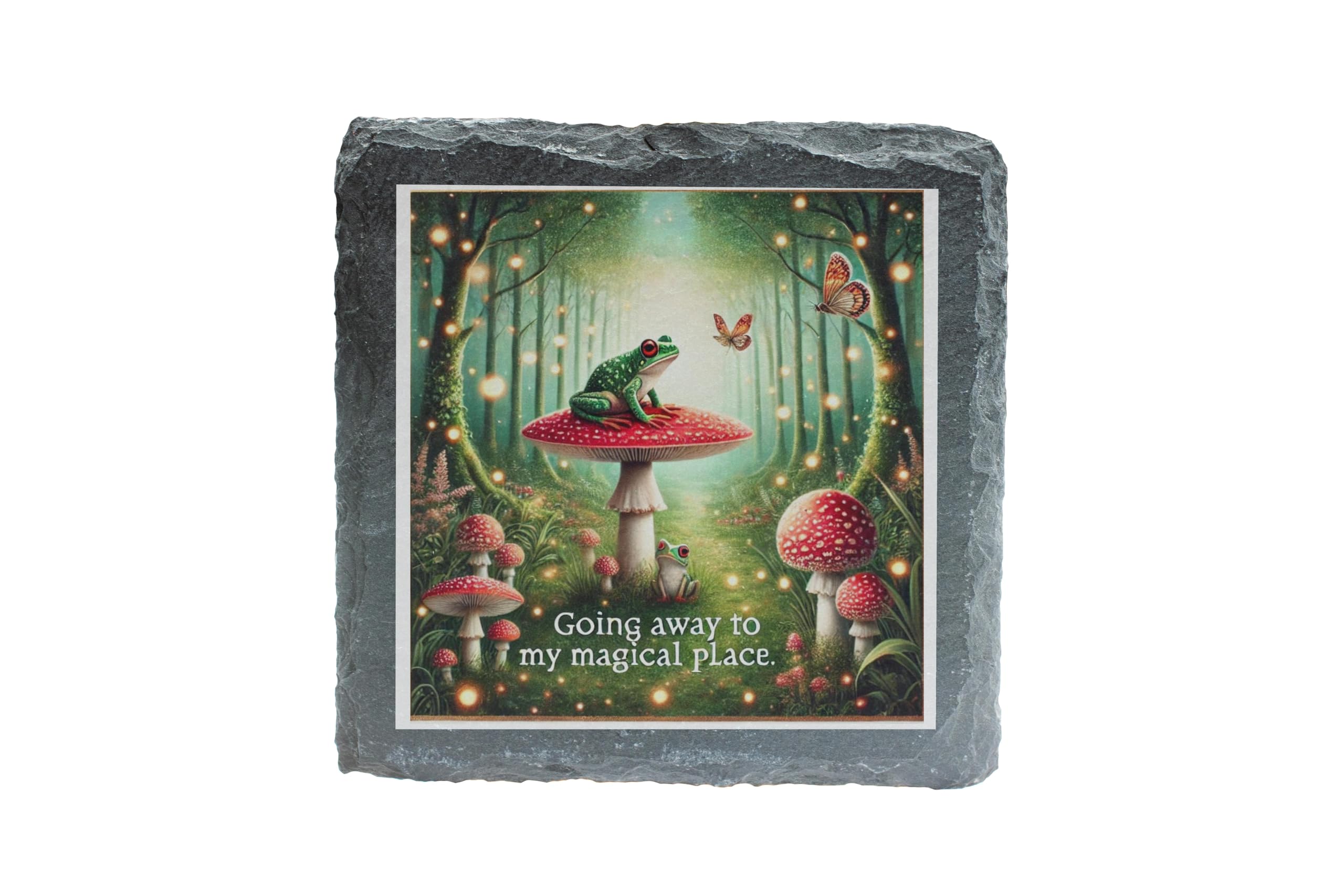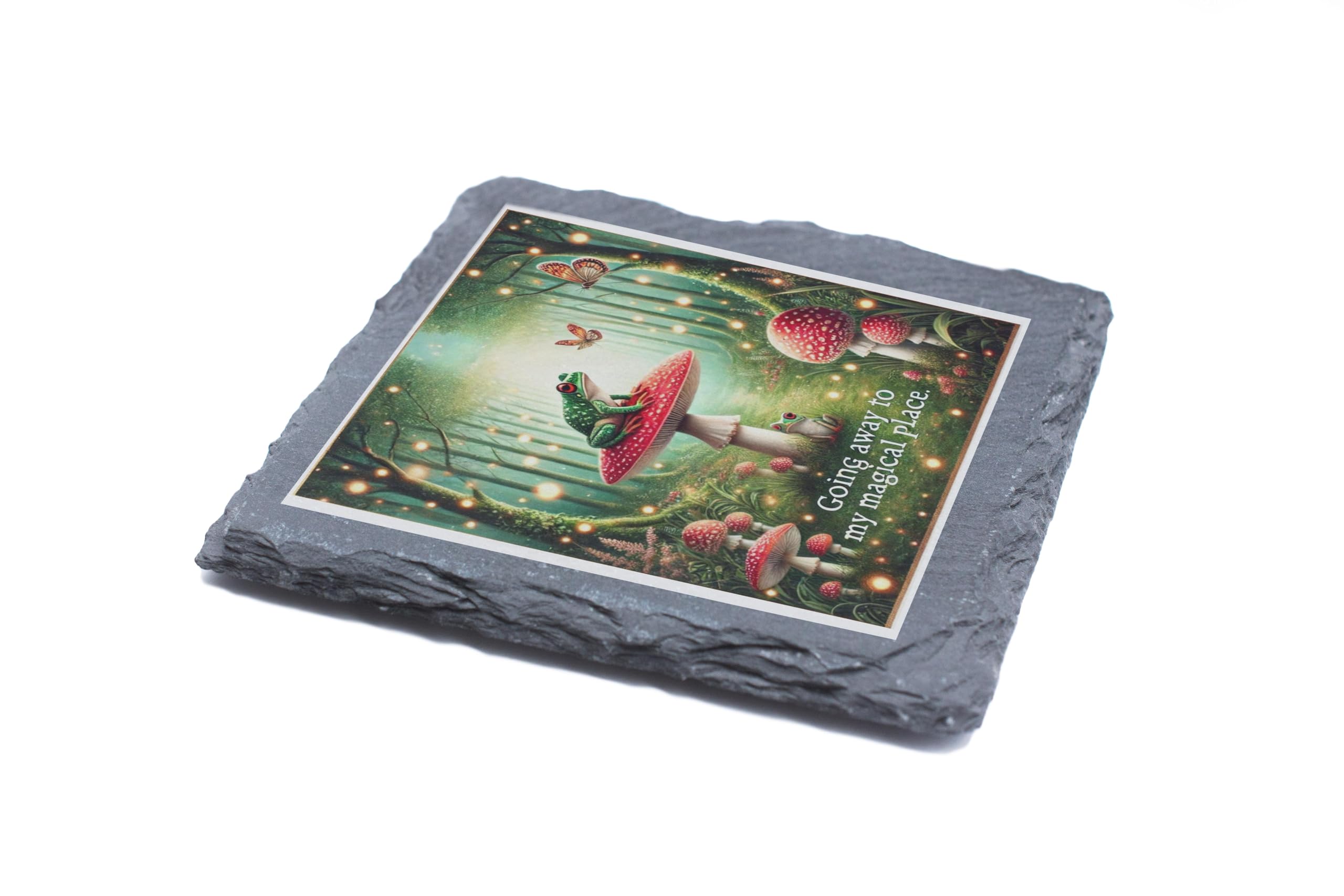 Step into a world of magic and wonder with the "Enchanted Forest Frog" Slate Coaster. This beautifully illustrated coaster transports you to a mystical fairyland where a vibrant green frog sits atop a red-capped toadstool, surrounded by glowing fireflies and forest enchantment. Crafted from high-quality natural slate, this coaster blends functionality with artistic charm. The rugged, natural edges add a rustic elegance, making it an ideal addition to any coffee table, desk, or reading nook. Its anti-slip backing ensures stability, while its protective design prevents spills from damaging your surfaces. Perfect as a gift for fairy tale lovers, whimsical dreamers, or anyone who appreciates the magic of nature, this coaster adds a delightful touch of fantasy to your home decor.