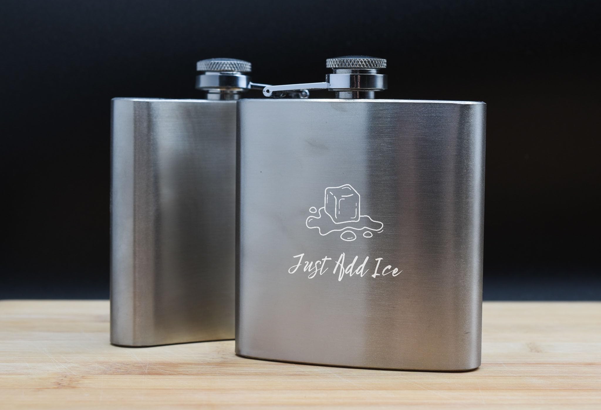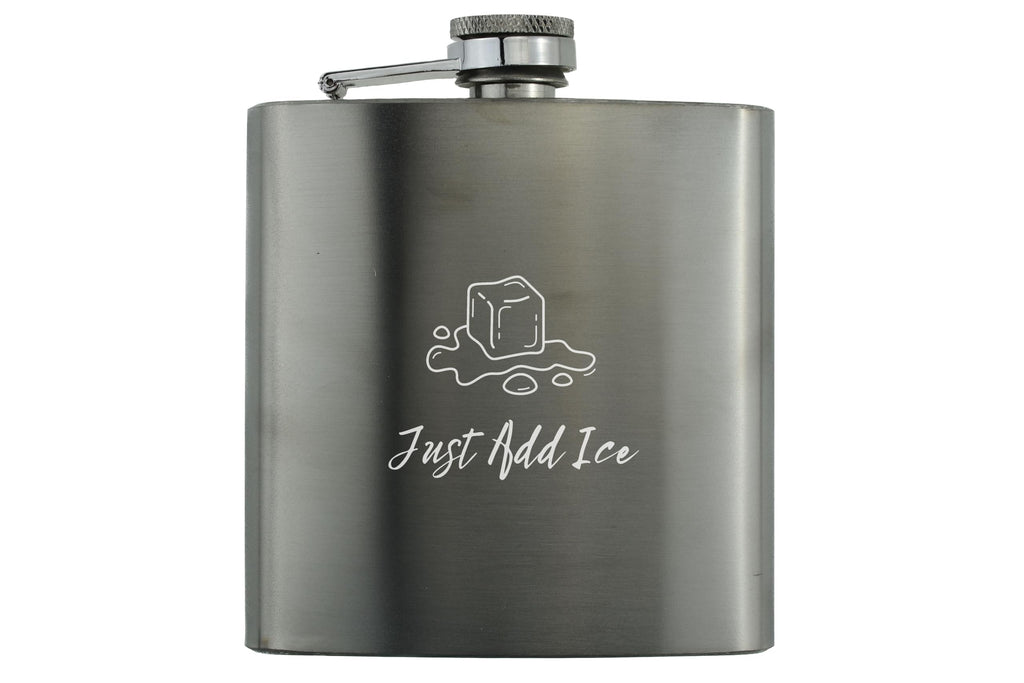 Introducing our Engraved Stainless Steel Travel Flask with Ice Design, the perfect portable metal hip liquor flask for all your on-the-go beverage needs. This novelty gift flask features a unique quote 'Just Add Ice' that adds a touch of humour to your drink time. Made from quality stainless steel, this flask is durable and built to last. The ice design is UV printed in full colour, making it stand out from the crowd. Whether you're carrying whiskey, rum, or any other favourite liquor, this flask with cap is the ideal choice. Treat yourself or give it as a gift to a friend - this engraved flask is sure to be a hit!