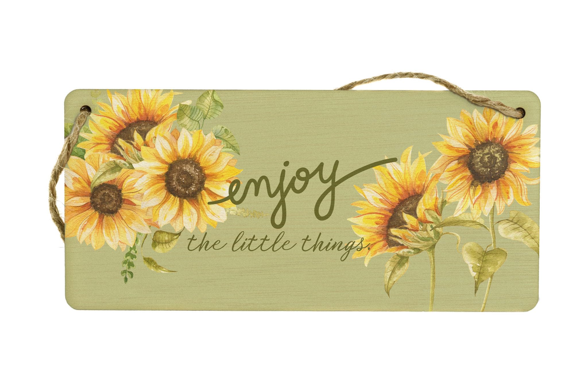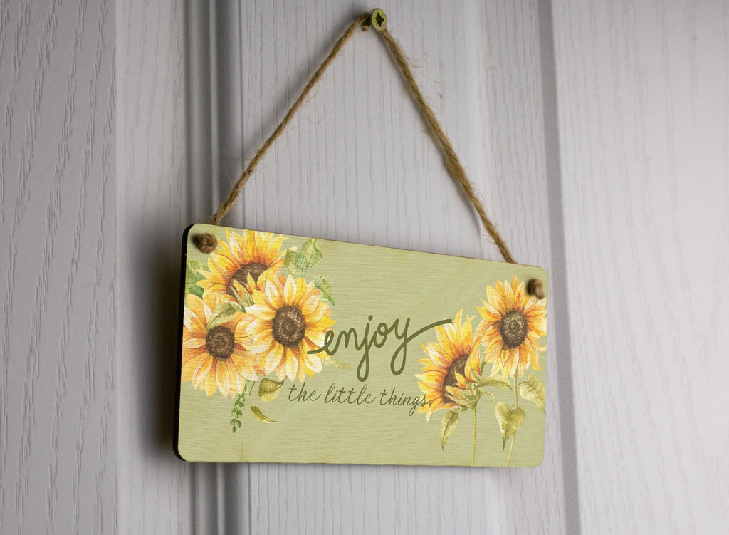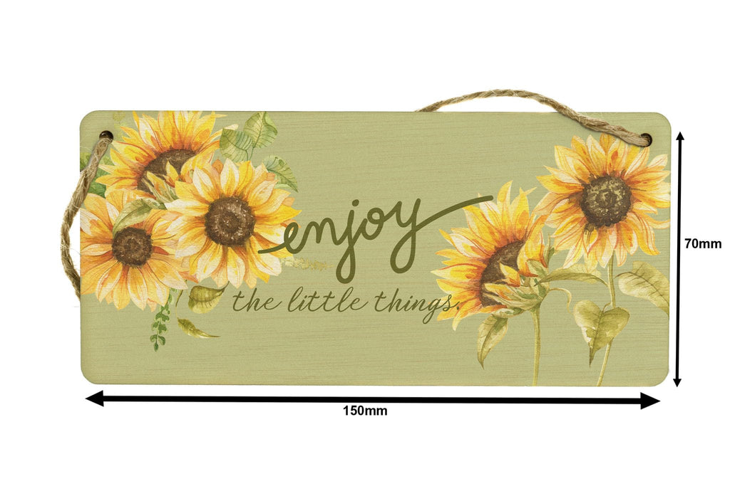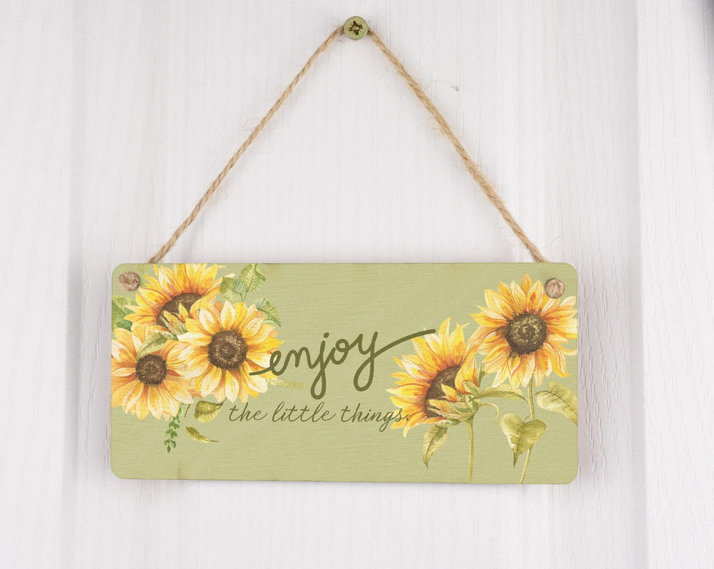 Introducing our Warm Family & Friends Plywood Hanging Sign, a perfect addition to your home d?cor. This charming room sign features a loveable sunflower theme with the phrase 'Enjoy the Little Things'. The sign is made from quality plywood and comes with a durable hanging mechanism, making it easy to display in any room. The full colour design with a vibrant green background and images of sunflowers will add a cheerful touch to your living space. Whether you're looking for a thoughtful gift for your family and friends or want to spruce up your own home, this hanging sign is sure to bring positivity and joy.