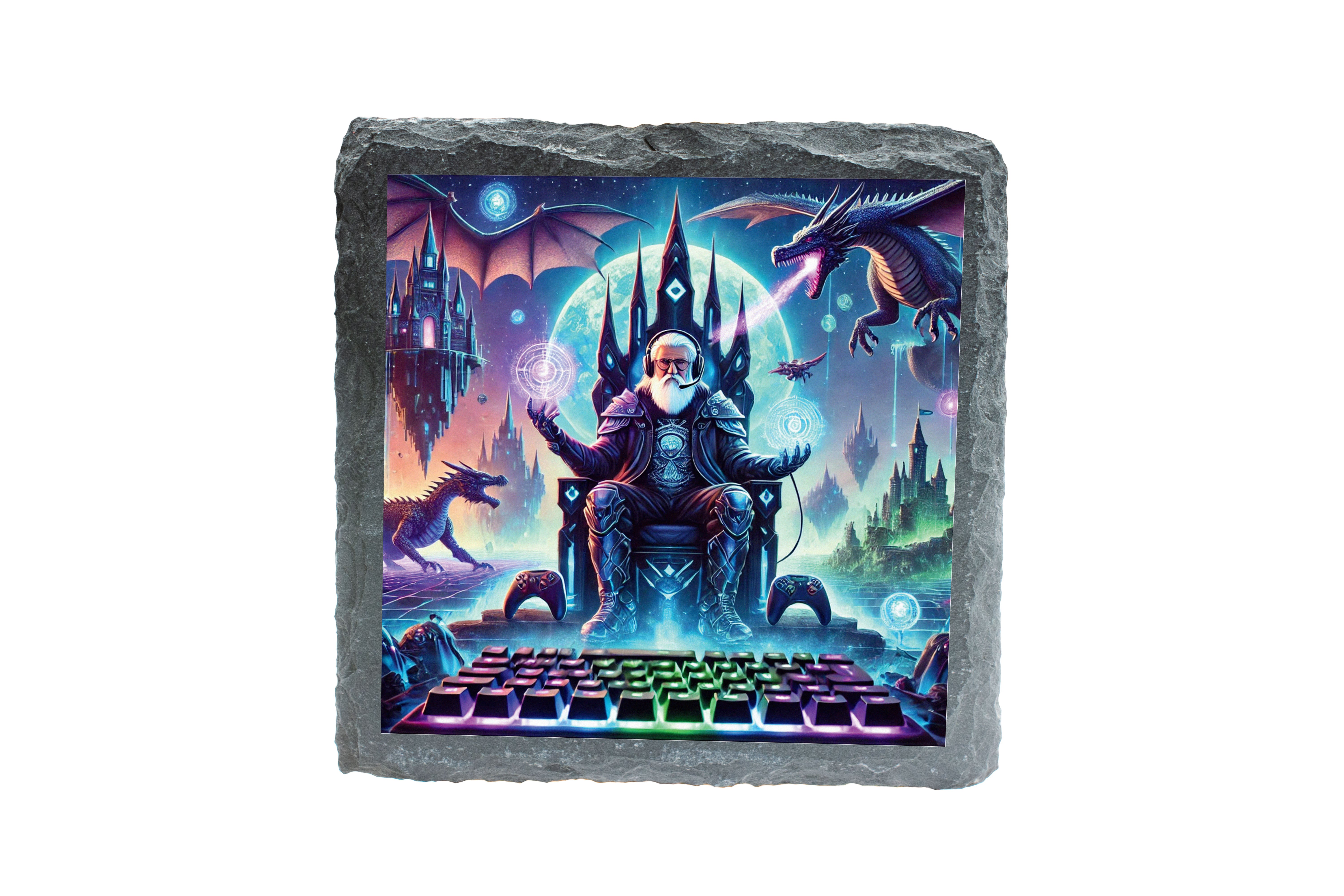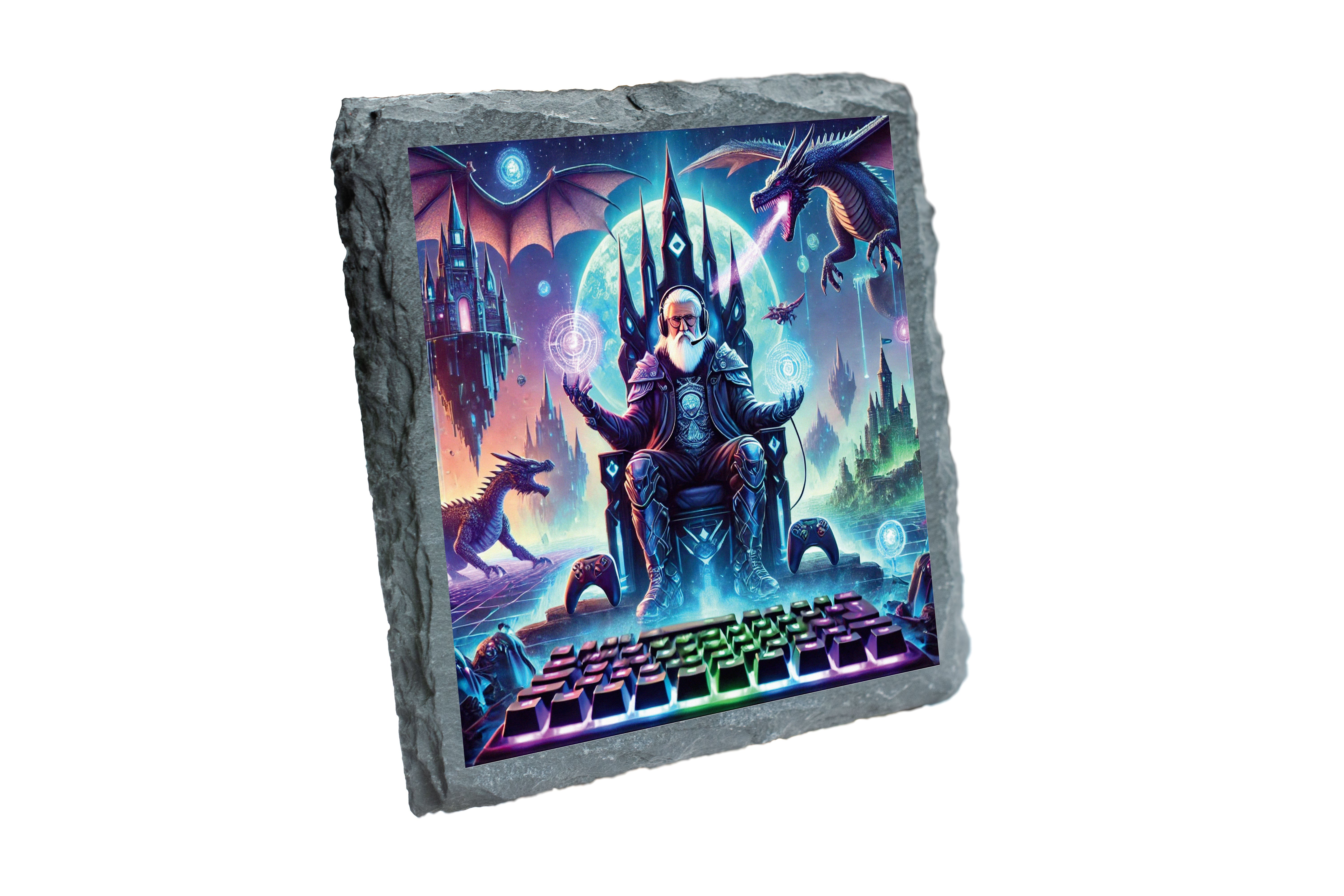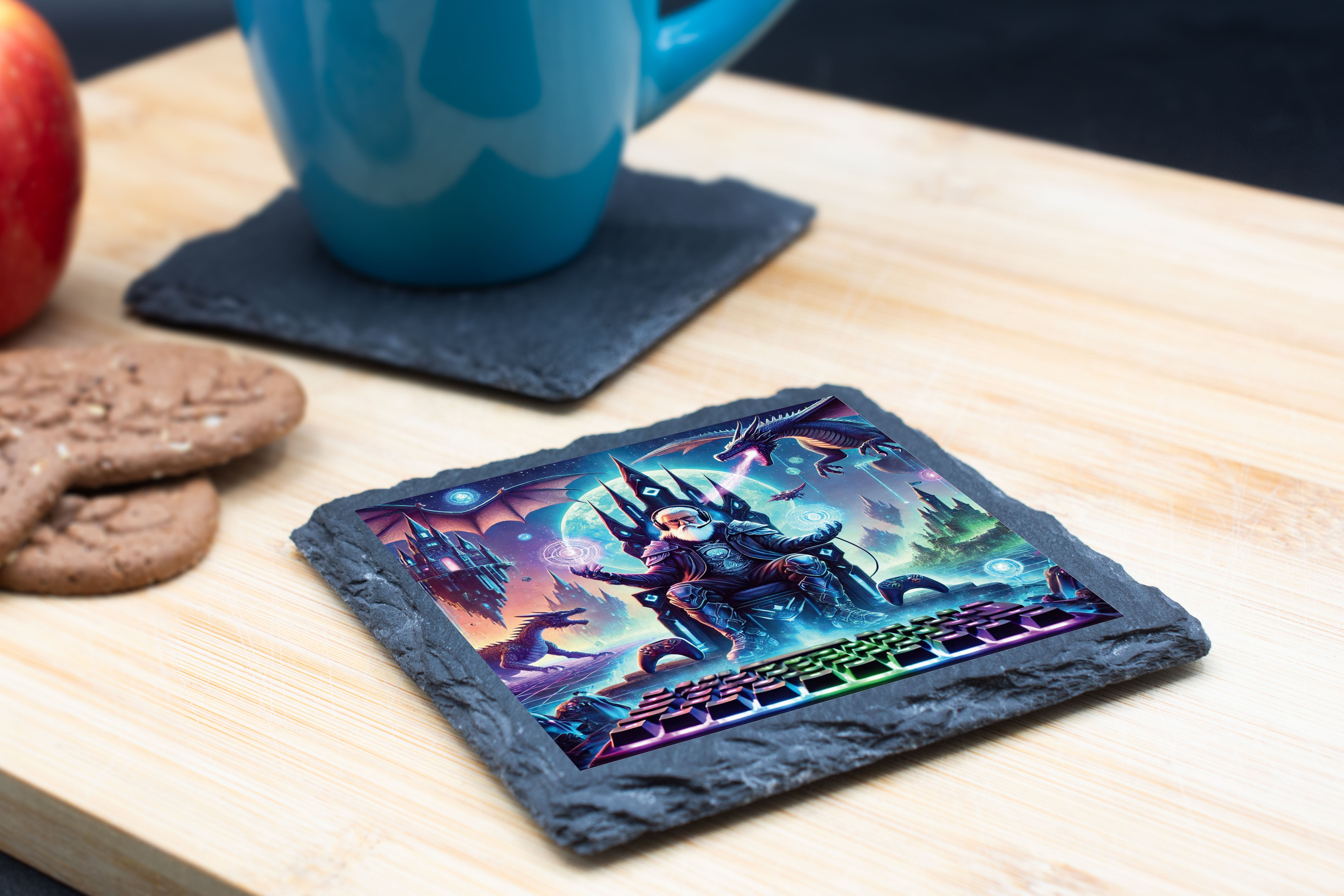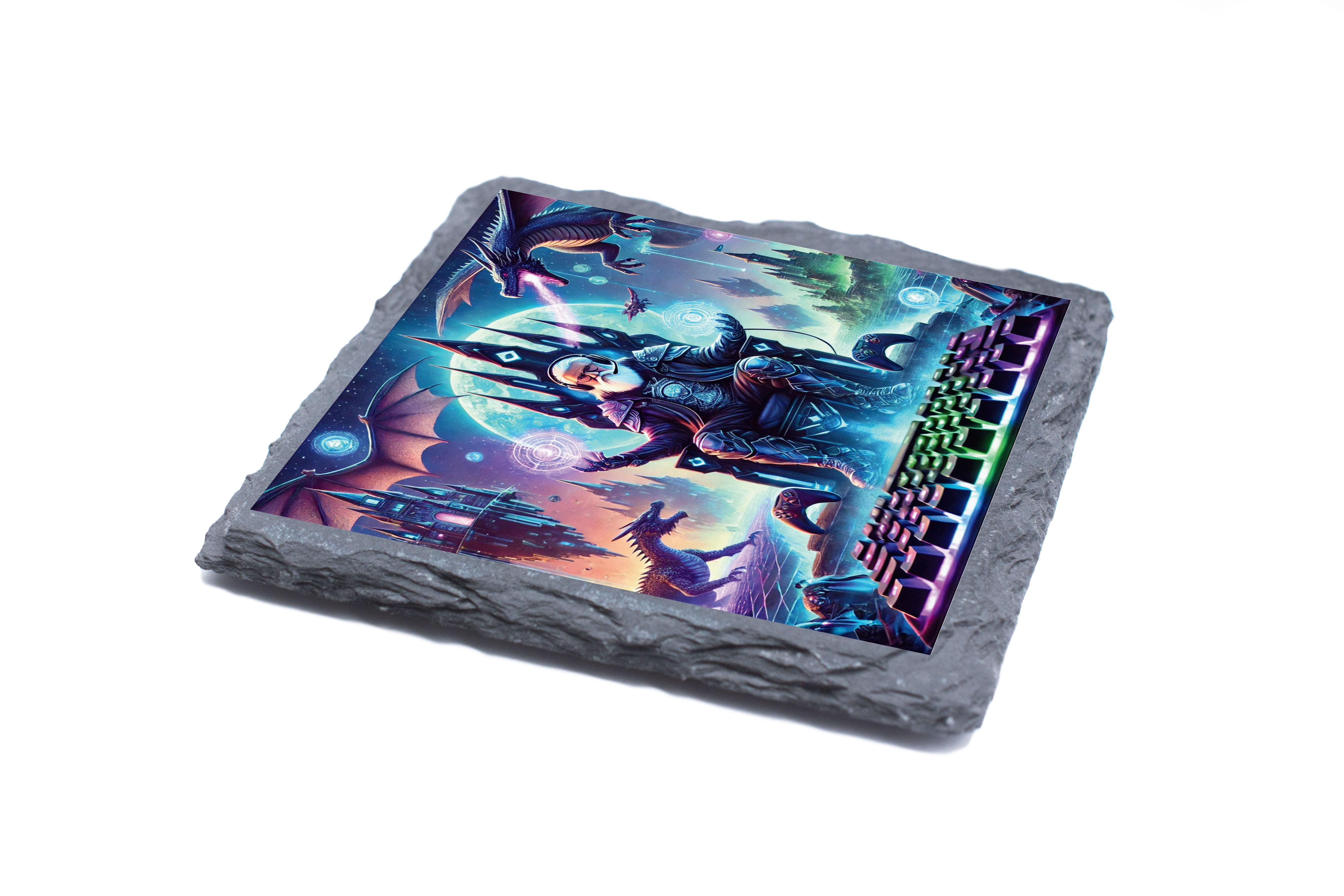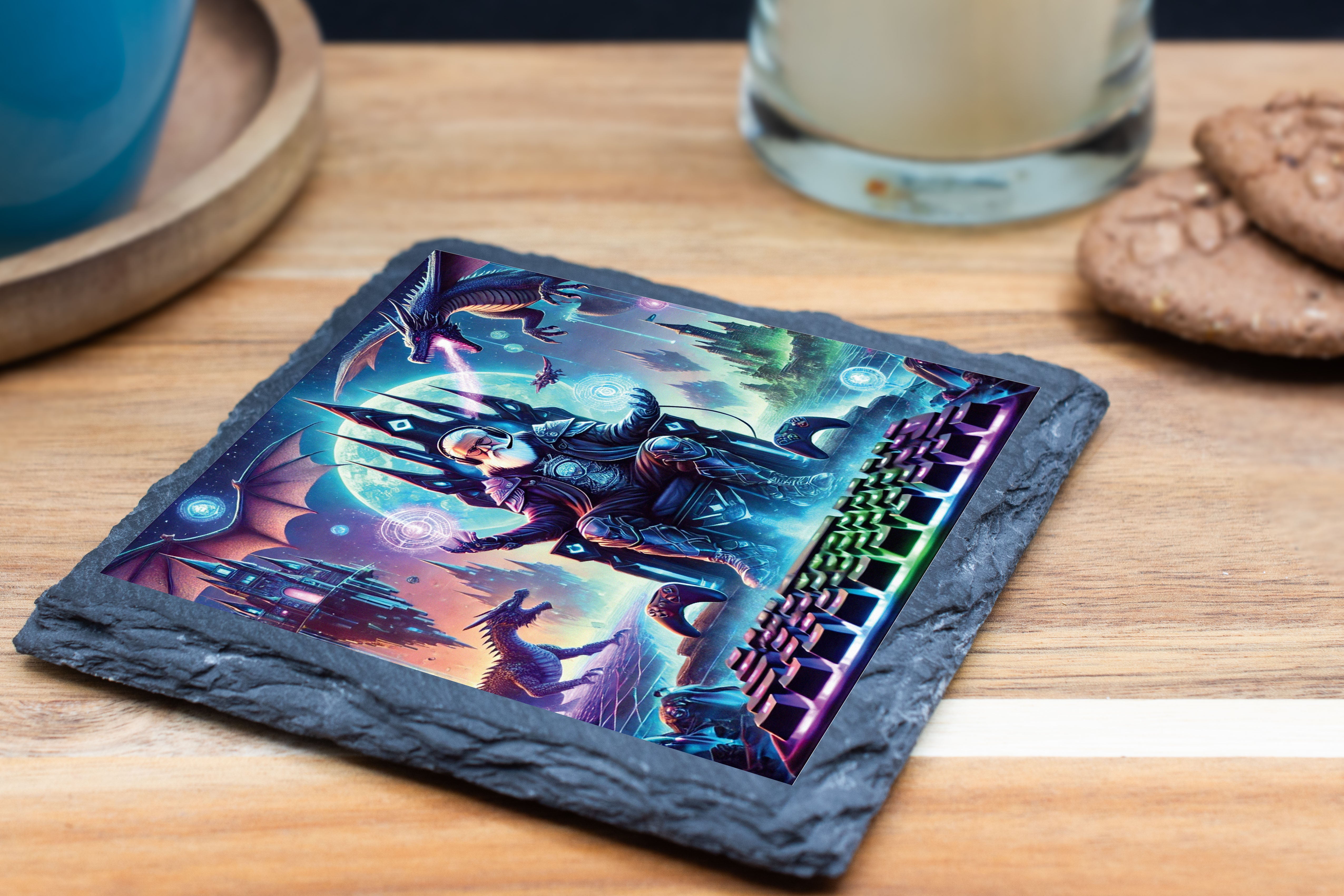 Transform your tabletop with this captivating slate coaster featuring a mesmerizing fantasy scene of a wizard commanding dragons in a mystical realm. Made from high-quality slate, this coaster is not only a stunning decorative piece but also highly durable and heat resistant, perfect for protecting your surfaces from hot beverages. The vivid colors and intricate details make it an ideal gift for fantasy lovers and an eye-catching addition to any room.