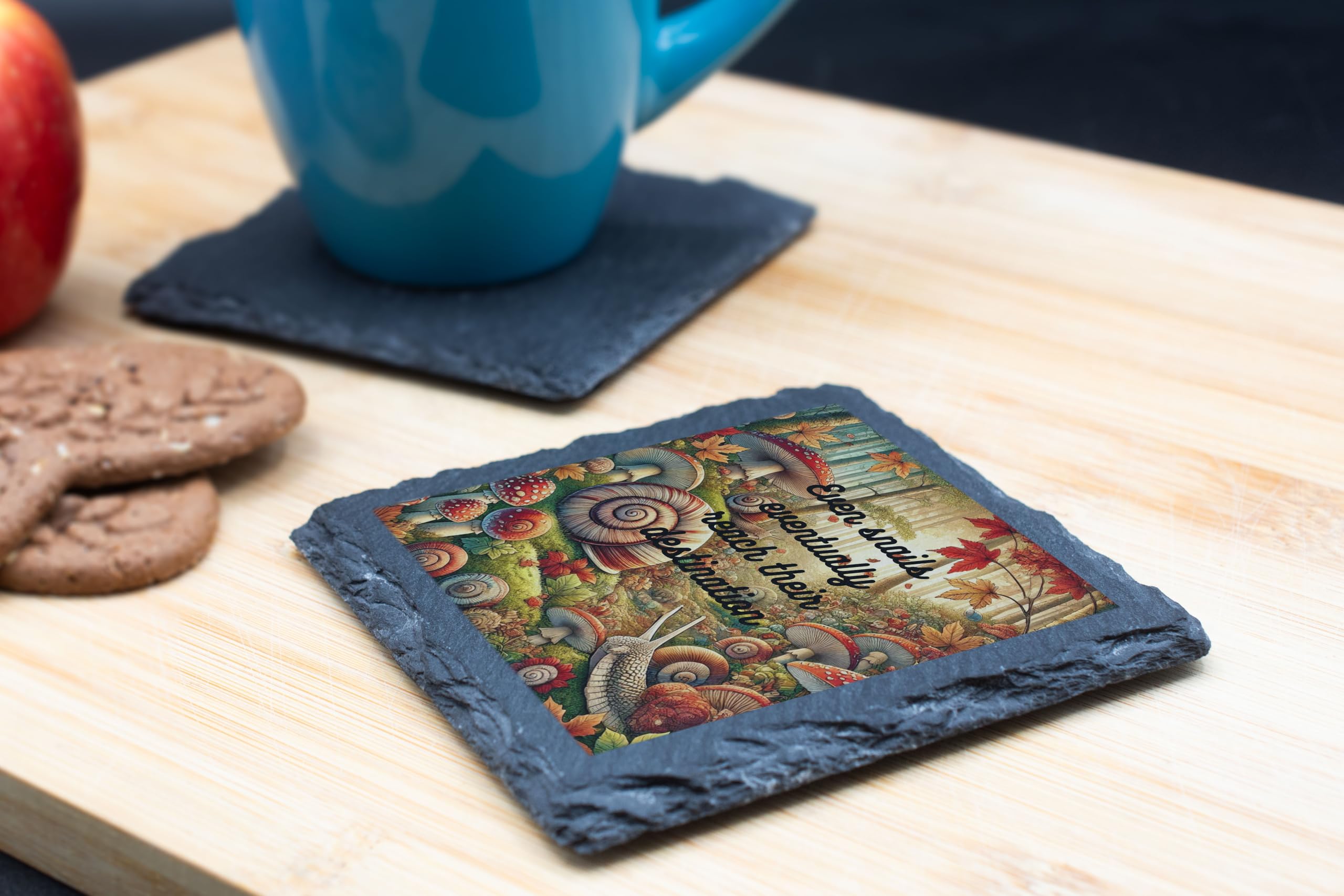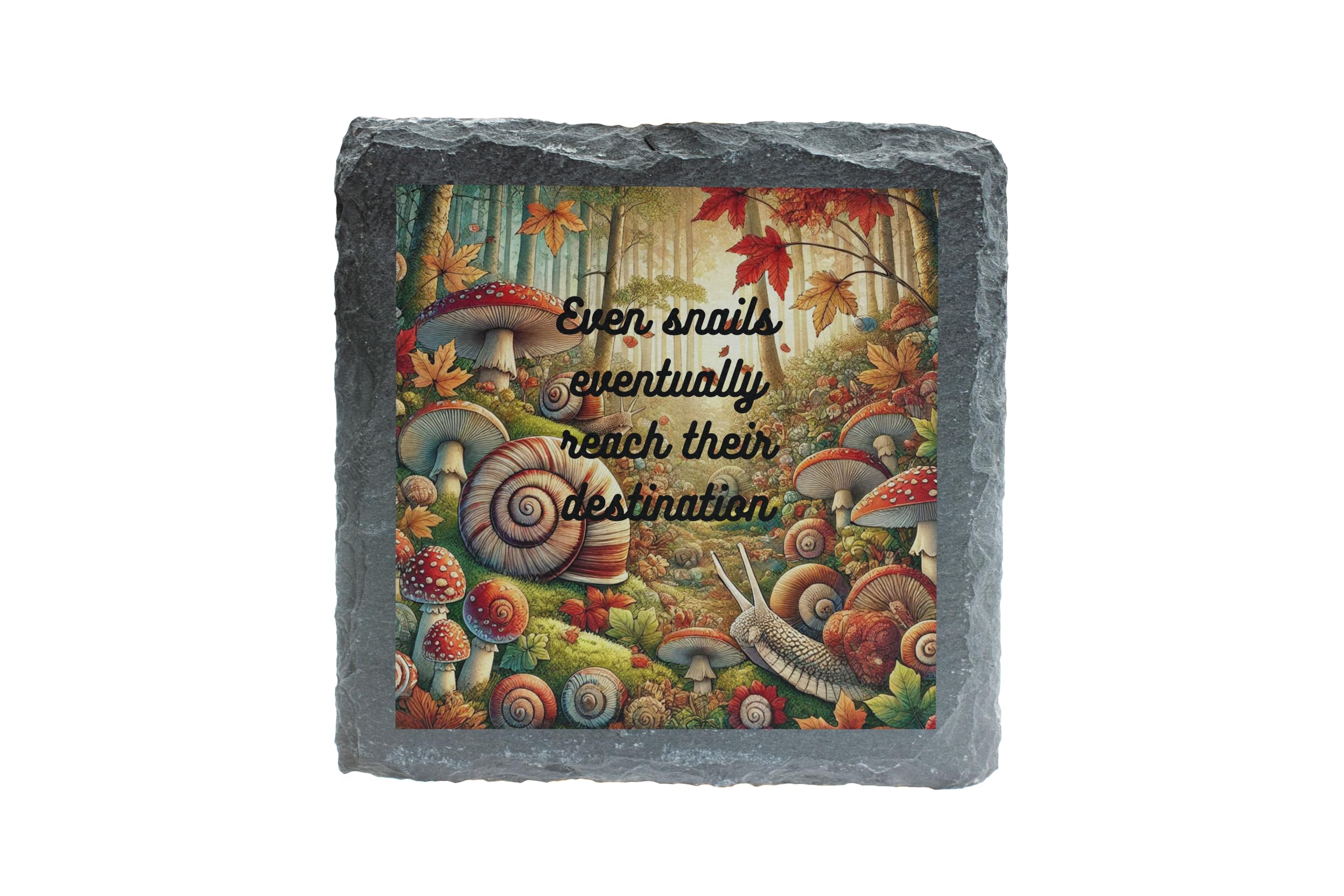 Find inspiration in the journey, no matter how slow it may seem. The "Even Snails Eventually Reach Their Destination" Slate Coaster beautifully combines motivational wisdom with enchanting autumn-themed artwork. Featuring charming snails and a lush forest backdrop of mushrooms and falling leaves, this coaster adds a rustic yet whimsical touch to any home or office. Made from premium natural slate, it?s not only a decorative piece but also practical for protecting surfaces from scratches and moisture. Whether you're looking for a unique gift or a daily reminder of resilience, this coaster is a perfect choice to uplift and decorate your space.