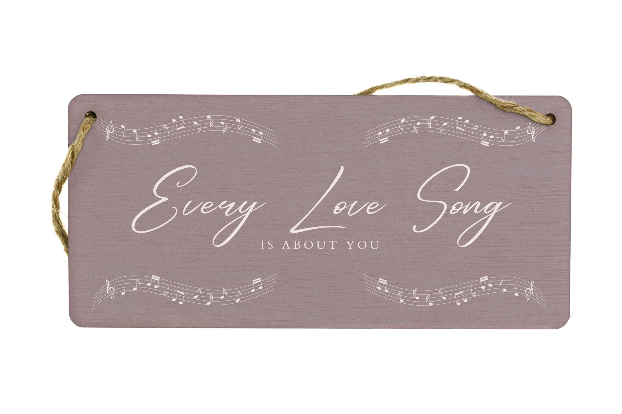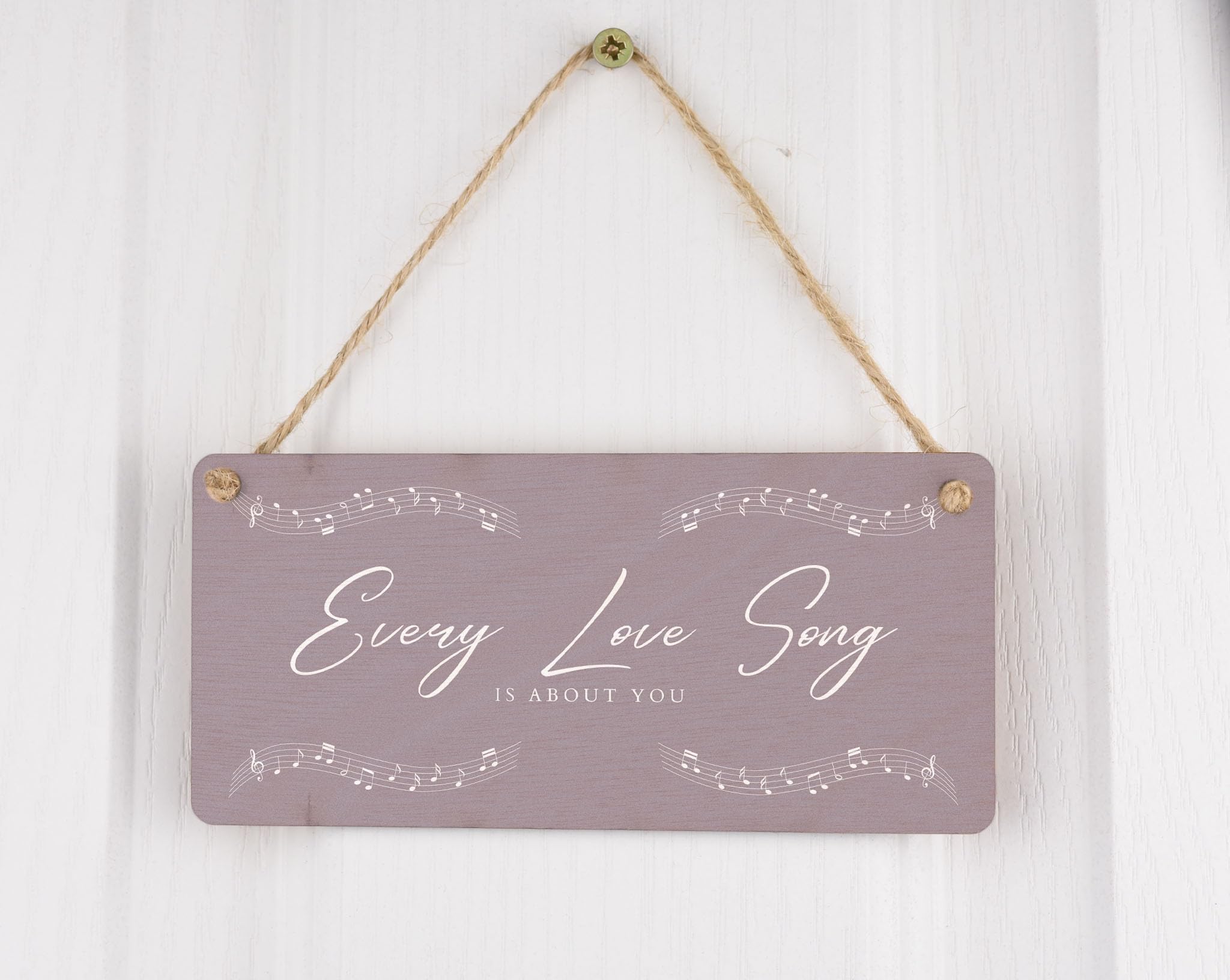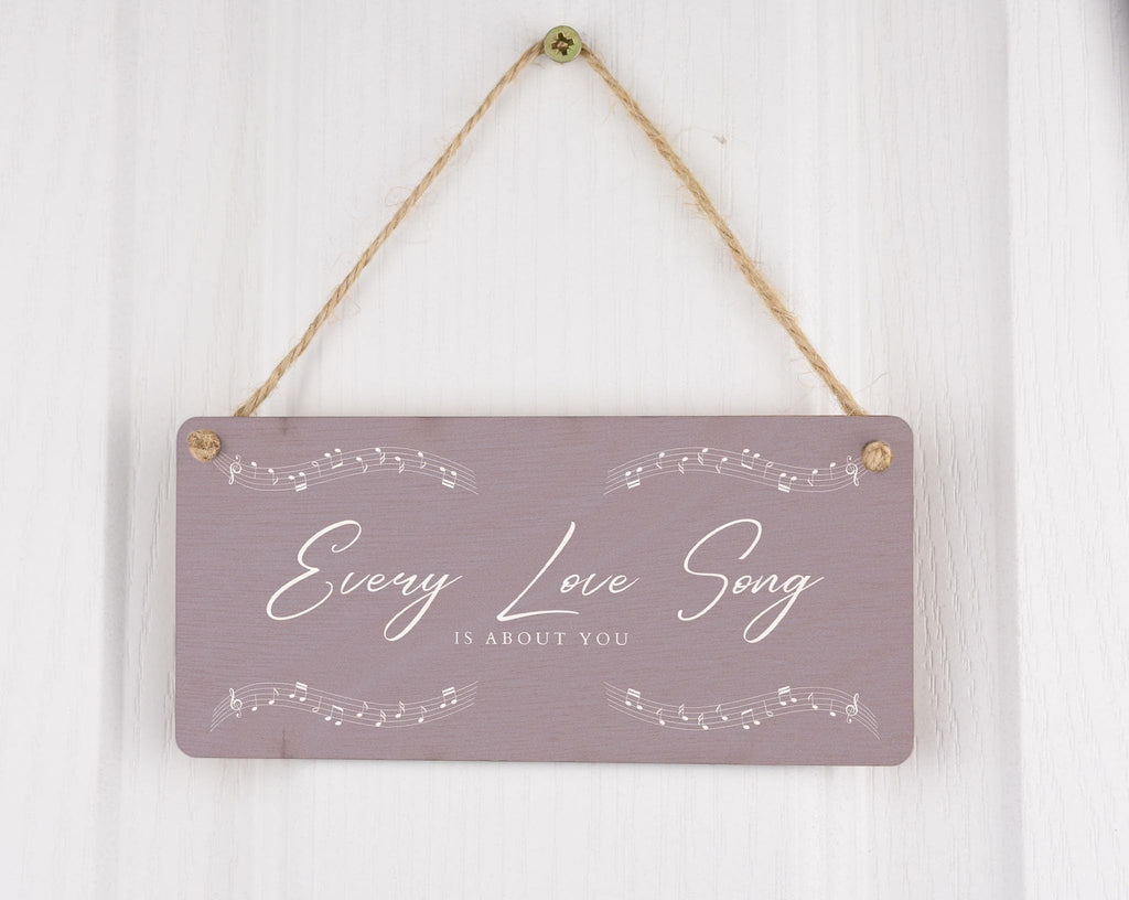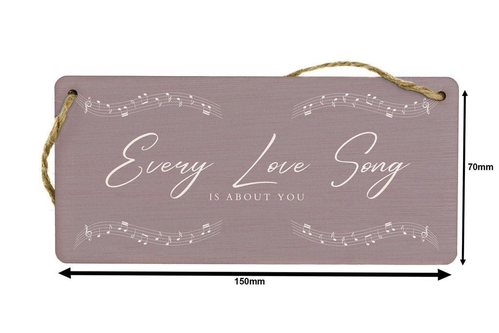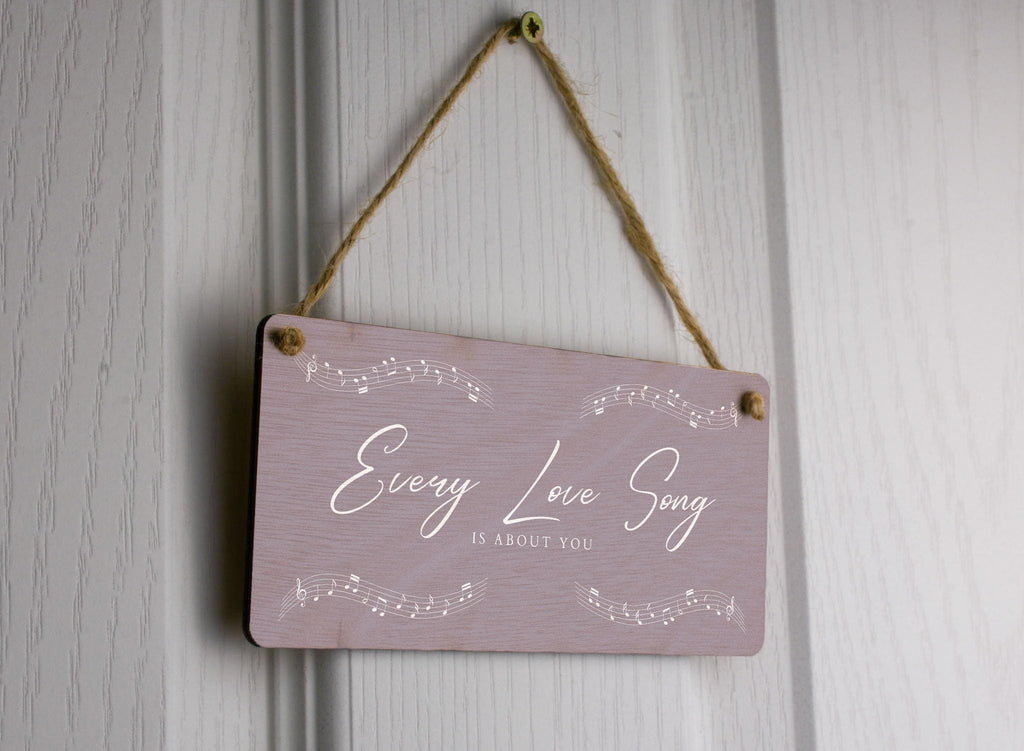 Add a touch of romance to your home with this beautiful Every Love Song is About You Plywood Hanging Room Sign. This gorgeous sign is the perfect gift for your wife, husband, girlfriend, or boyfriend. The full colour design features delicate music notes and white writing on a light grey background, creating a stunning visual display that will complement any room in your home. Hang it in your living room, bedroom, or hallway to remind your loved one that every love song is about them. This romantic sign is a unique and thoughtful way to express your love and appreciation for that special someone in your life.