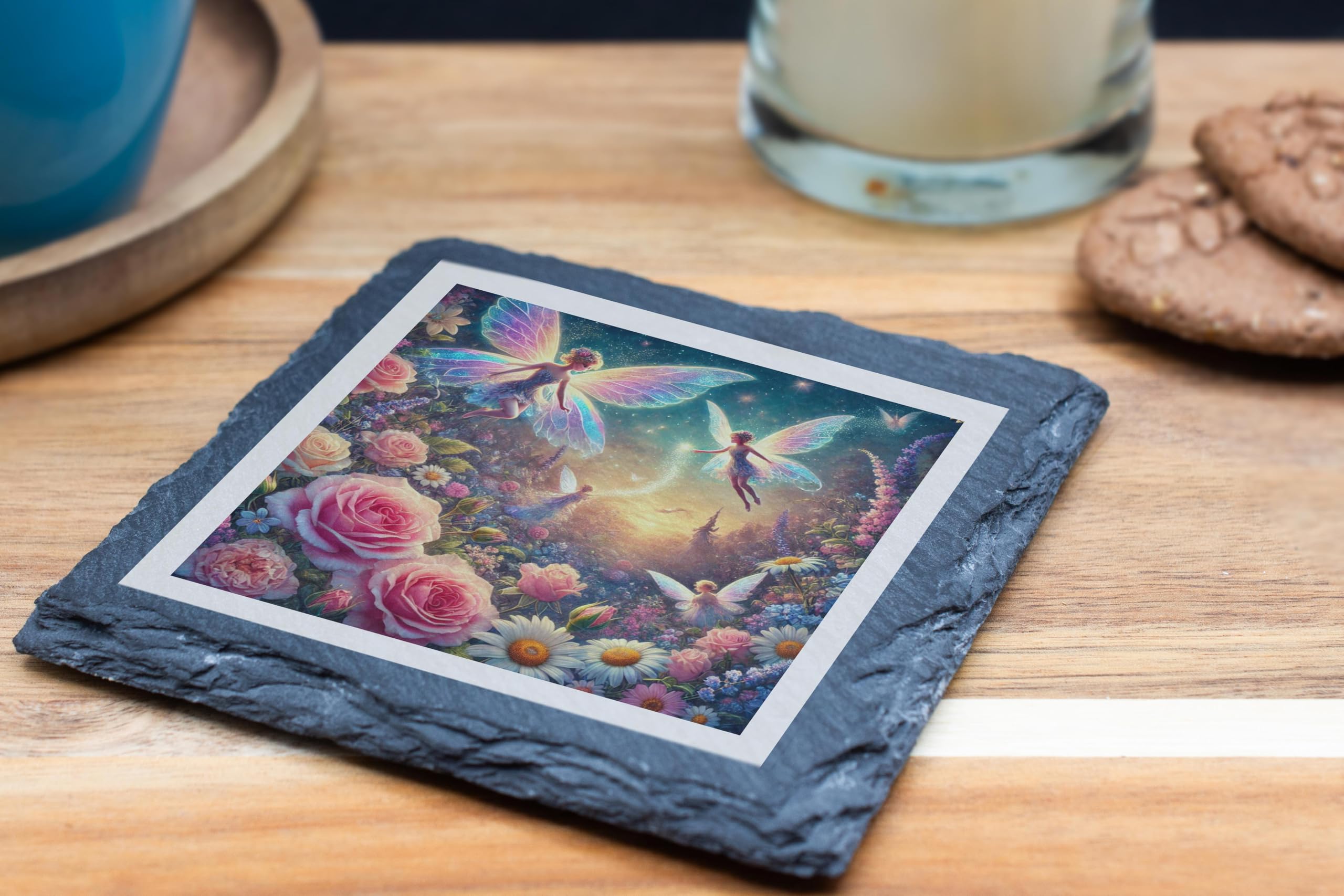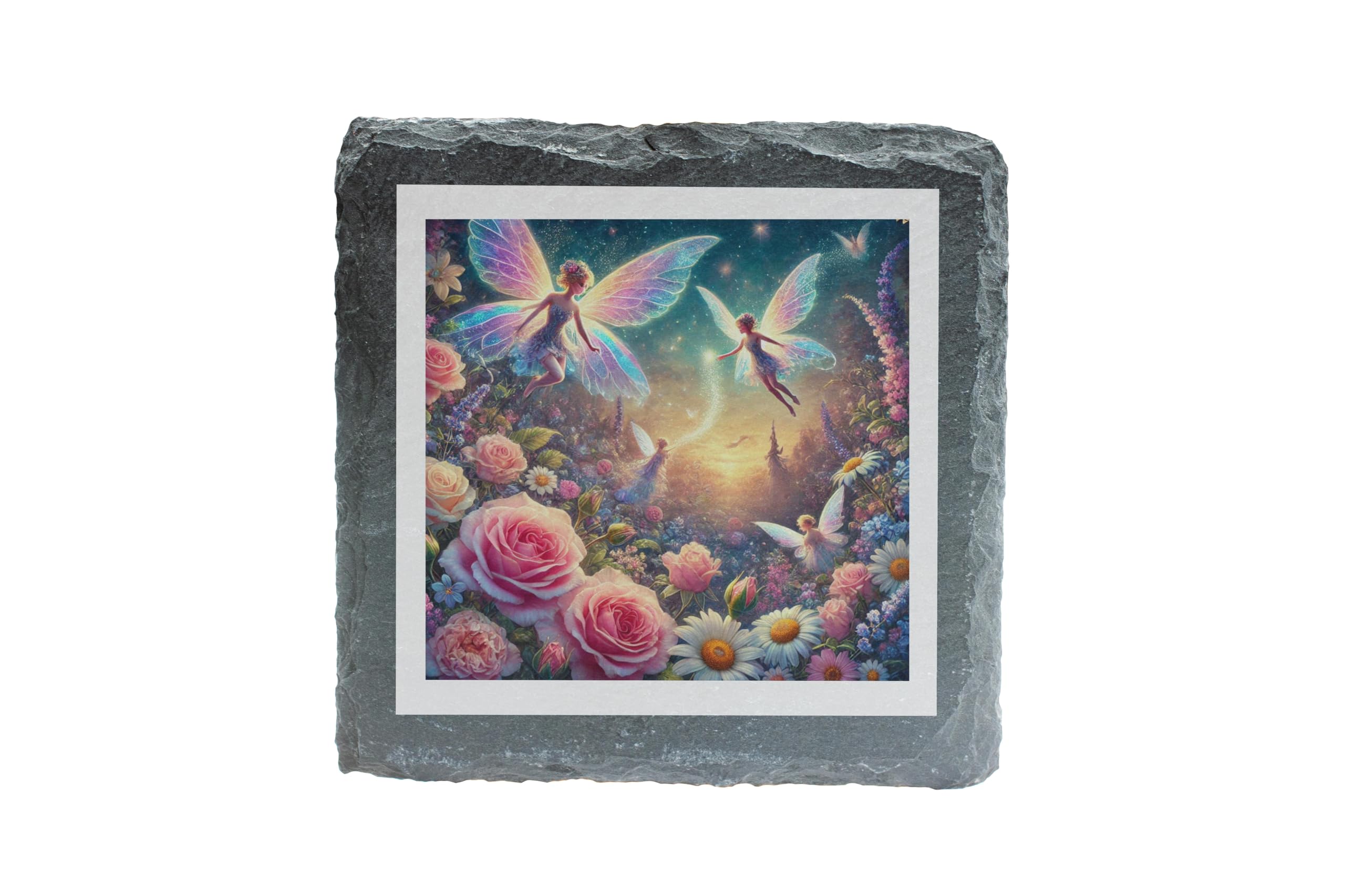 Step into a world of enchantment with the Fairy Flower Garden Slate Coaster. This exquisite design showcases a delightful fantasy scene with radiant fairies fluttering amidst a vibrant garden of roses, daisies, and glowing foliage. The detailed artwork exudes a sense of wonder and is sure to captivate the hearts of fairy and fantasy lovers alike. Made from sturdy natural slate, this coaster is not only functional but also a charming decor piece. Its rugged edges and textured surface give it a rustic appeal, while the non-slip backing ensures your surfaces are protected with ease and style. Whether it's for a birthday, housewarming, or just a little magical gift for yourself, the Fairy Flower Garden Slate Coaster is a delightful addition to any space, combining practicality with fairy-tale elegance.